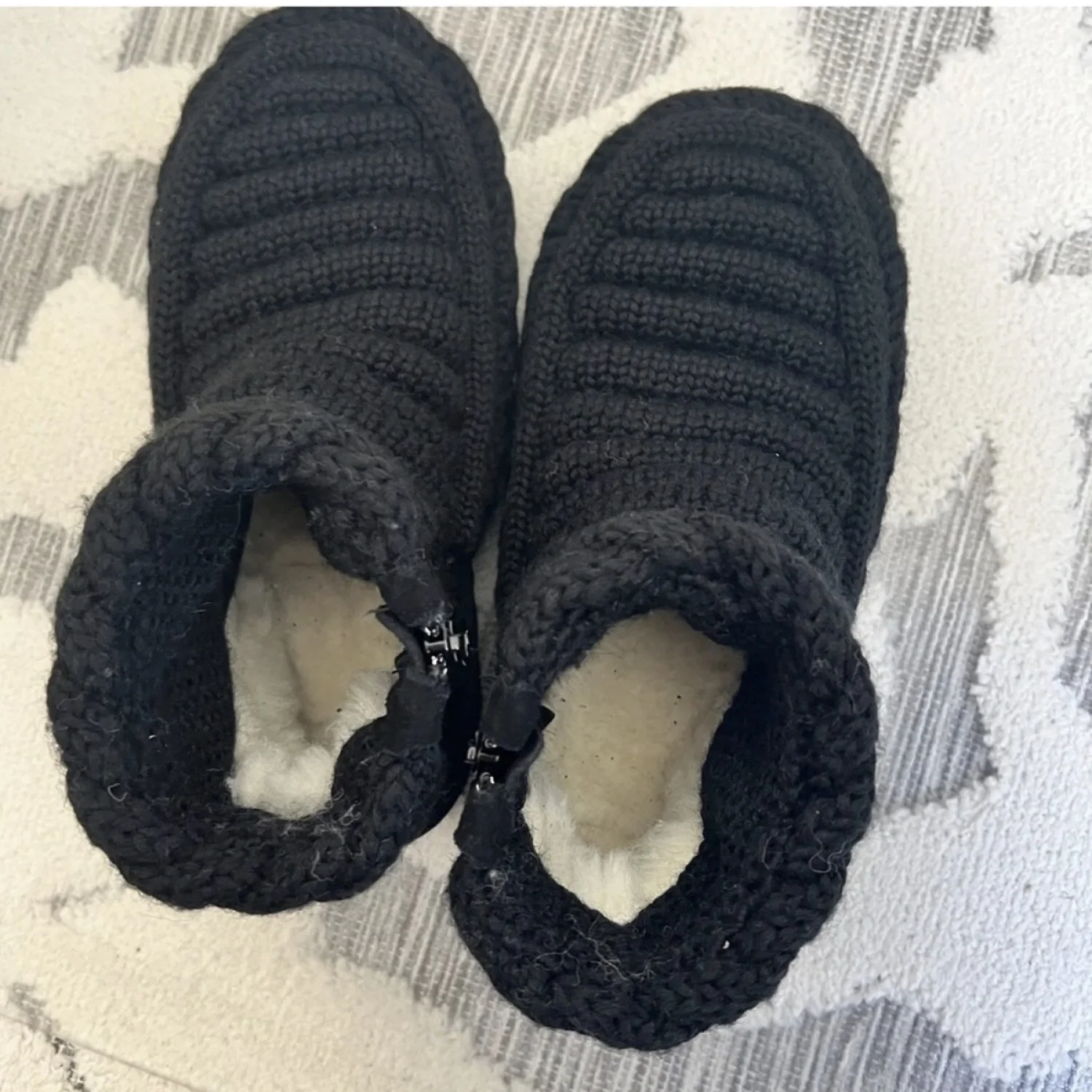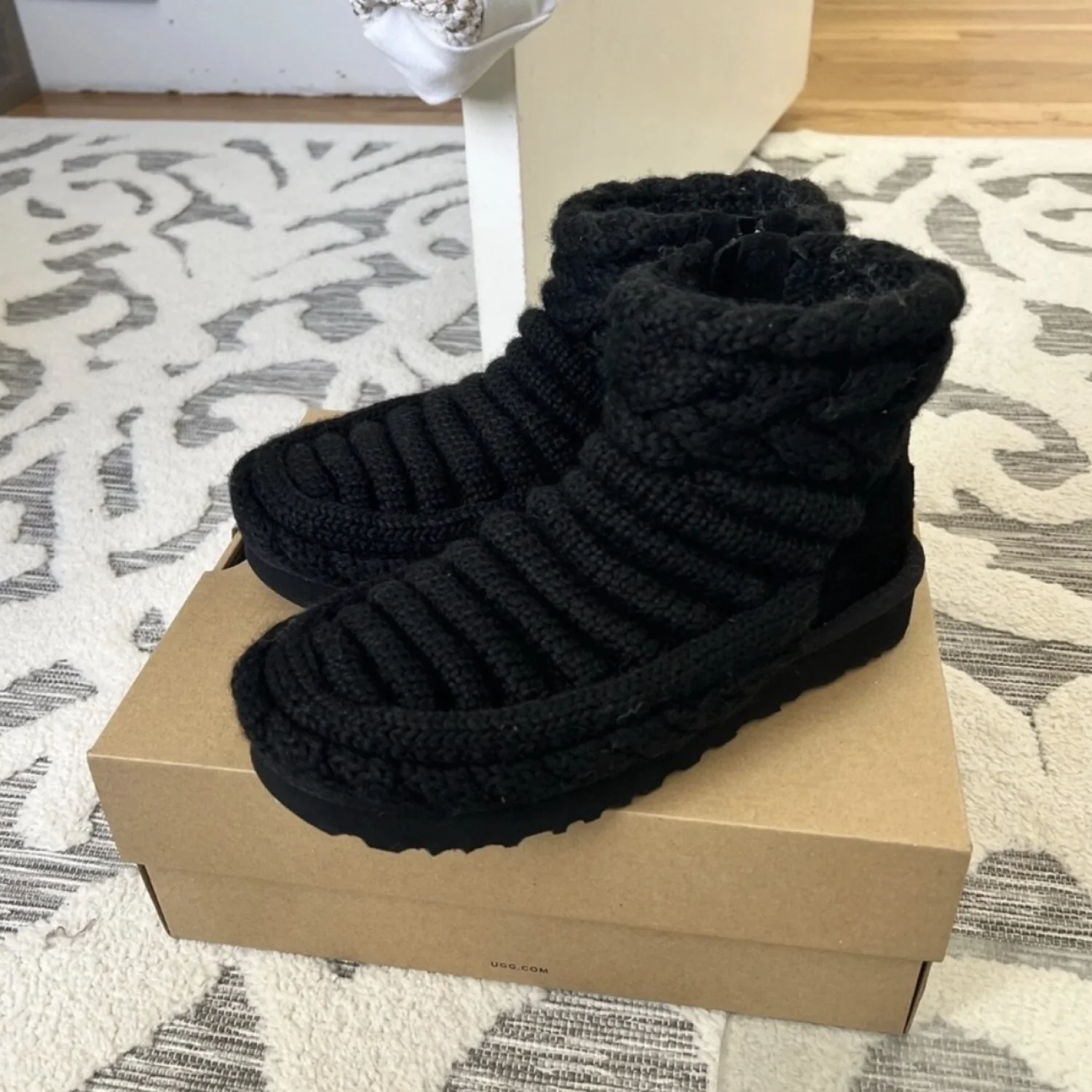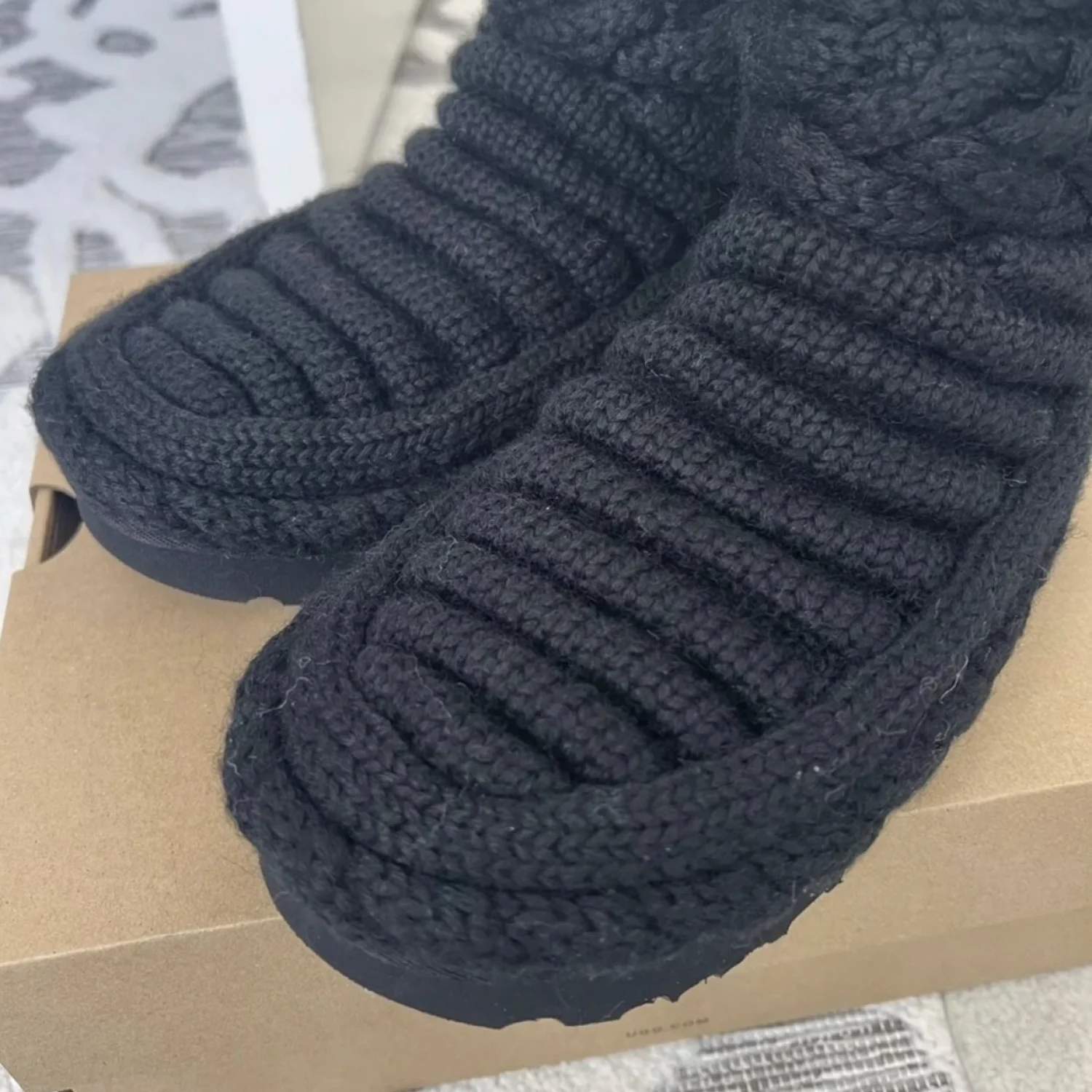 Brand new! A chunky knit bootie offers warmth and comfort with a nubby lining made from supersoft UGGplush. This fabric is a moisture-wicking textile made from a wool-rich blend but crafted to feel and wear like genuine shearling. 5" shaft Textile and leather upper/UGGplush wool-blend lining/synthetic sole