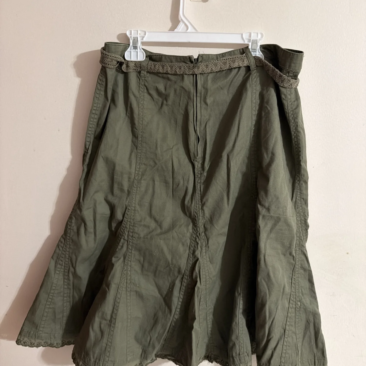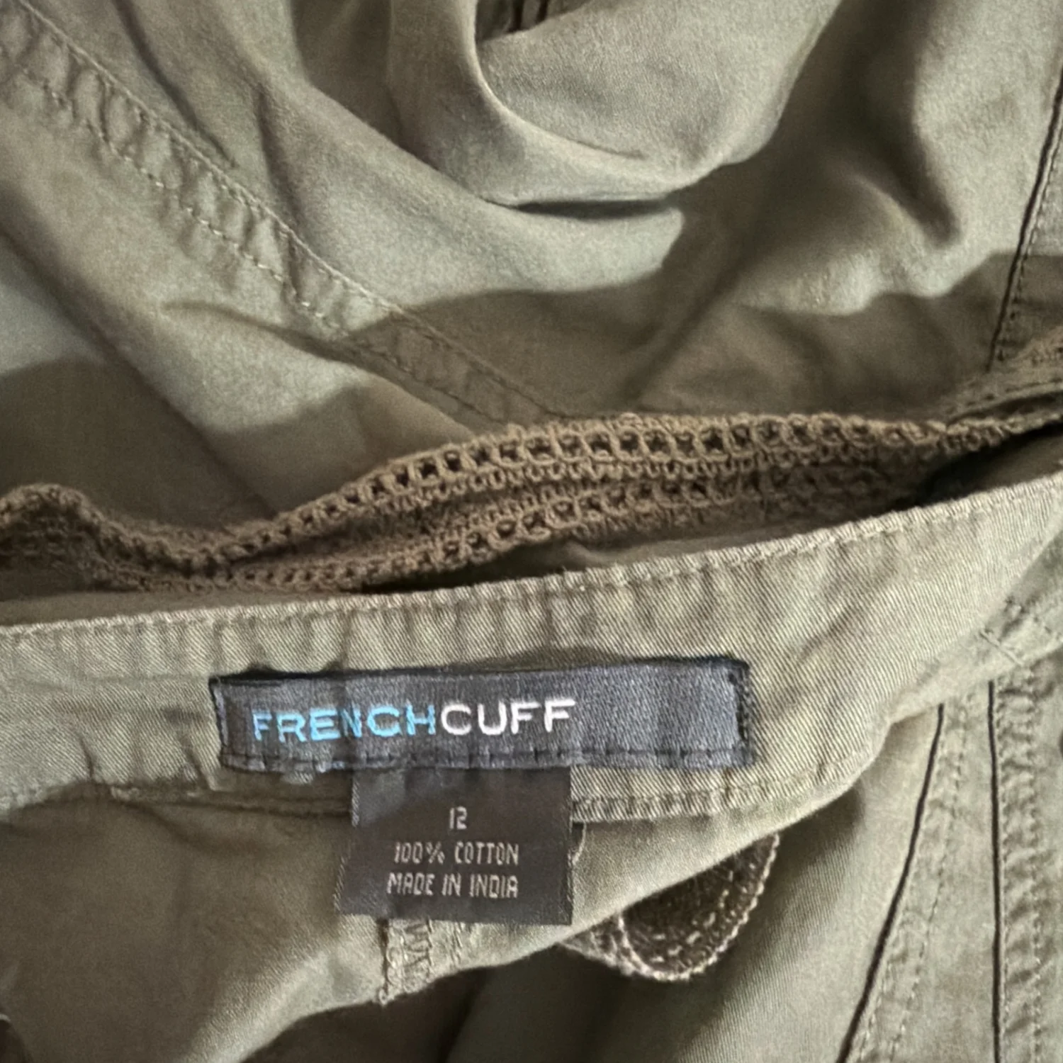 The Frenchcuff Skirt in size 12 made from cotton material in a green color, this midi-length skirt features a flattering flare style with a zip closure for easy wear. Perfect for casual occasions during the summer and spring seasons and machine washable.