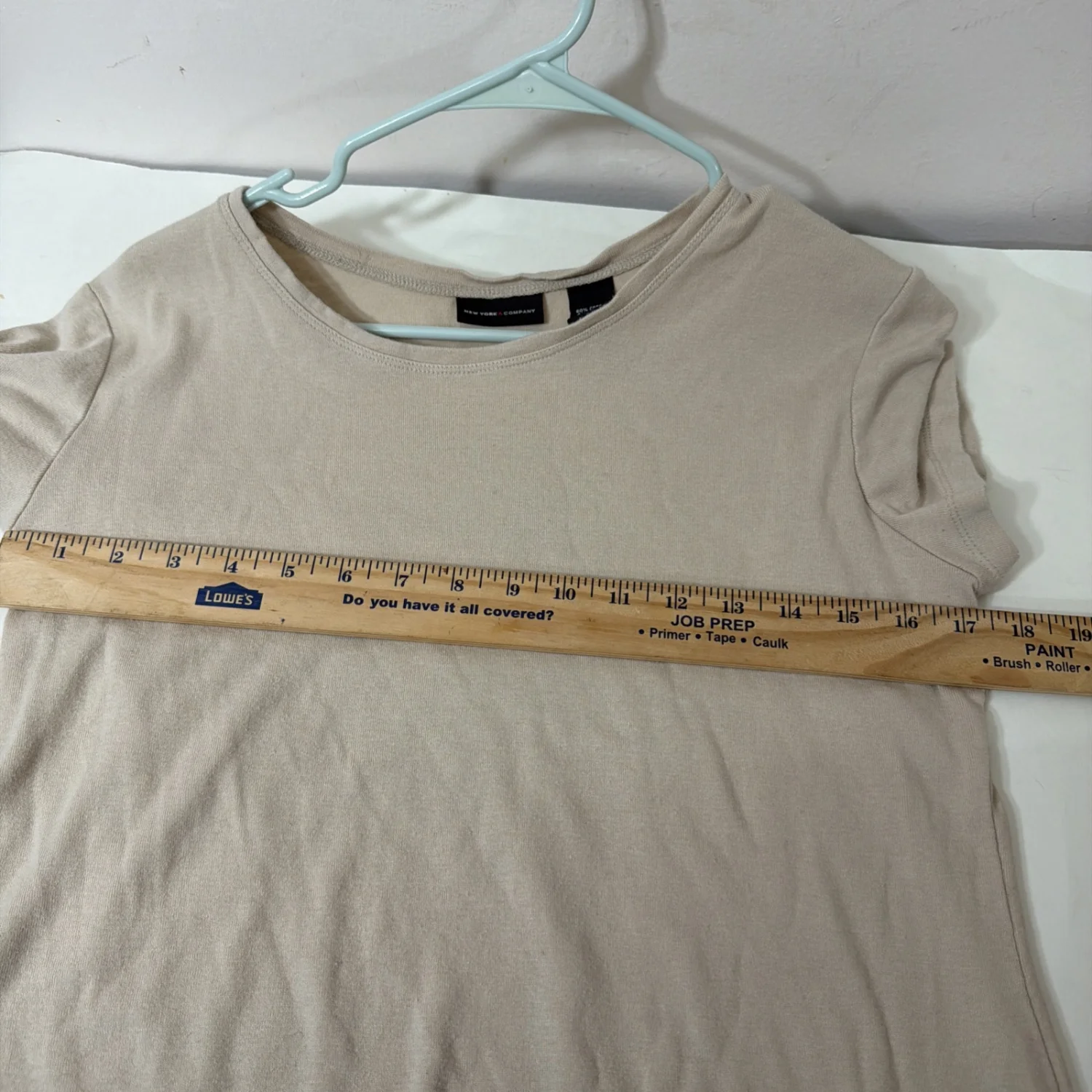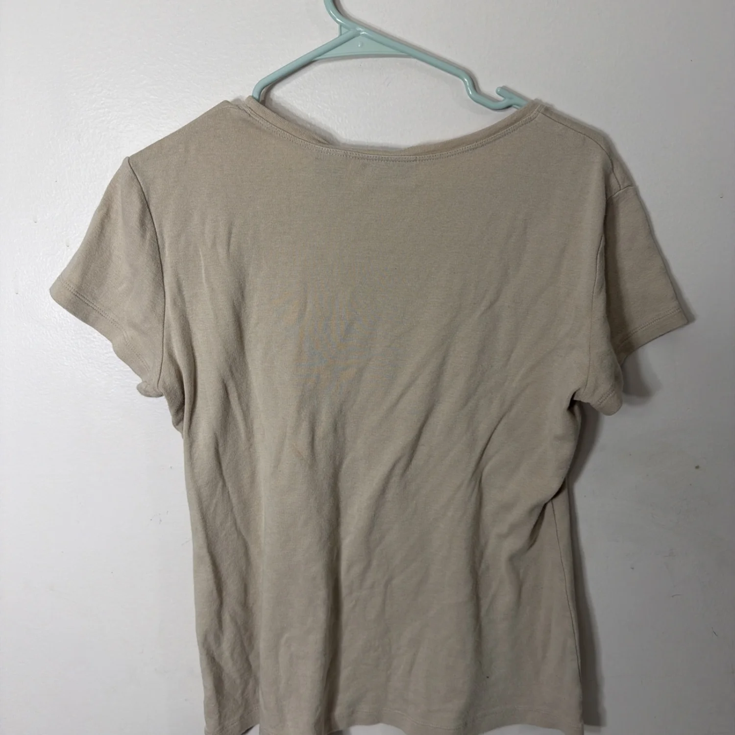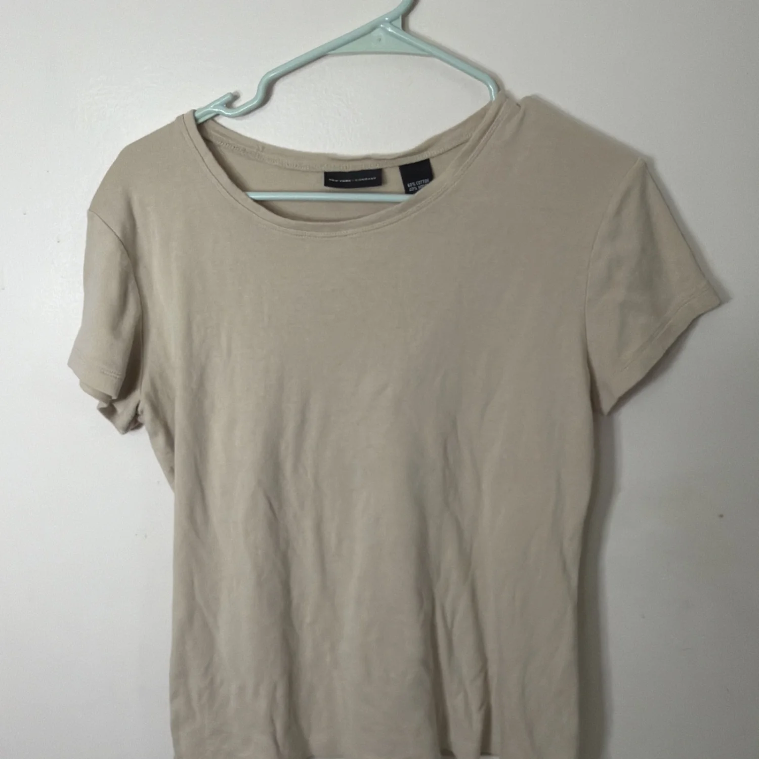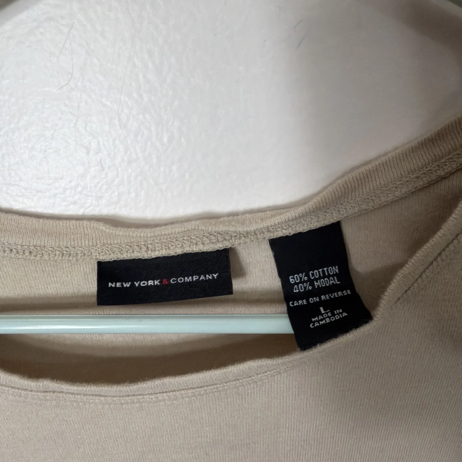 This New York & Company shirt is a beige cotton knit t-shirt with a solid pattern and short sleeves. The shirt is sized L, with a regular fit and stretch fabric for comfort.