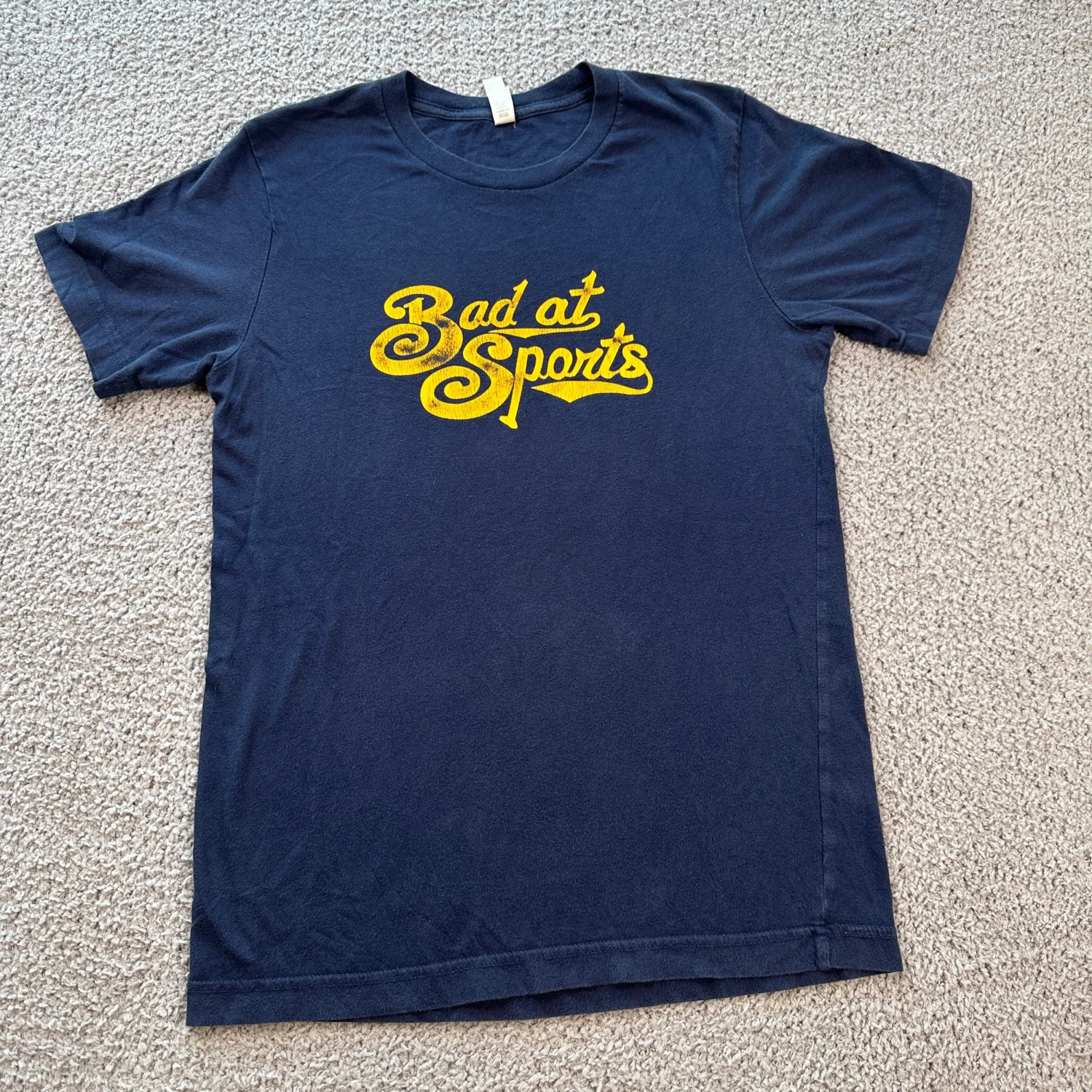 Funny “Bad at Sports” graphic tee in navy blue with yellow print. Super soft Bella + Canvas Canvas blank. Great casual everyday shirt and a fun statement piece. Size: Small (see measurements for best fit) Measurements: approx. 19” pit to pit, 26” length Condition: Good pre-owned condition with light wear. No major flaws noted. Shipping weight: 4 oz