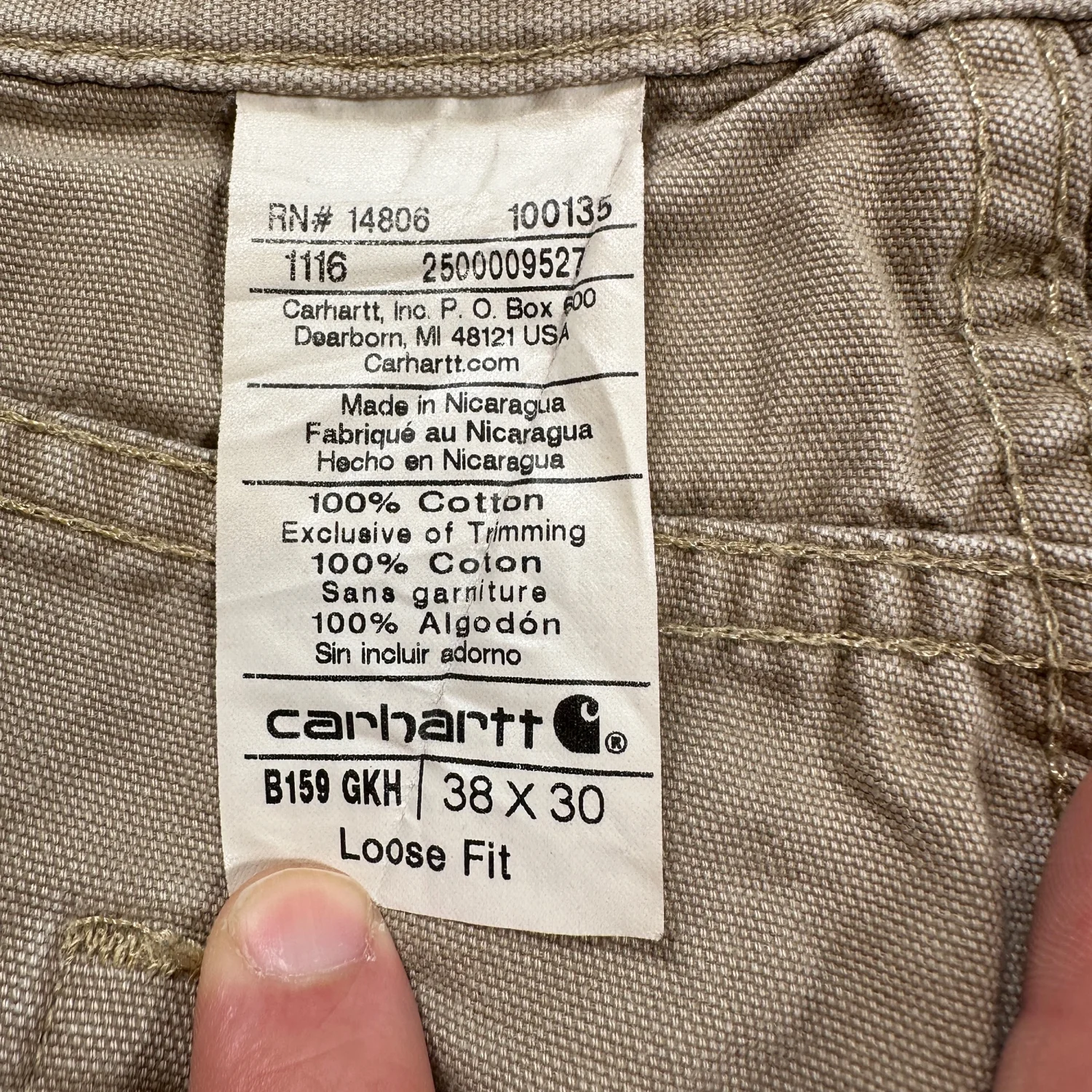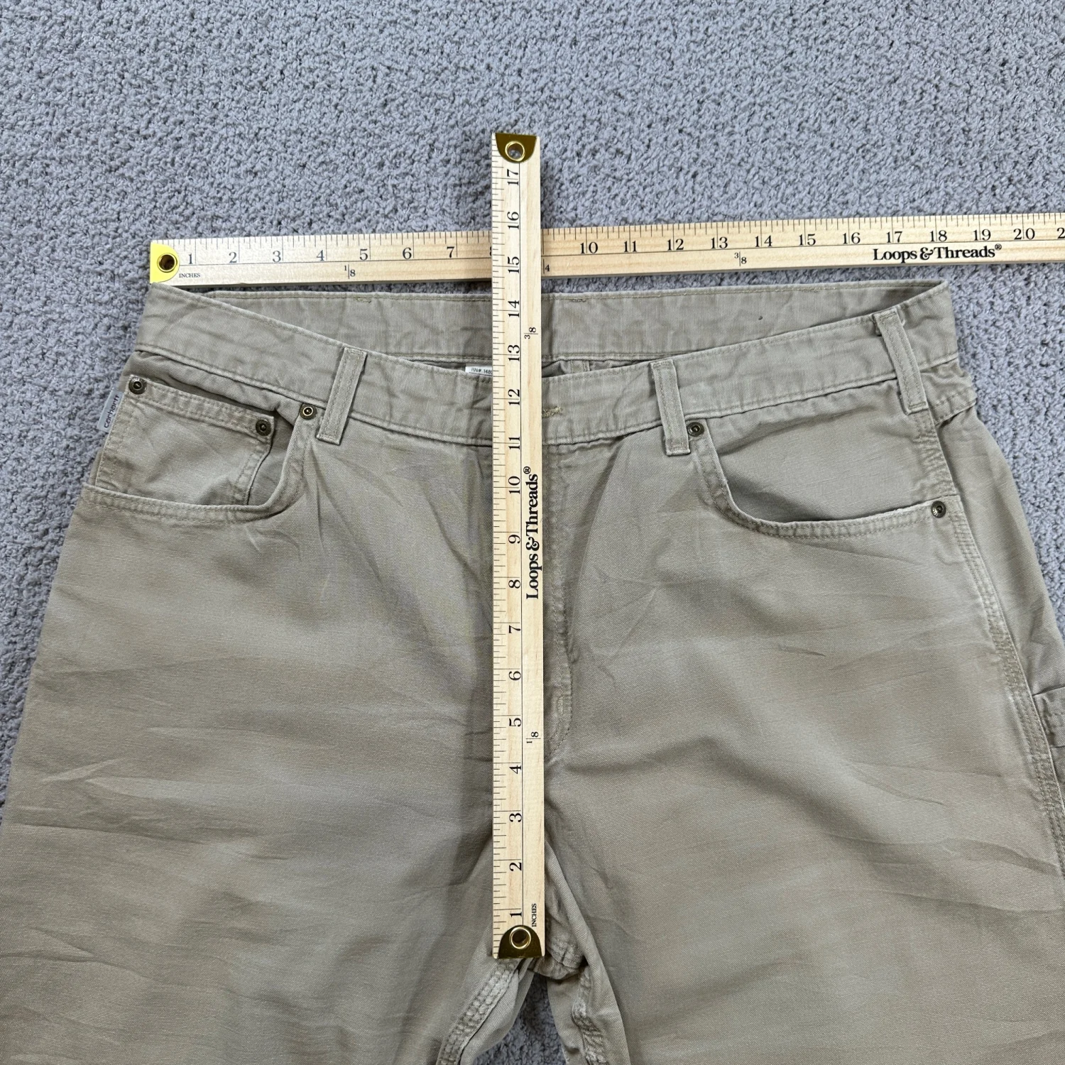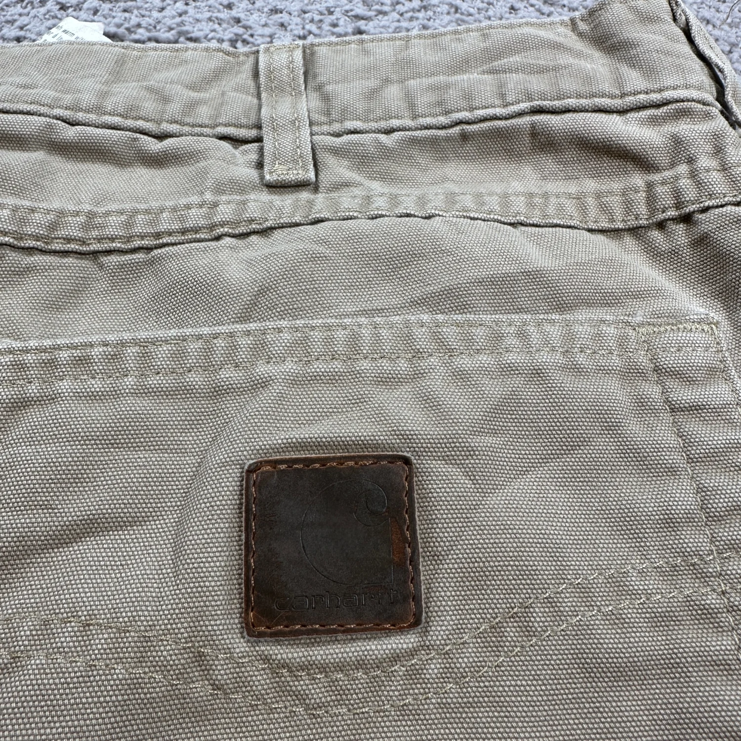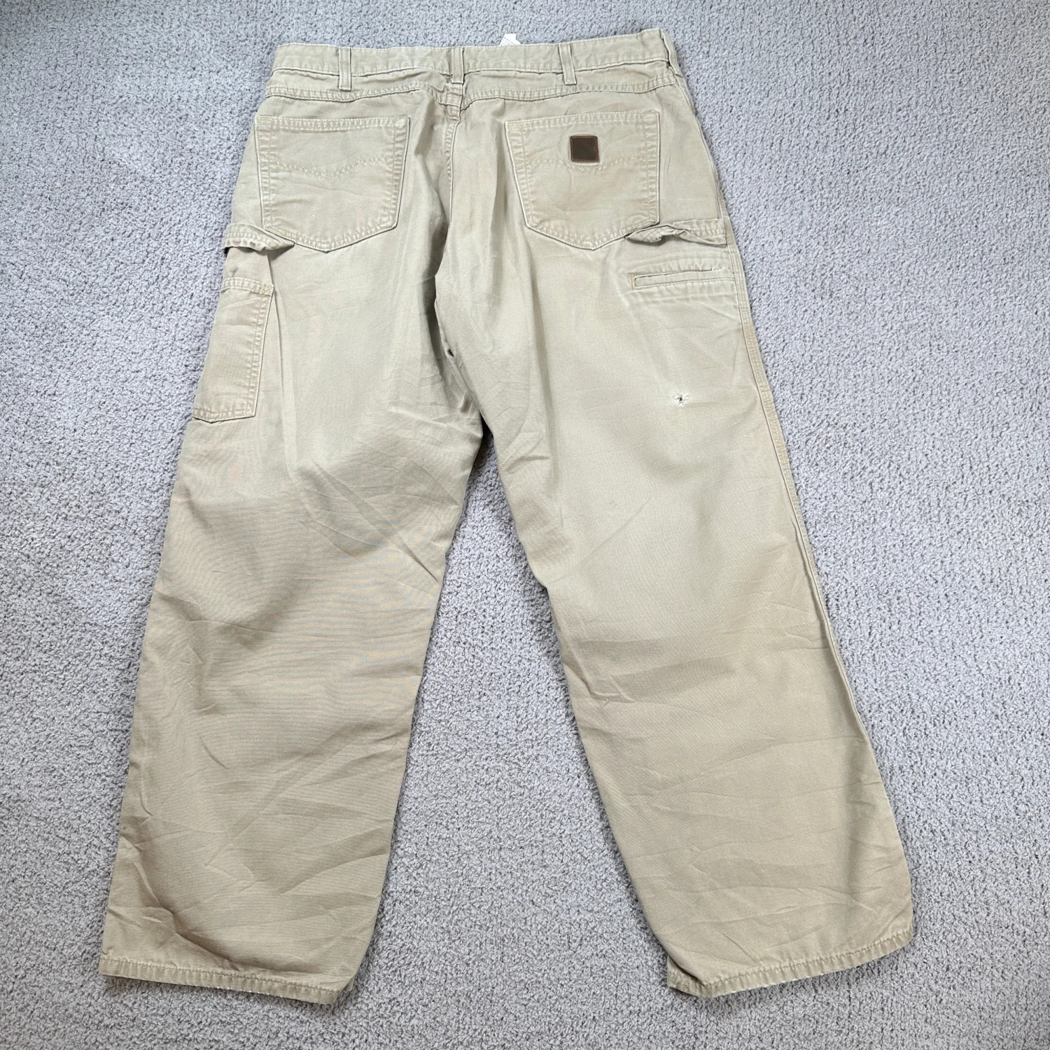 Heavy-duty cotton canvas with utility pockets and leather Carhartt patch. One small hole on back leg as shown in photos. No other structural damage. Great for workwear, repairs, or casual wear. Style: Pants Occupation: Construction Industry: Construction Material: Cotton Gender: Men Country of Origin: Nicaragua Keywords: Carhartt pants, mens workwear, khaki pants, loose fit, carpenter pants, utility pants, workwear, durable, outdoor, casual, heavy duty, cotton twill I answer most questions instantly! Please don't hesitate to contact us if you have any questions, we will be glad to answer! Thank you for shopping!