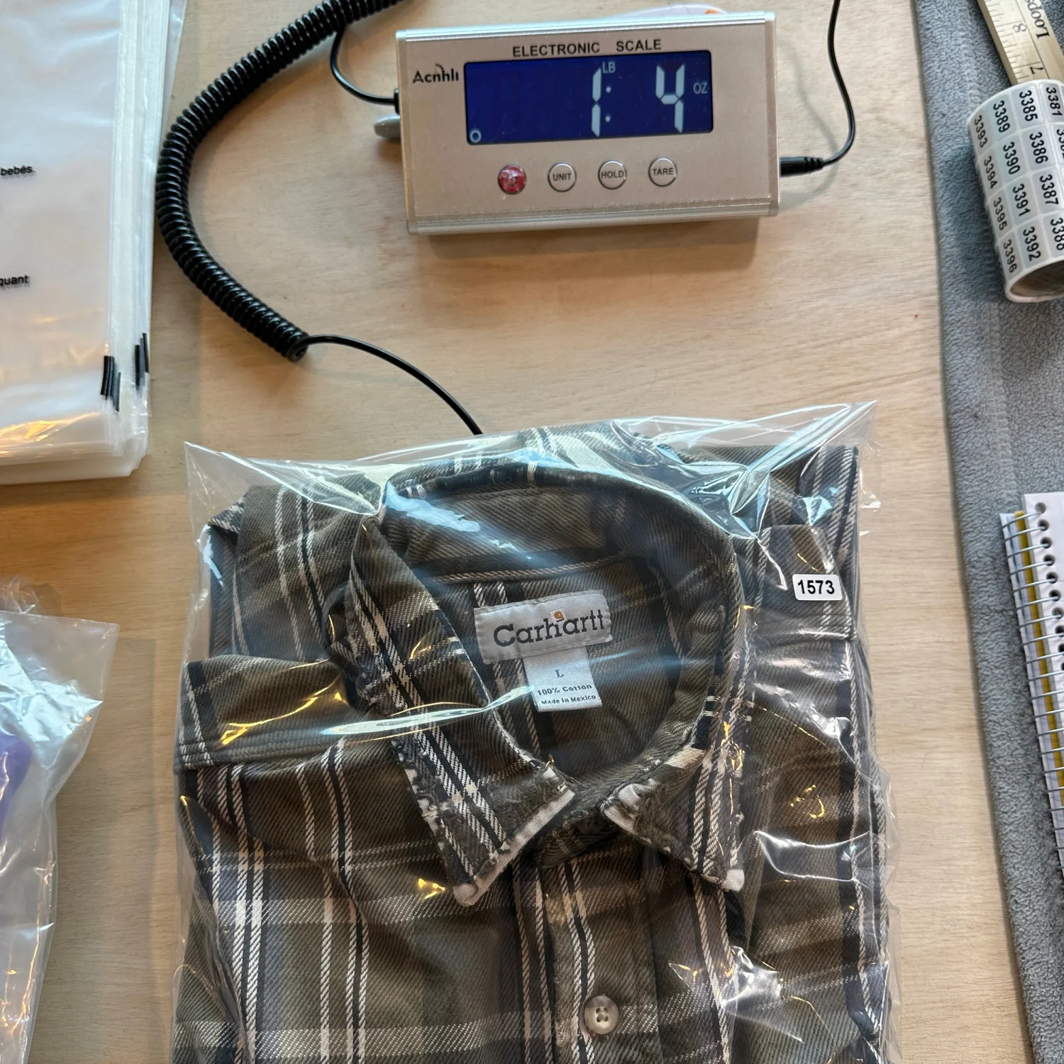 This Carhartt plaid button-up shirt features a classic design with a brown, beige, and black checkered pattern. Made from 100% cotton, it offers comfort and durability. The shirt includes two chest pockets with button flaps, adding a practical touch. Its size is L, fitting comfortably for a casual wear style. Ideal for everyday use or outdoor activities. #Carhartt #Plaid #Casual