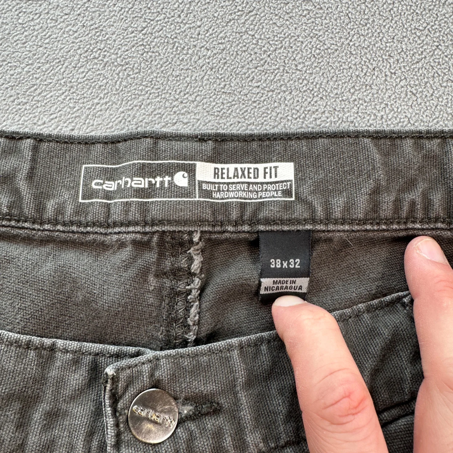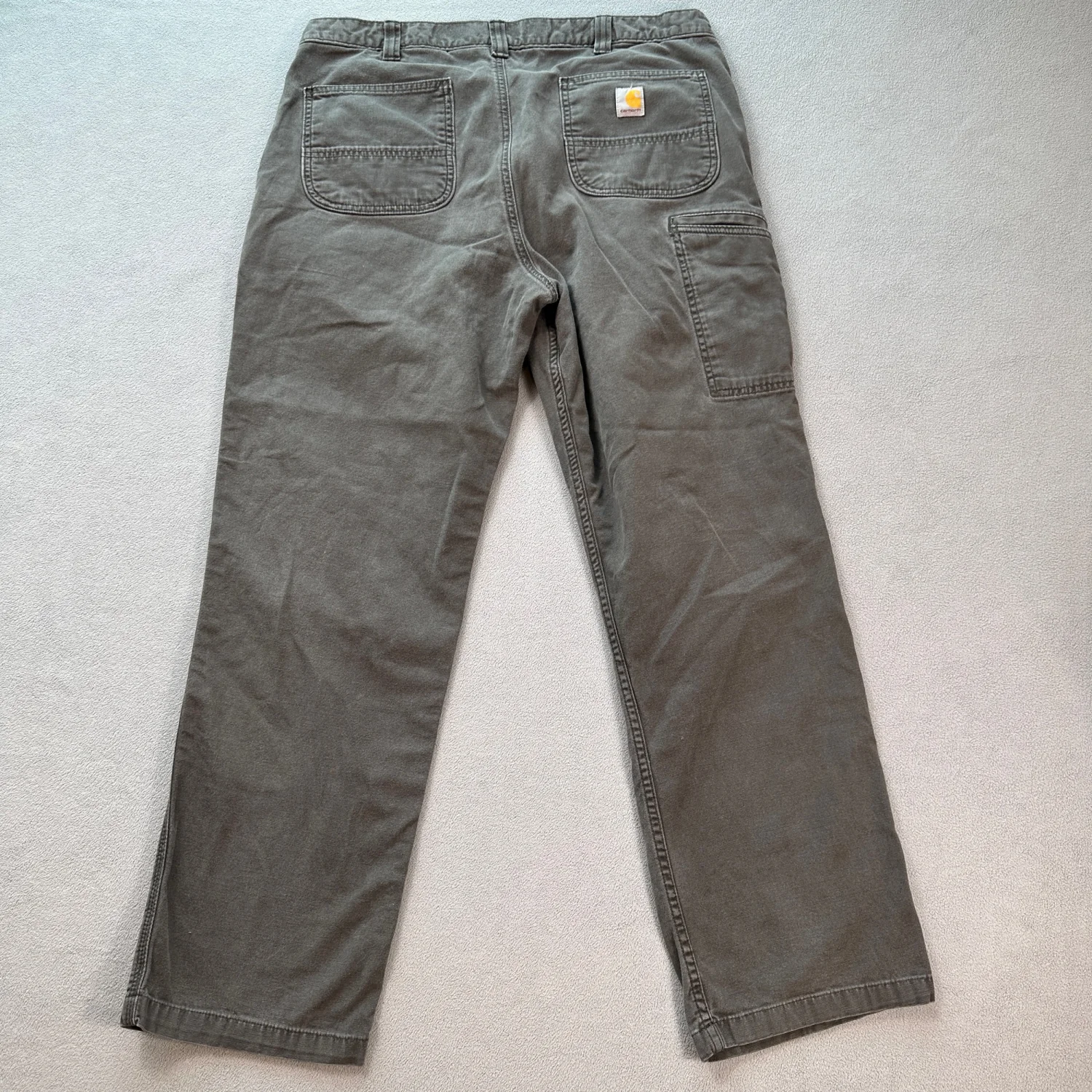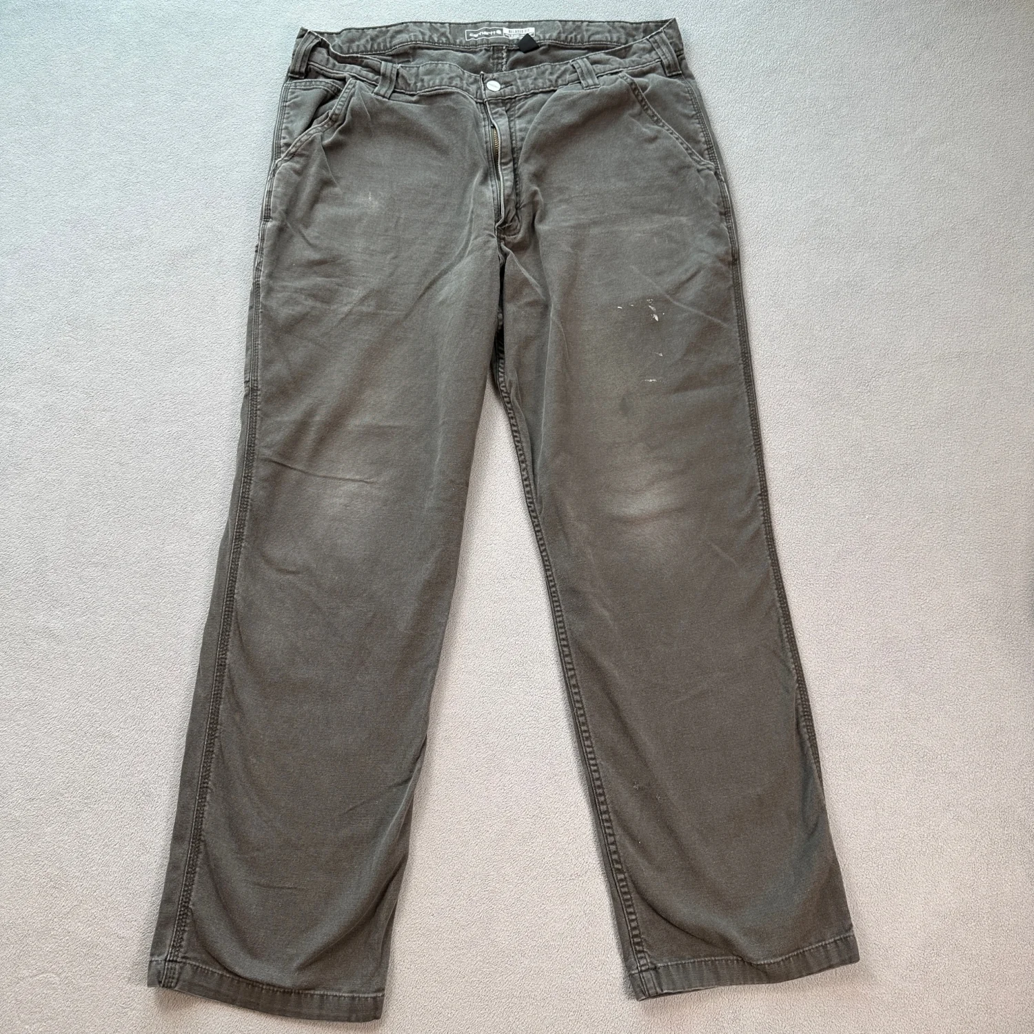 Carhartt relaxed fit work pants in grey. These pants feature a sturdy construction suitable for hard-working environments. Designed with multiple pockets for convenience and a zip fly with a metal button closure. Size is 38x32, made from durable materials. Ideal for everyday wear or work settings. #workwear #durablefashion
