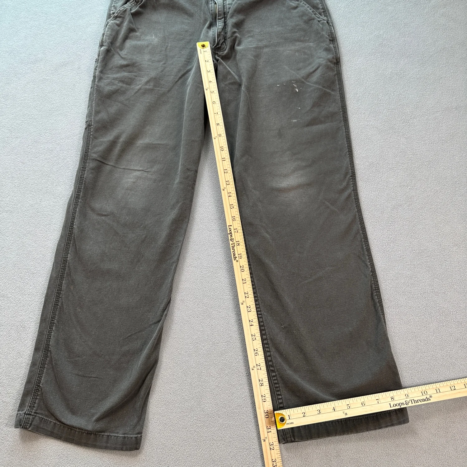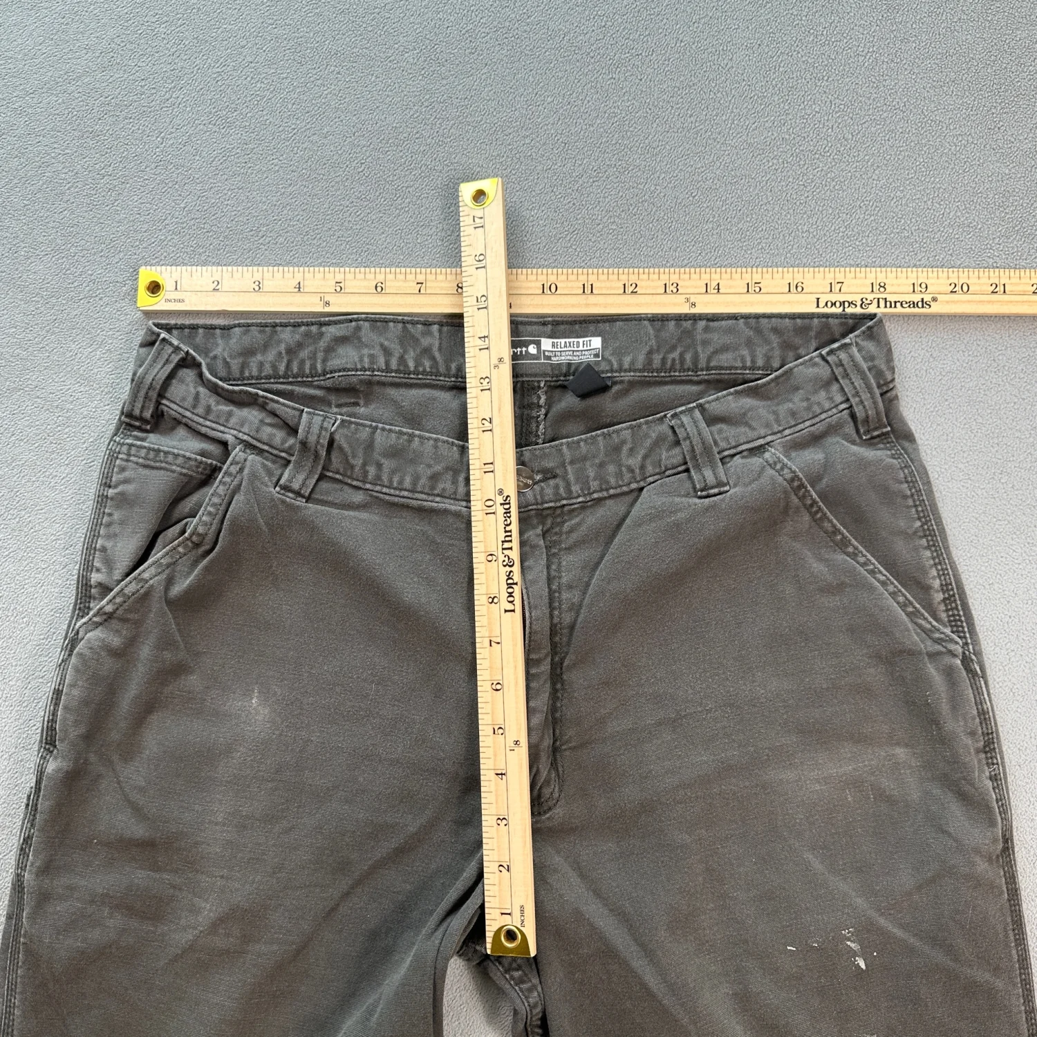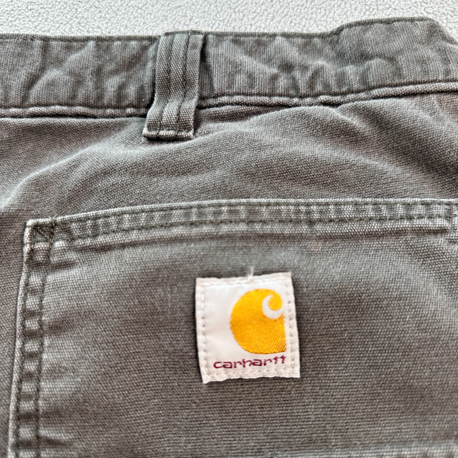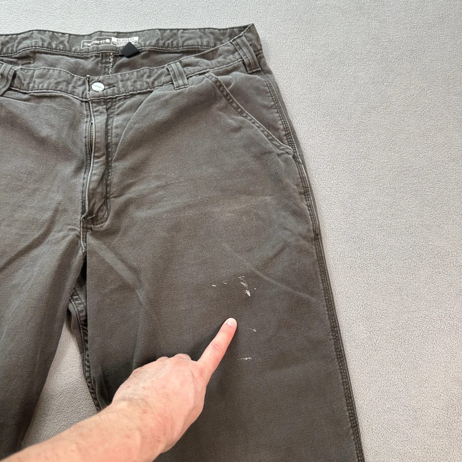 Carhartt relaxed fit work pants in grey. These pants feature a sturdy construction suitable for hard-working environments. Designed with multiple pockets for convenience and a zip fly with a metal button closure. Size is 38x32, made from durable materials. Ideal for everyday wear or work settings. #workwear #durablefashion
