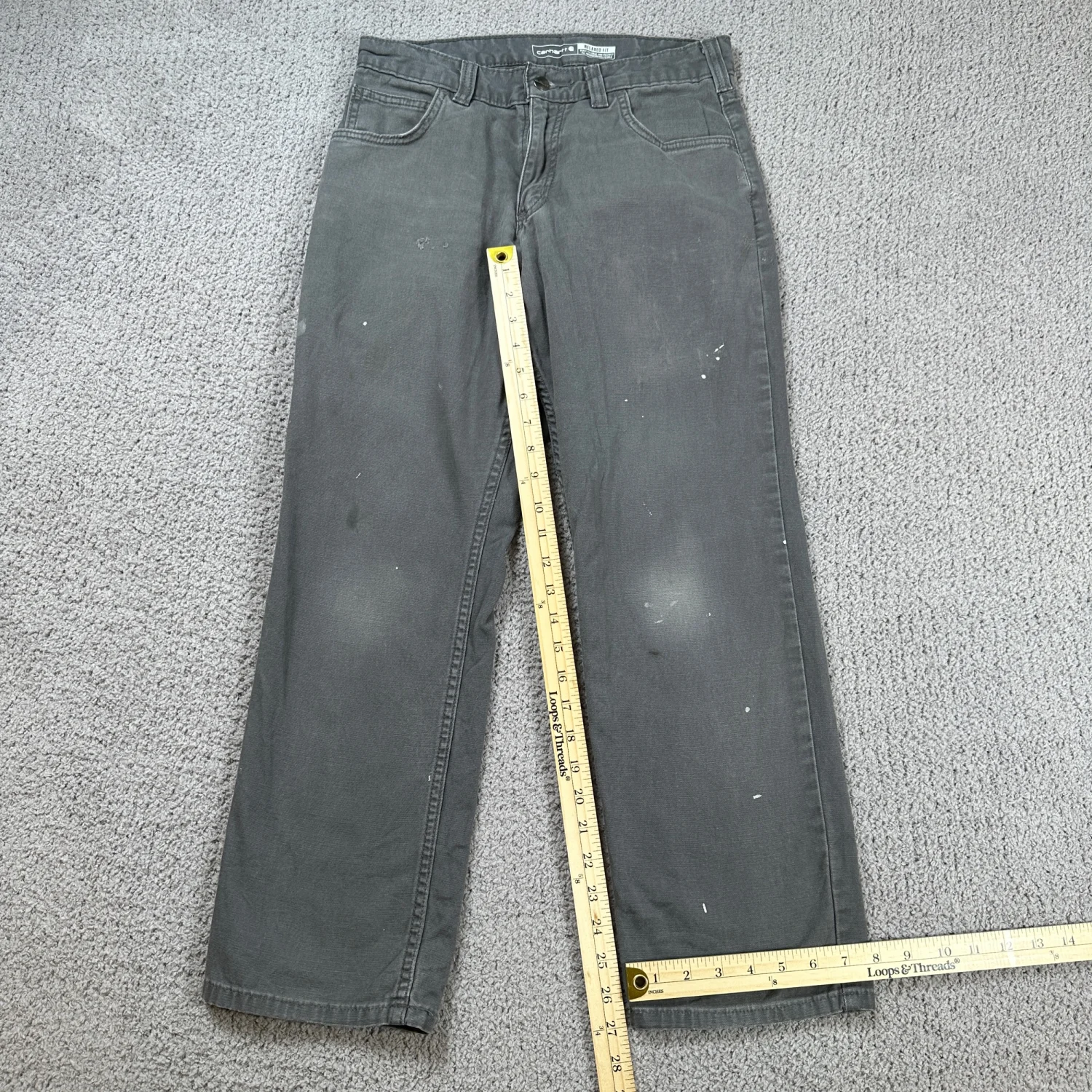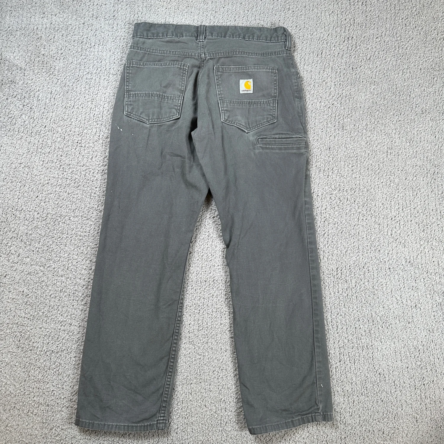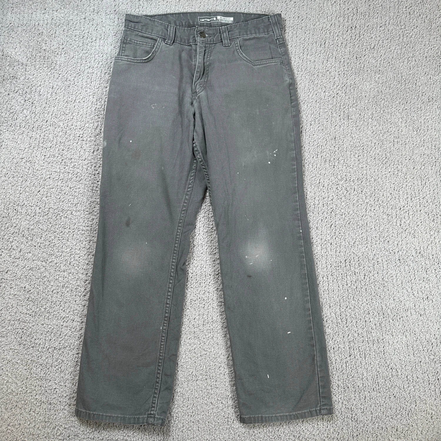 Authentic Carhartt Rugged Flex relaxed fit canvas work pants. Size 30x28 (see measurements). Charcoal gray with natural fading and light paint marks from wear. No holes or structural damage. Comfortable stretch canvas, great for workwear or casual wear. Industry: Construction Material: Canvas Gender: Men Country of Origin: Nicaragua Keywords: Carhartt work pants, mens workwear, canvas pants, relaxed fit, rugged flex, utility pants, durable, outdoor, construction, heavy duty, casual, labor I answer most questions instantly! Please don't hesitate to contact us if you have any questions, we will be glad to answer! Thank you for shopping!