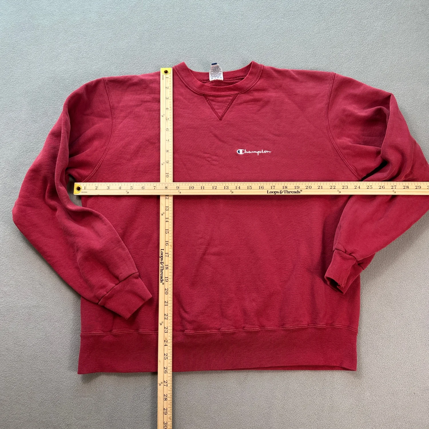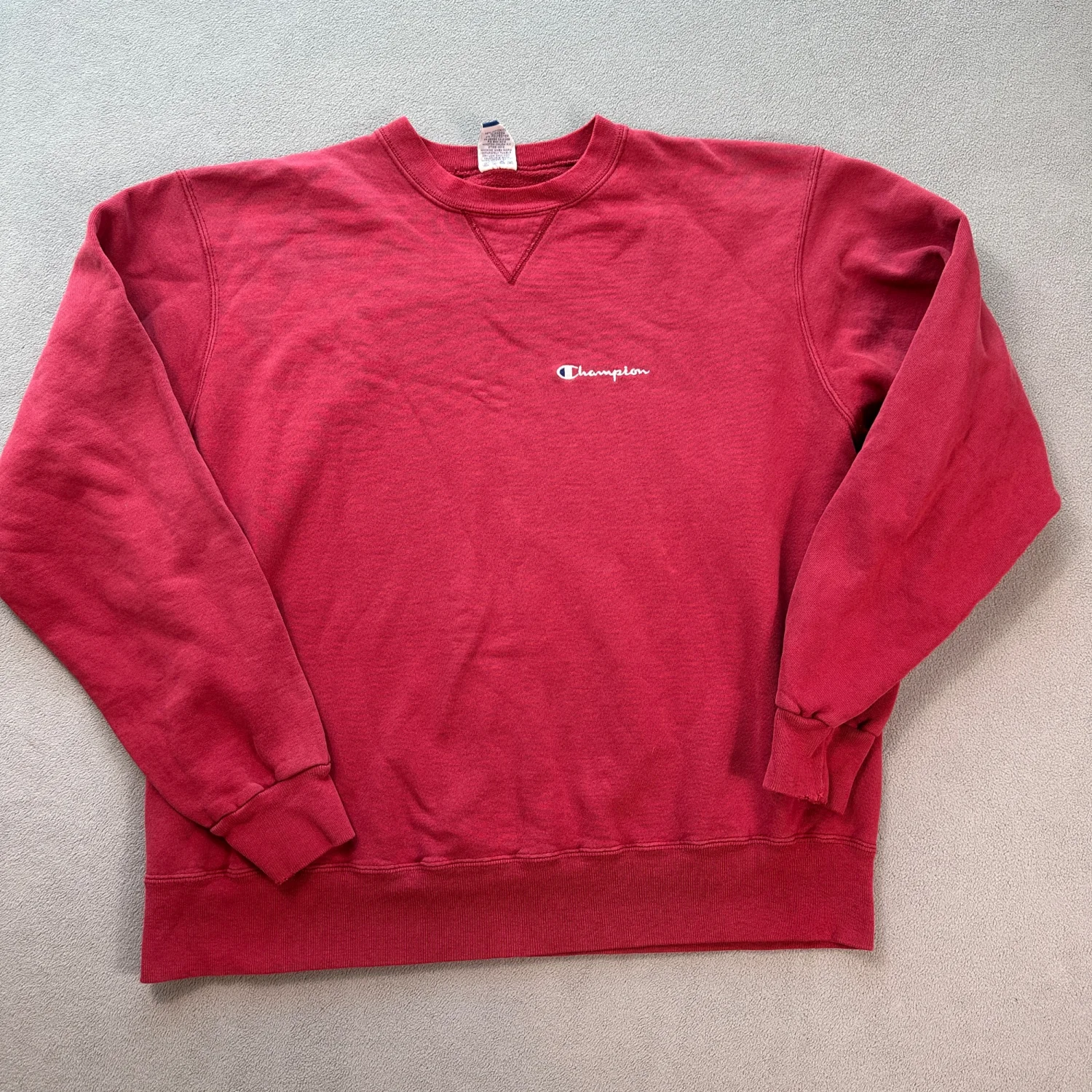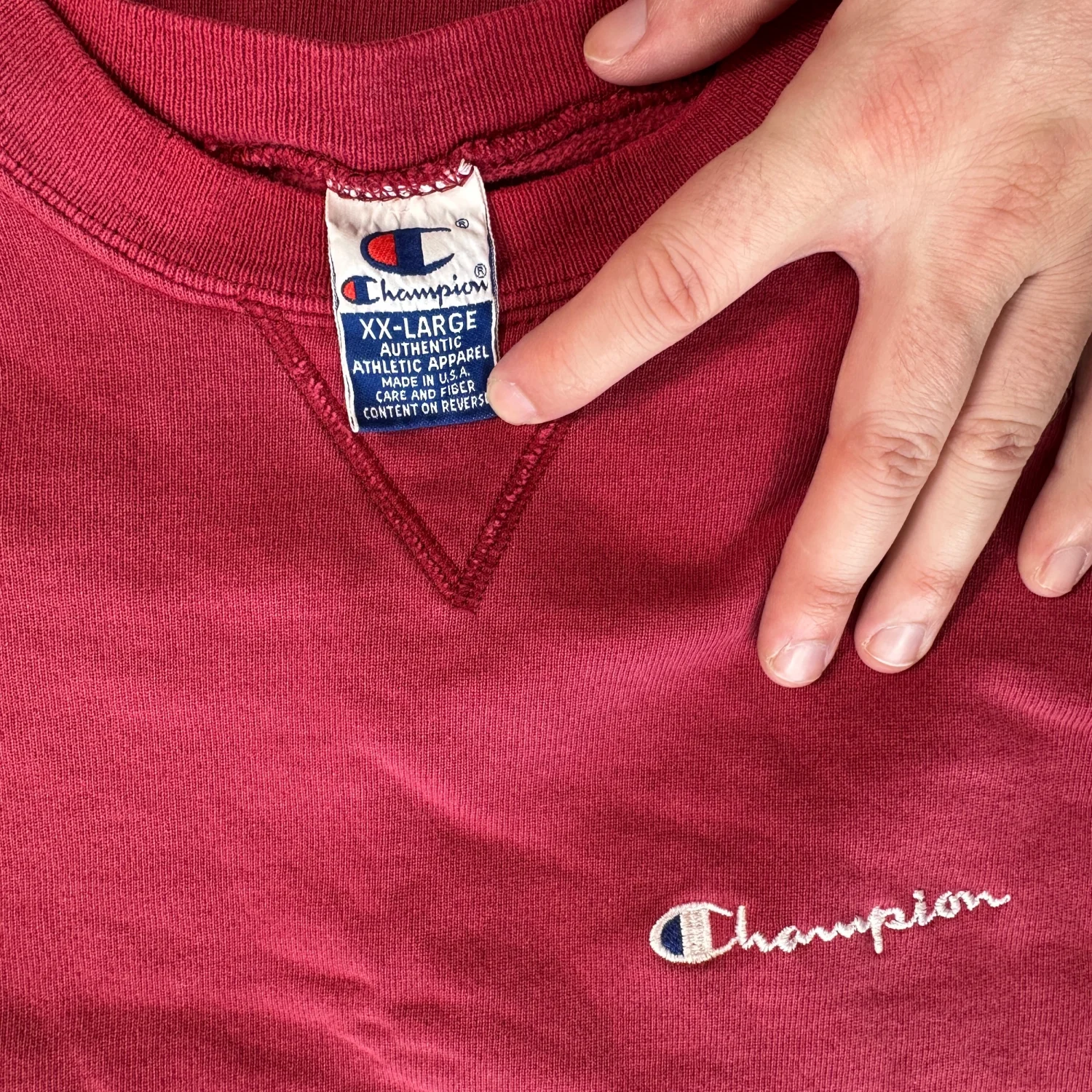 This Champion red crewneck sweatshirt is made from a comfortable blend of 95% cotton and 5% polyester. It features the classic Champion logo embroidered on the chest and a small logo patch on the sleeve. Perfect for casual wear, it provides a cozy fit. Care instructions include machine wash warm, tumble dry low. Tags: #Champion #crewneck #90s #vintage