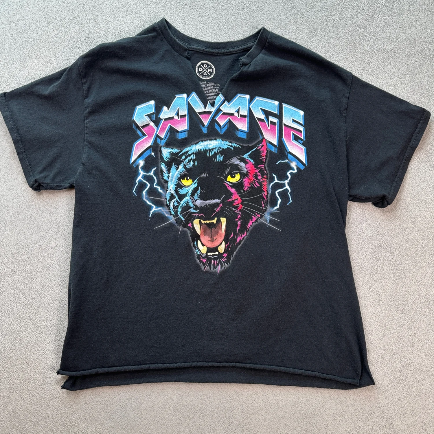 This black DOM brand t-shirt features a bold graphic of a roaring panther under the word 'SAVAGE' in a striking retro font. Made from 100% cotton, it's comfortable and breathable, ideal for casual wear. The t-shirt is a size L and is in excellent condition with no visible wear. Care instructions include machine wash in cold water with like colors, and tumble dry low. Perfect for fans of vintage-inspired designs and animal graphics. #graphictee #panther #vintageinspired