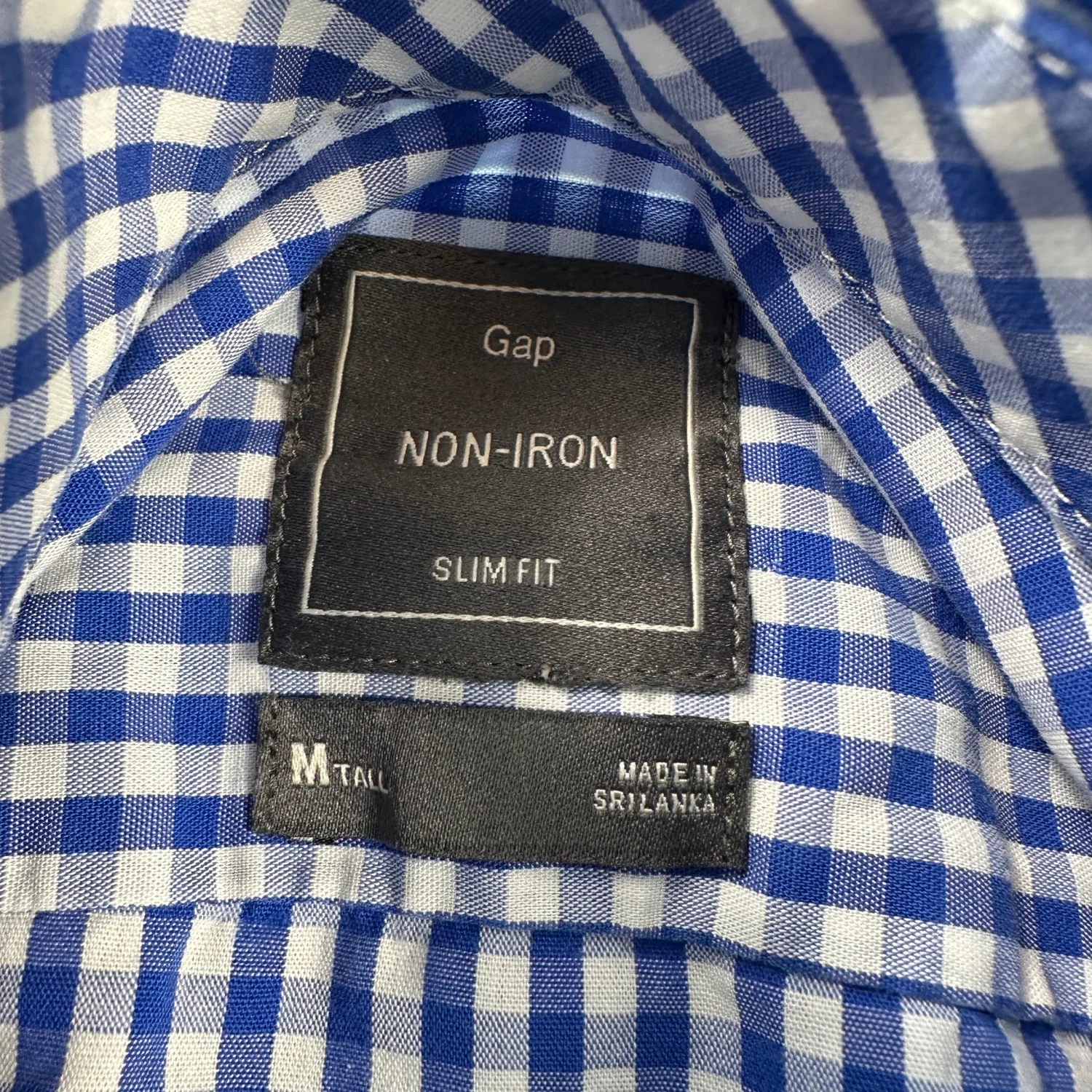This is a Gap non-iron slim fit shirt featuring a classic blue and white gingham check pattern. Constructed from 100% cotton, it offers comfort and breathability. The shirt is made for a taller fit in size M Tall and is ideal for both casual and semi-formal occasions. Care label is made from 100% recycled plastic, adding an eco-friendly touch. Measurements are provided for better fitting. Tags: #Gap #Gingham #SlimFit #CheckPattern #EcoFriendly.