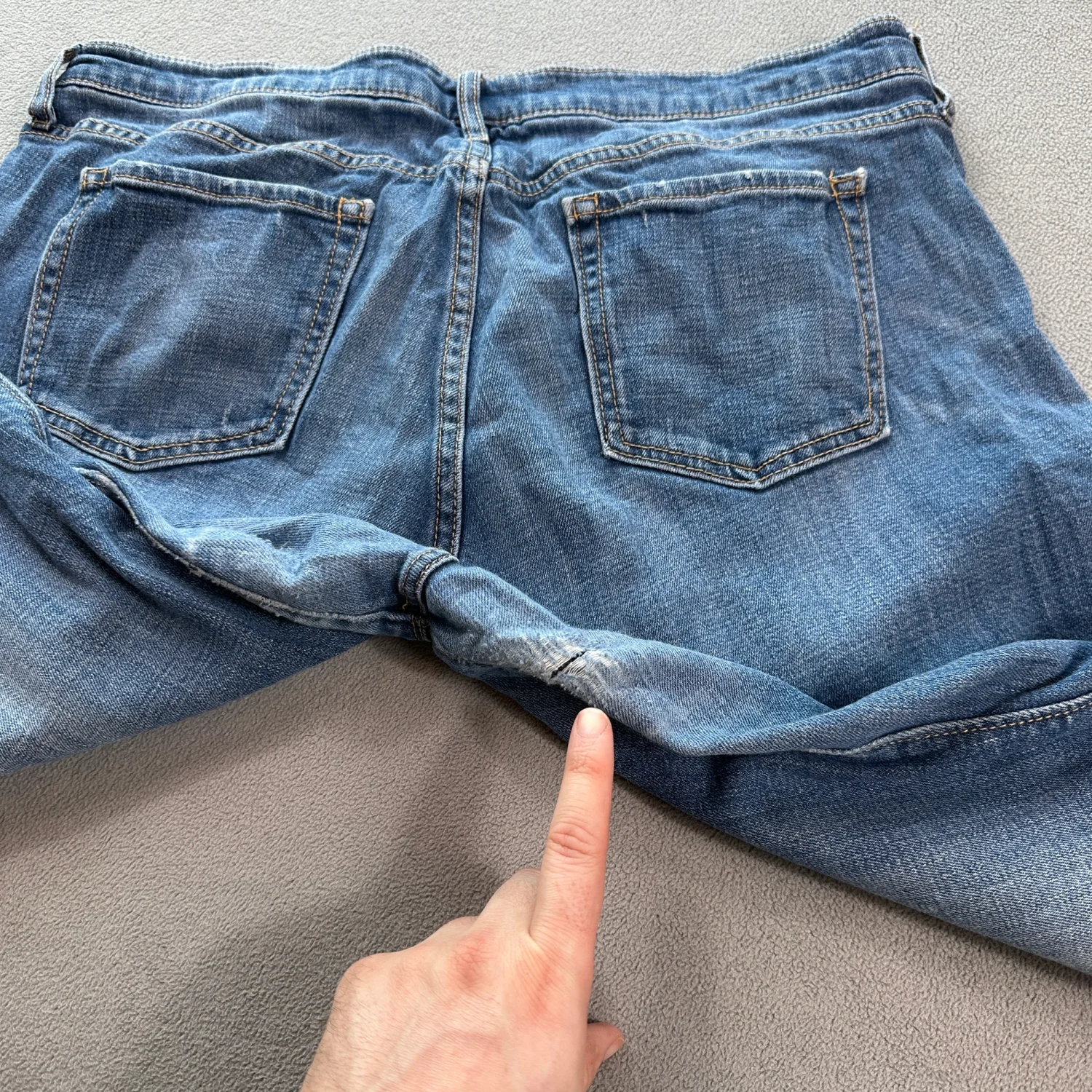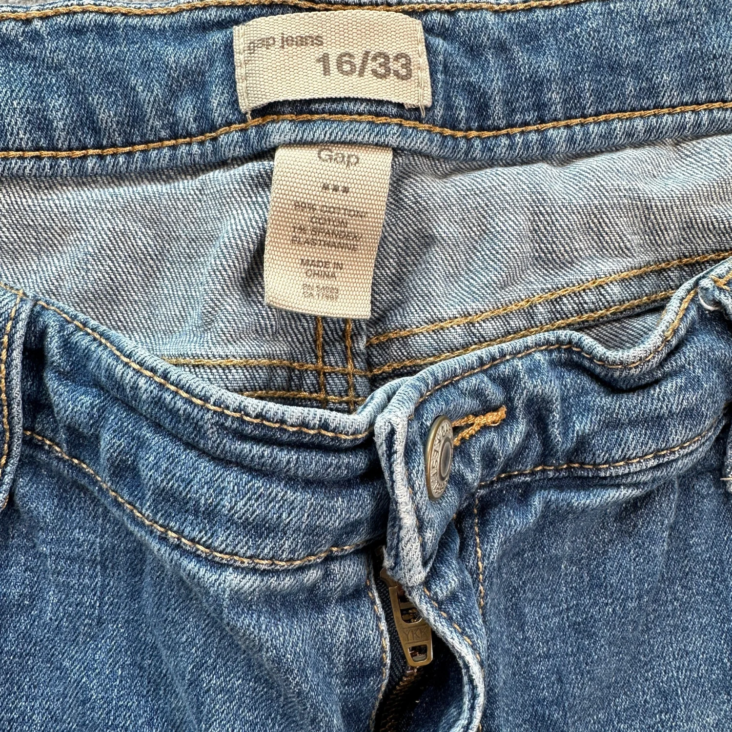 Gap relaxed fit jeans in a classic blue wash. Features a zip fly with button closure, five-pocket style, and subtle fading for a worn-in look. Size labeled as 16/33. Notable wear includes minor fraying at the cuffs and a small stitching repair on the back seam. Ideal for casual wear or a vintage style. Tags: #casual #denim #vintage
