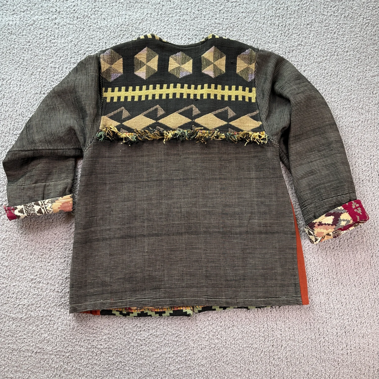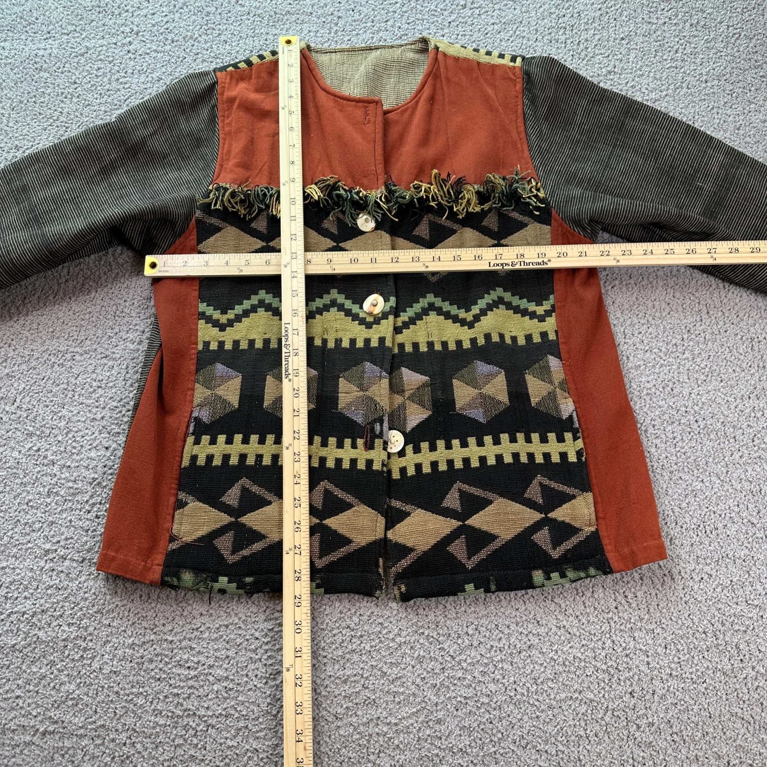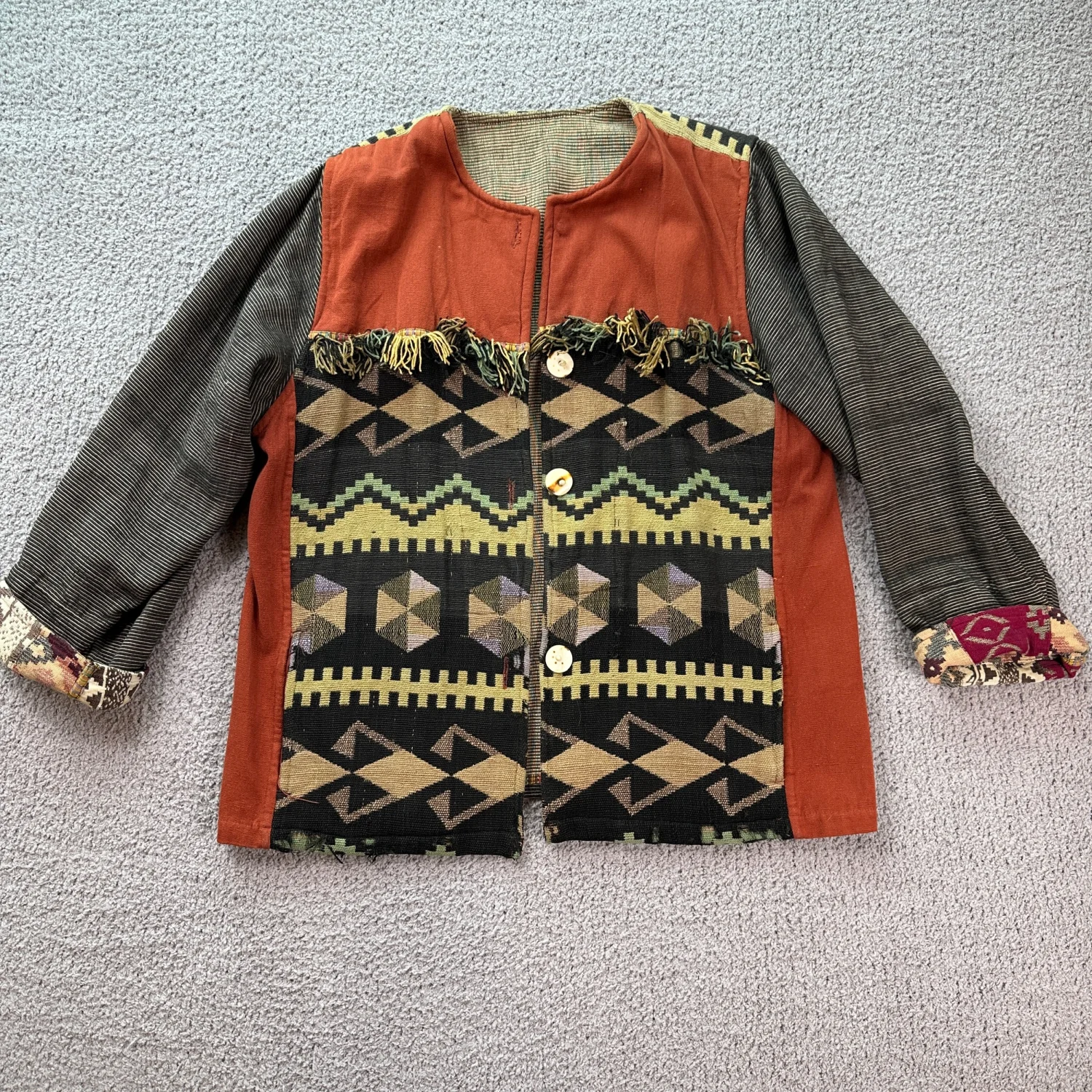 *it was hand made so it does not have tag or size so please check measurements! Handmade artisan patchwork jacket featuring woven geometric tribal patterns and fringe detailing. Button front with mixed textiles throughout and contrast rolled cuffs. Fully lined with a relaxed, cropped silhouette. No size tag — fits approximately women's medium (see measurements). Very good condition with natural variations consistent with handcrafted construction. One-of-a-kind statement piece. Type: Jacket Style: Basic Jacket Department: Women Theme: Southwestern, Hipster Accents: Fringe, Tasseled, Button Features: Pockets, Collarless Pattern: Geometric Season: Spring, Fall Closure: Button Occasion: Casual Sleeve Length: Long Sleeve Fit: Regular 2.4 geometric, boho, festival, artsy, unique, statement piece, ethnic, tribal, designer, Embroidered Button Front Bohemian Ethnic