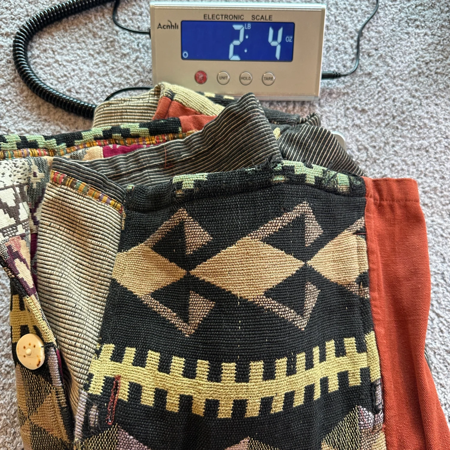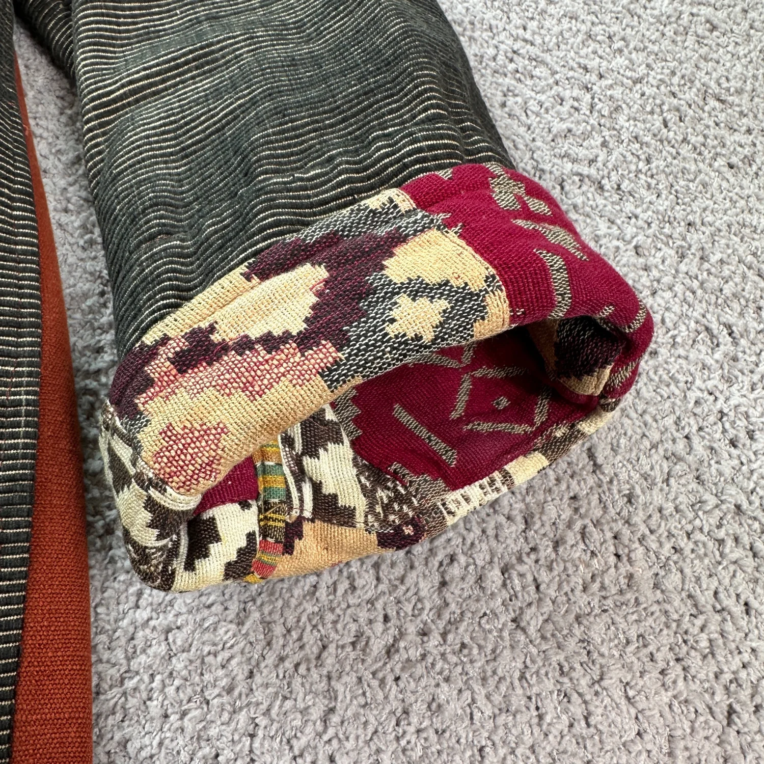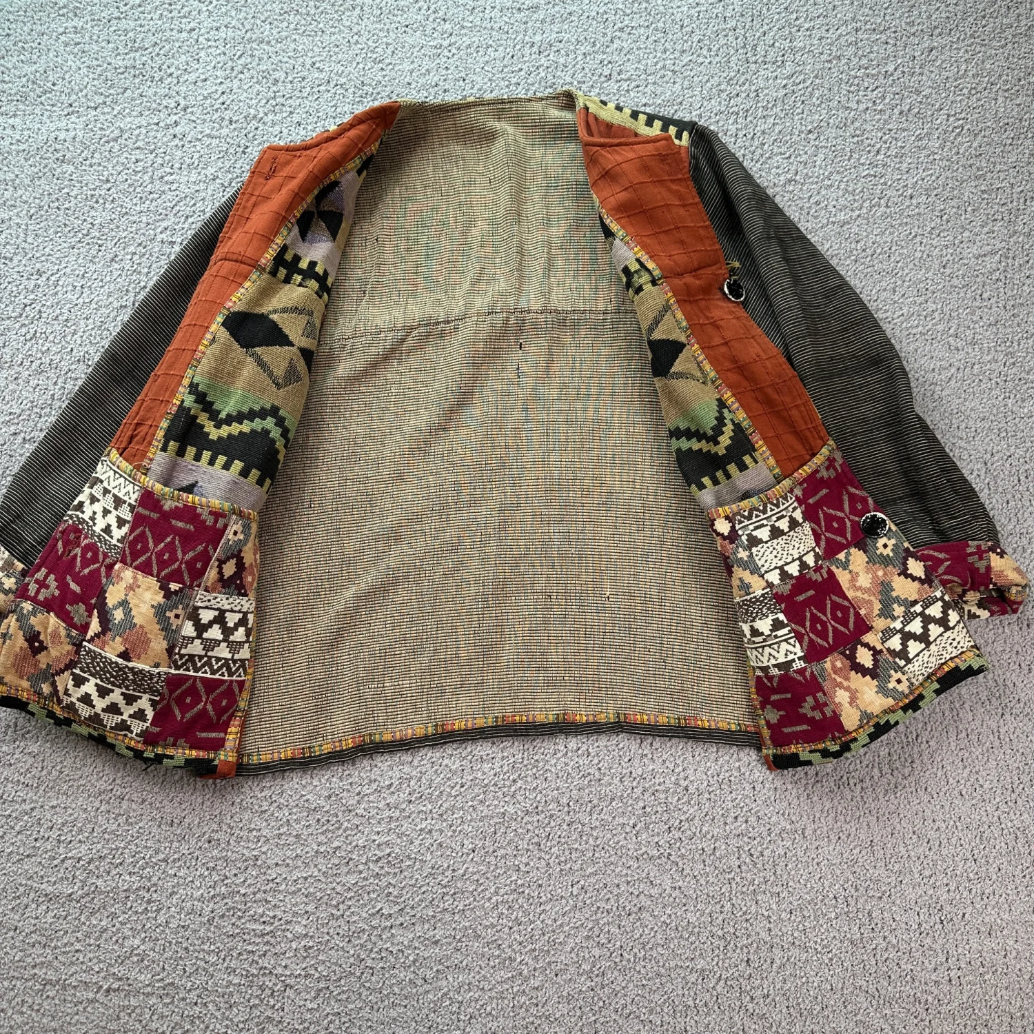 *it was hand made so it does not have tag or size so please check measurements! Handmade artisan patchwork jacket featuring woven geometric tribal patterns and fringe detailing. Button front with mixed textiles throughout and contrast rolled cuffs. Fully lined with a relaxed, cropped silhouette. No size tag — fits approximately women's medium (see measurements). Very good condition with natural variations consistent with handcrafted construction. One-of-a-kind statement piece. Type: Jacket Style: Basic Jacket Department: Women Theme: Southwestern, Hipster Accents: Fringe, Tasseled, Button Features: Pockets, Collarless Pattern: Geometric Season: Spring, Fall Closure: Button Occasion: Casual Sleeve Length: Long Sleeve Fit: Regular 2.4 geometric, boho, festival, artsy, unique, statement piece, ethnic, tribal, designer, Embroidered Button Front Bohemian Ethnic