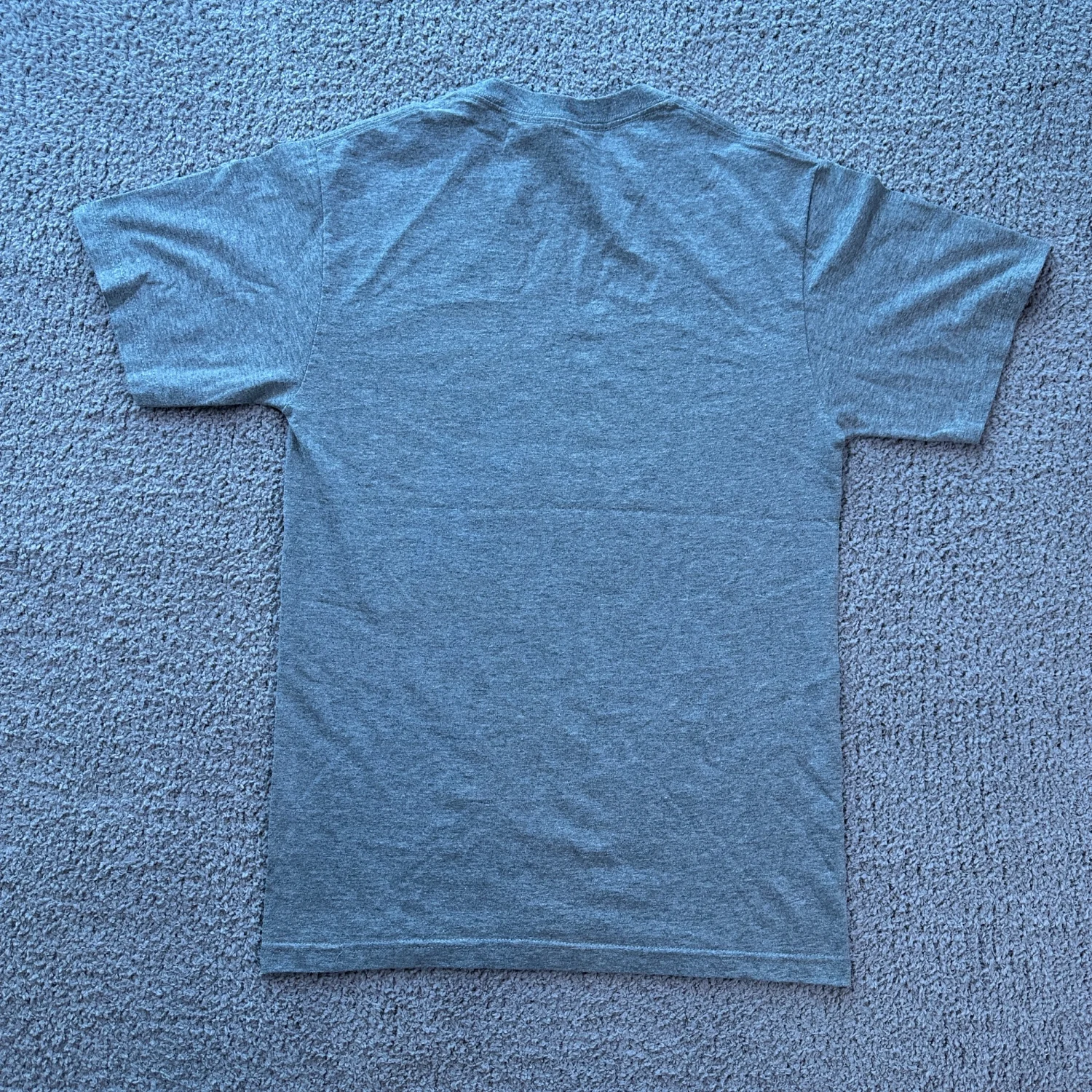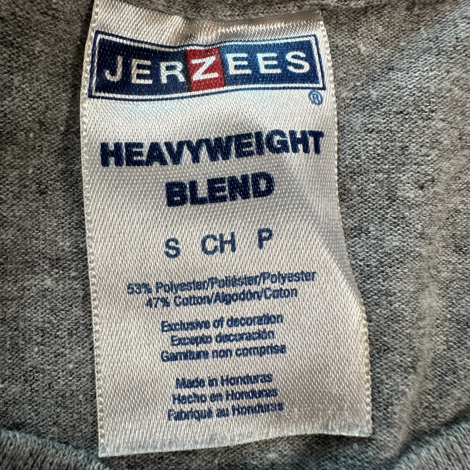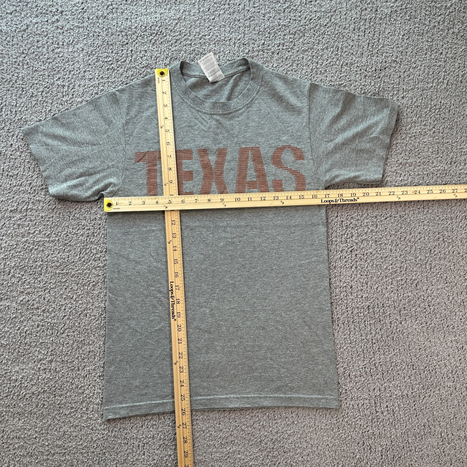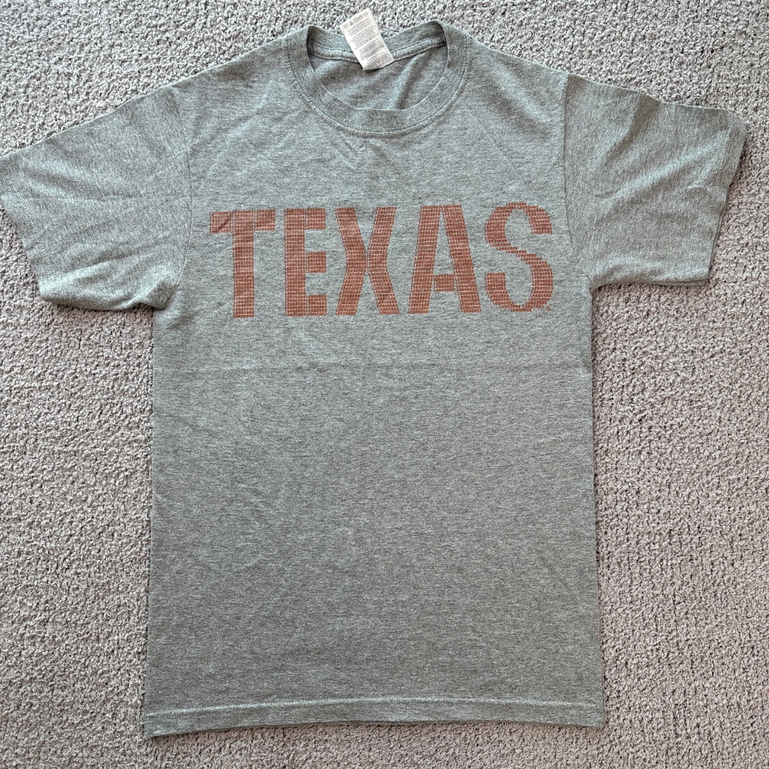 Jerzees heavyweight blend T-shirt featuring a 'TEXAS' graphic in bold letters across the front. Made from 50% polyester and 47% cotton for a comfortable fit, this gray T-shirt is perfect for casual wear. Size Small. Ideal for showing off state pride. #Texas #GraphicTee #CasualWear