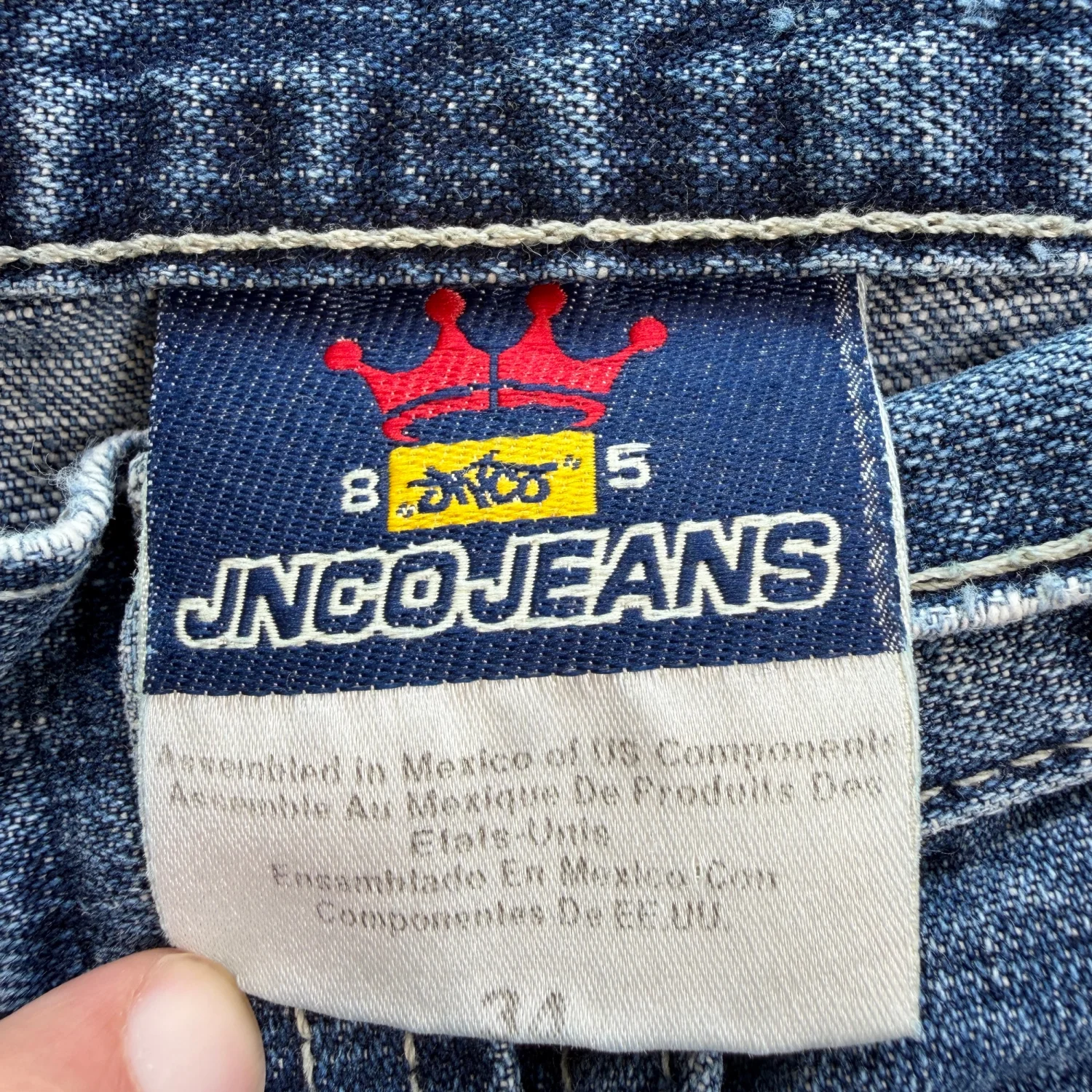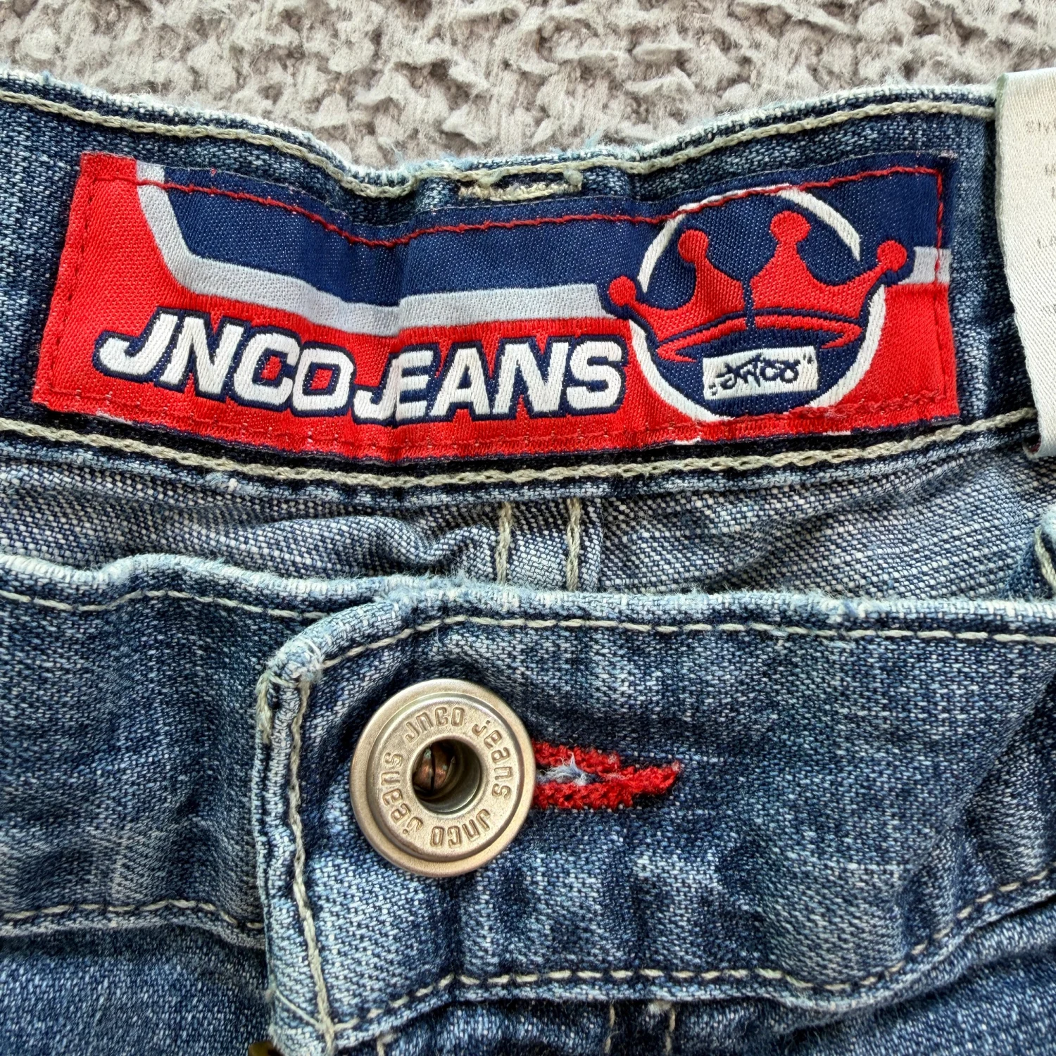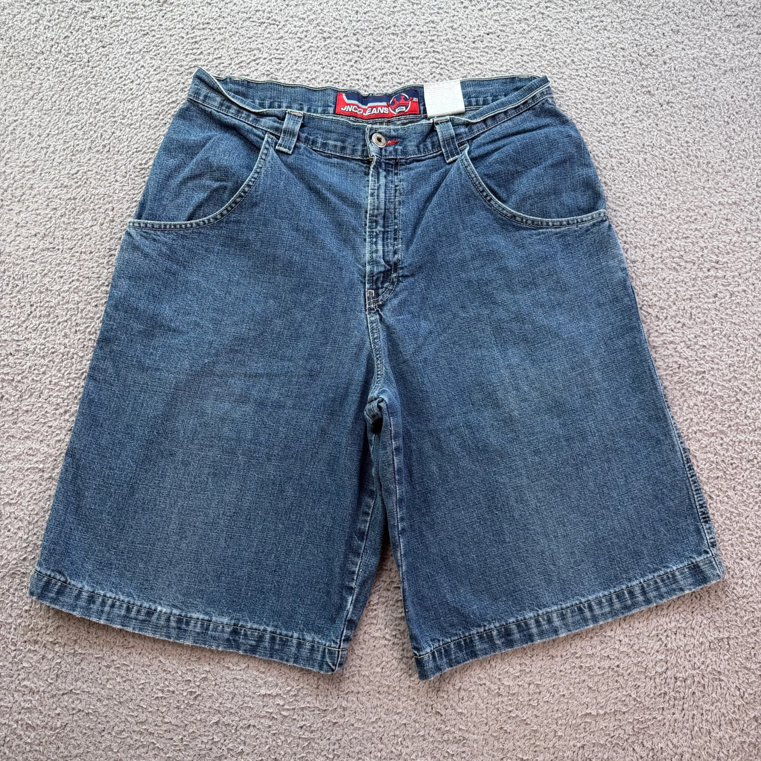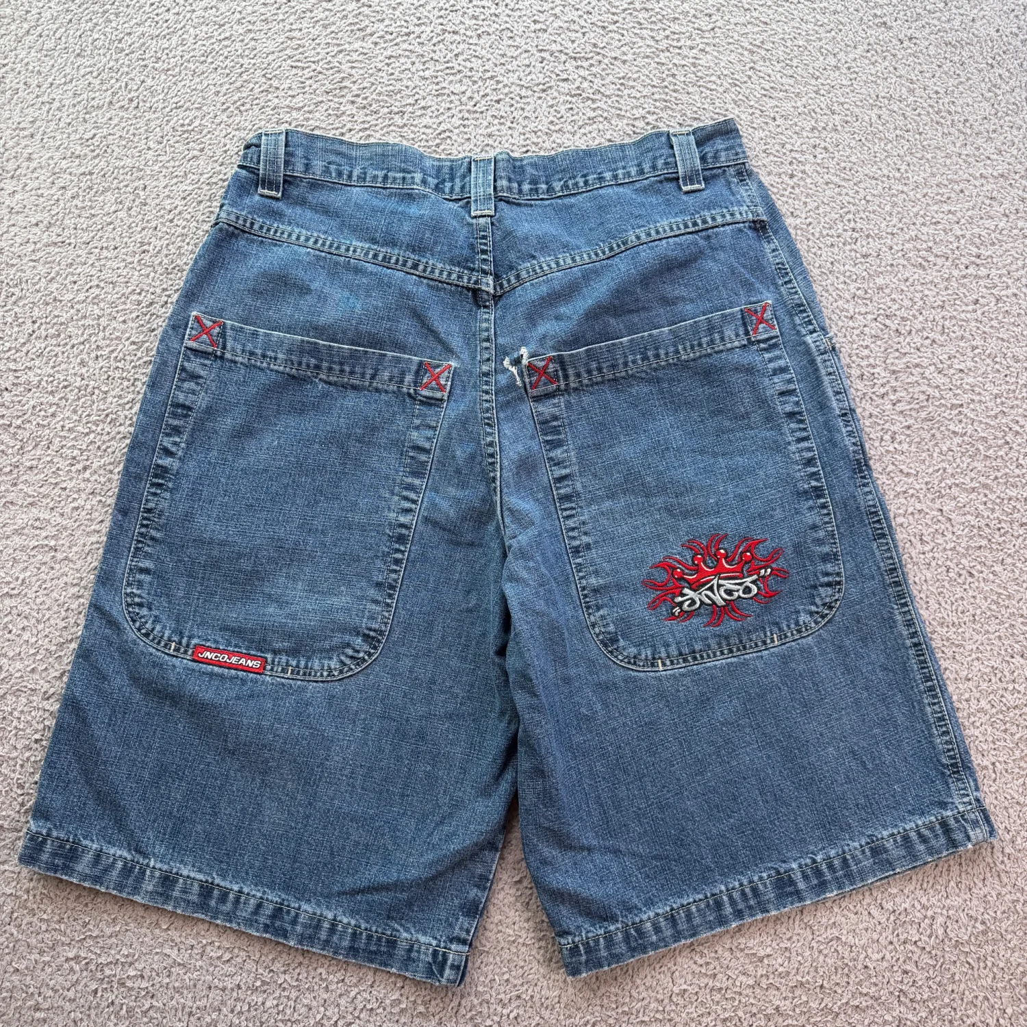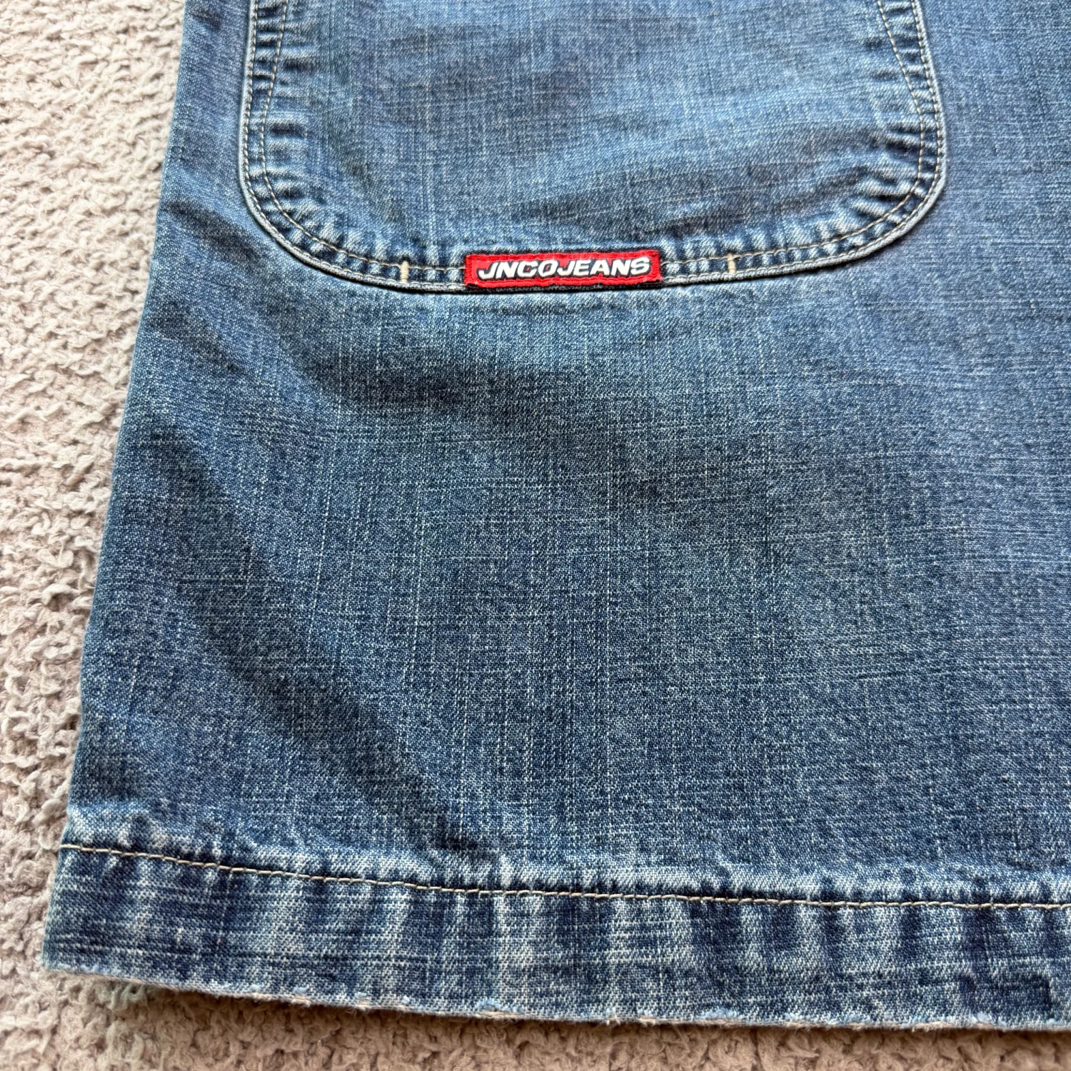 Vintage JNCO baggy denim shorts featuring signature large back pockets with embroidered logo design. Classic blue denim color. Made from durable cotton, ideal for everyday wear. Size 14, offering a loose and comfortable fit. Perfect for those looking to embrace the 90s style trend. #vintage #denim #90s #streetwear