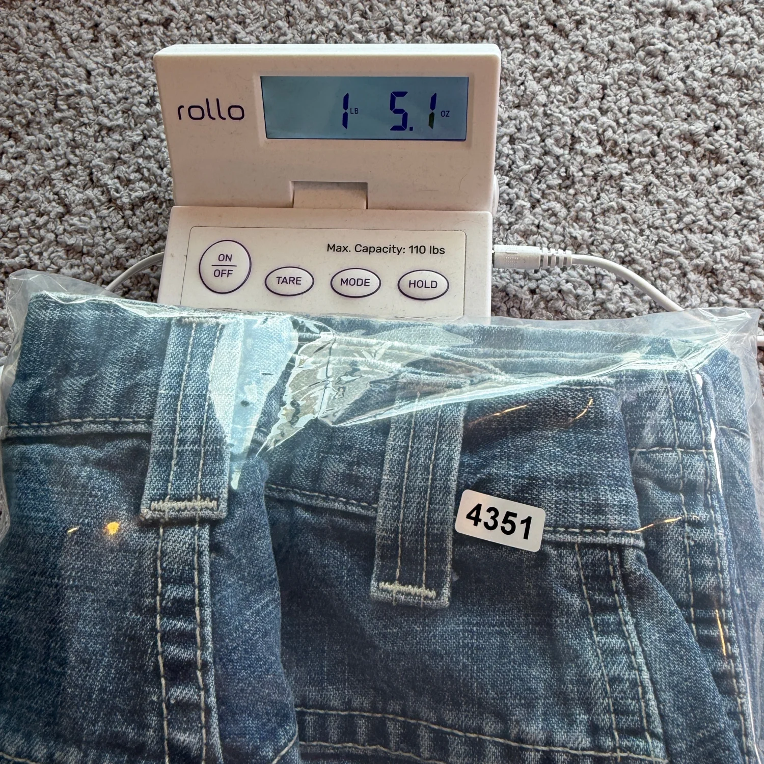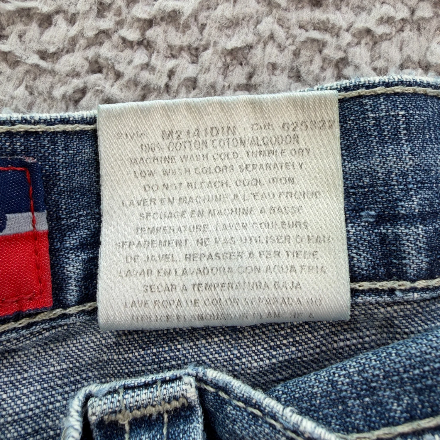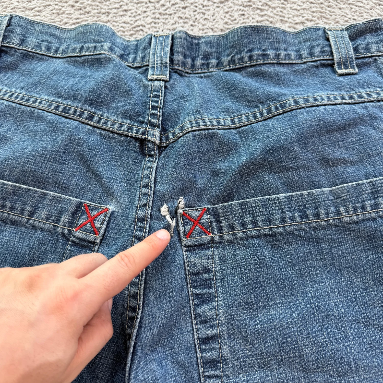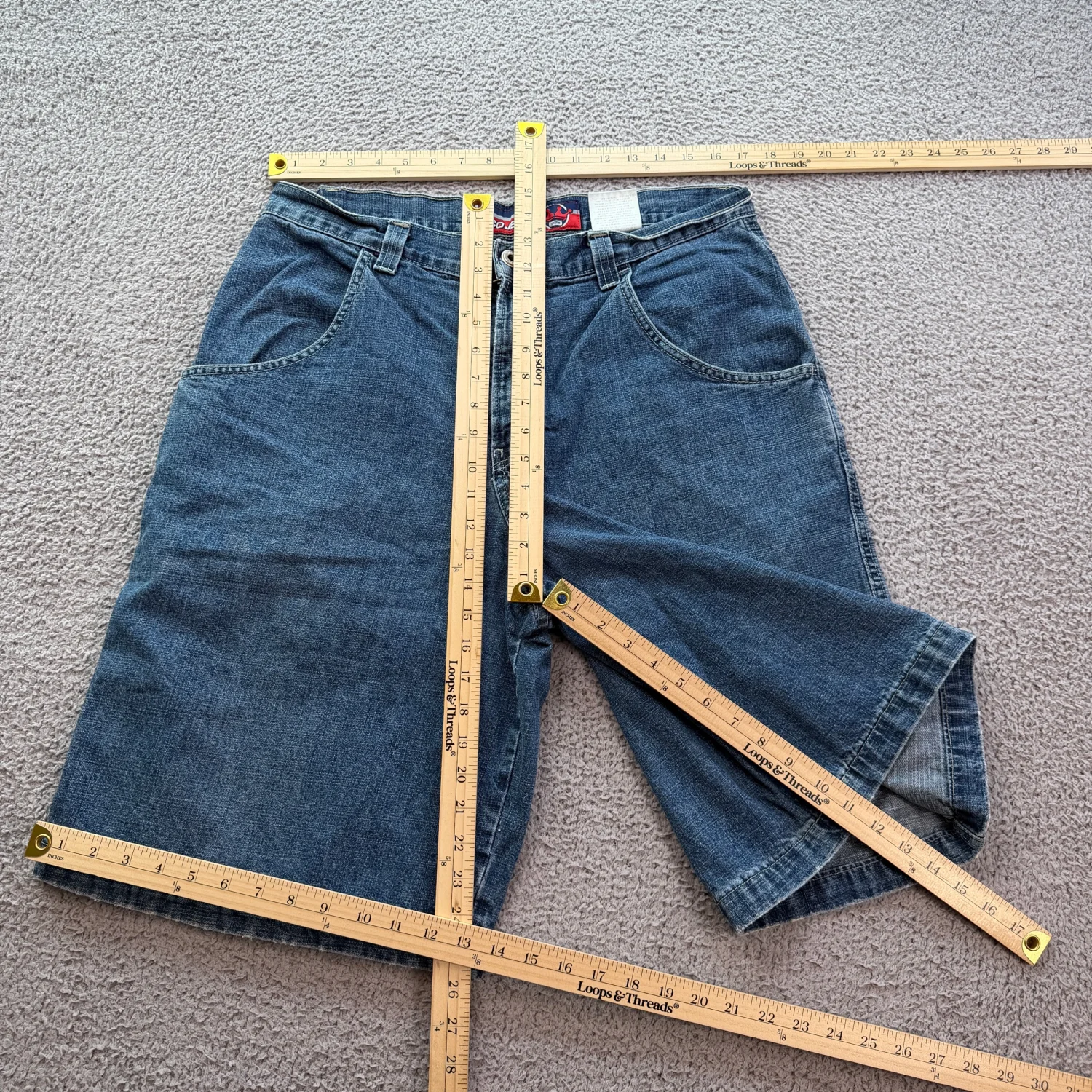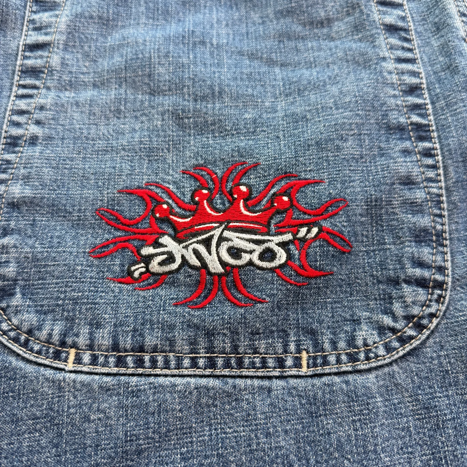 Vintage JNCO baggy denim shorts featuring signature large back pockets with embroidered logo design. Classic blue denim color. Made from durable cotton, ideal for everyday wear. Size 14, offering a loose and comfortable fit. Perfect for those looking to embrace the 90s style trend. #vintage #denim #90s #streetwear