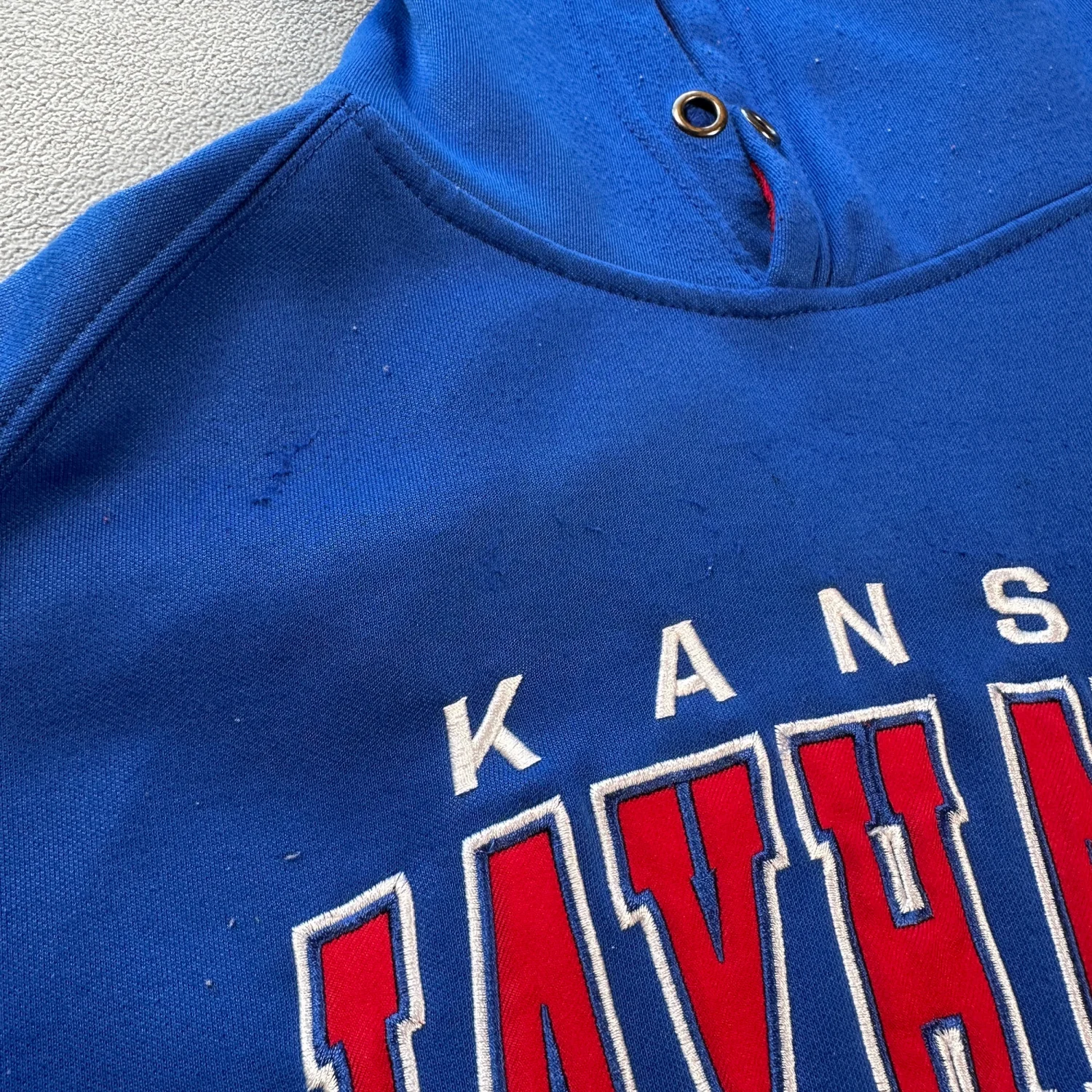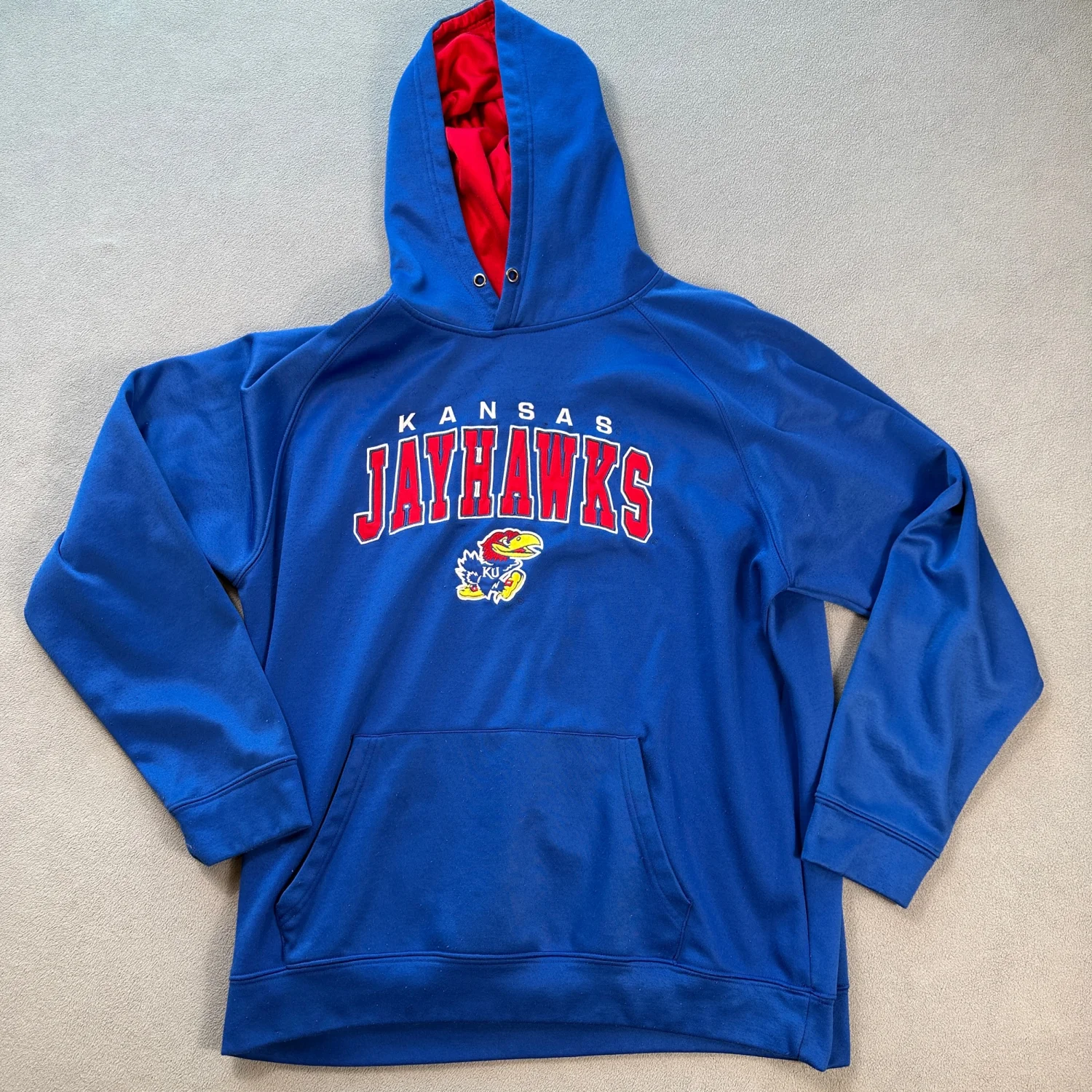 Show your team spirit with this Kansas Jayhawks hoodie. Made from 100% polyester, this blue hoodie features a striking Jayhawks logo and bold lettering across the chest. The interior is lined with a contrasting red for extra style. Perfect for cooler days or game days. Machine washable and designed for comfort and durability. #Kansas #Jayhawks #Hoodie