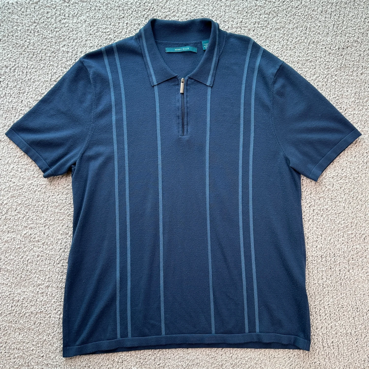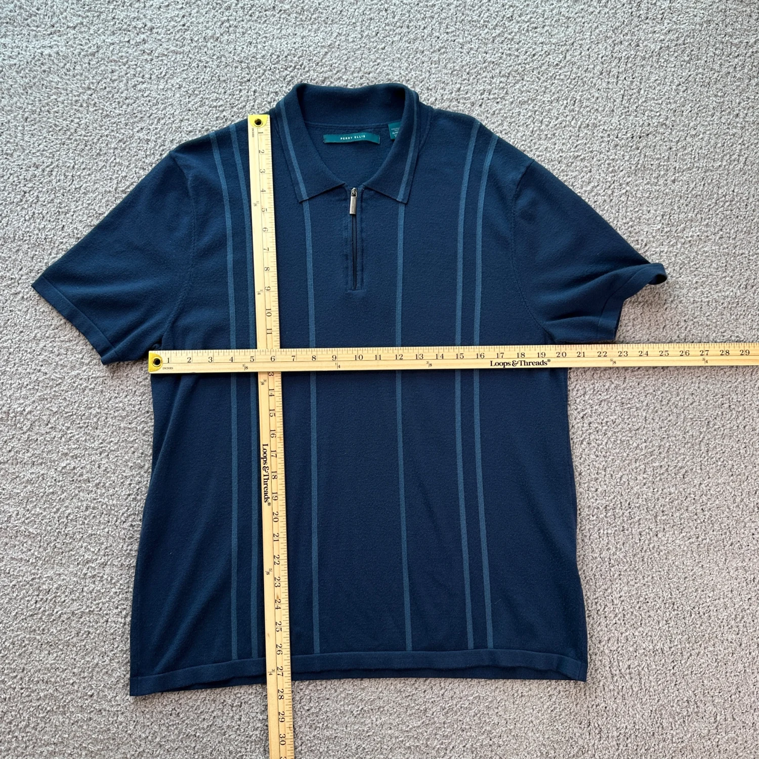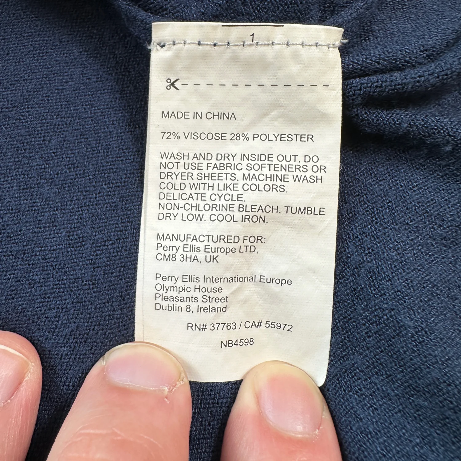 This is a Perry Ellis navy blue polo shirt featuring a ribbed design with a zippered neckline for a modern twist. It is made from a blend of 72% Viscose and 28% Polyester, ensuring comfort and breathability. The shirt is size XL, making it suitable for a relaxed fit. Care instructions include machine washing cold, delicate cycle, and tumble drying low. Ideal for casual and semi-formal occasions. #PerryEllis #PoloShirt #Menswear