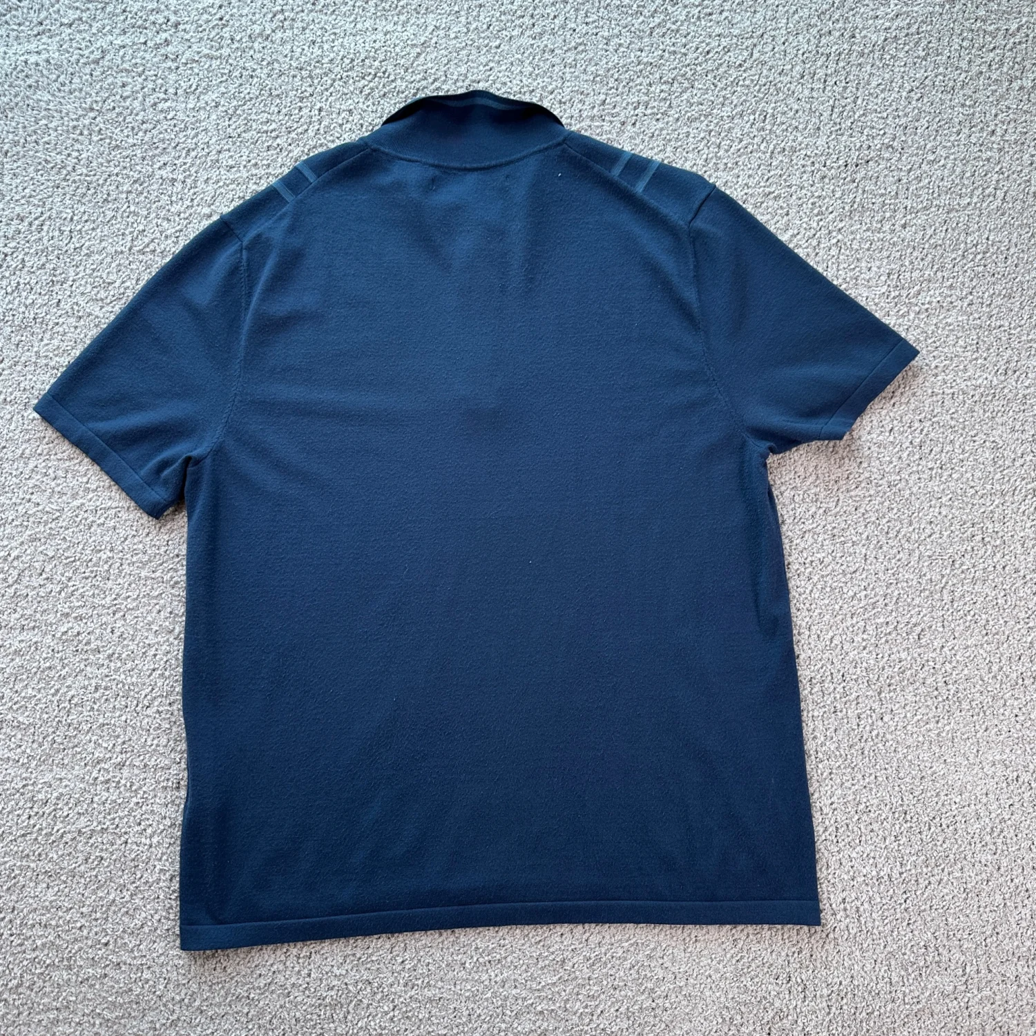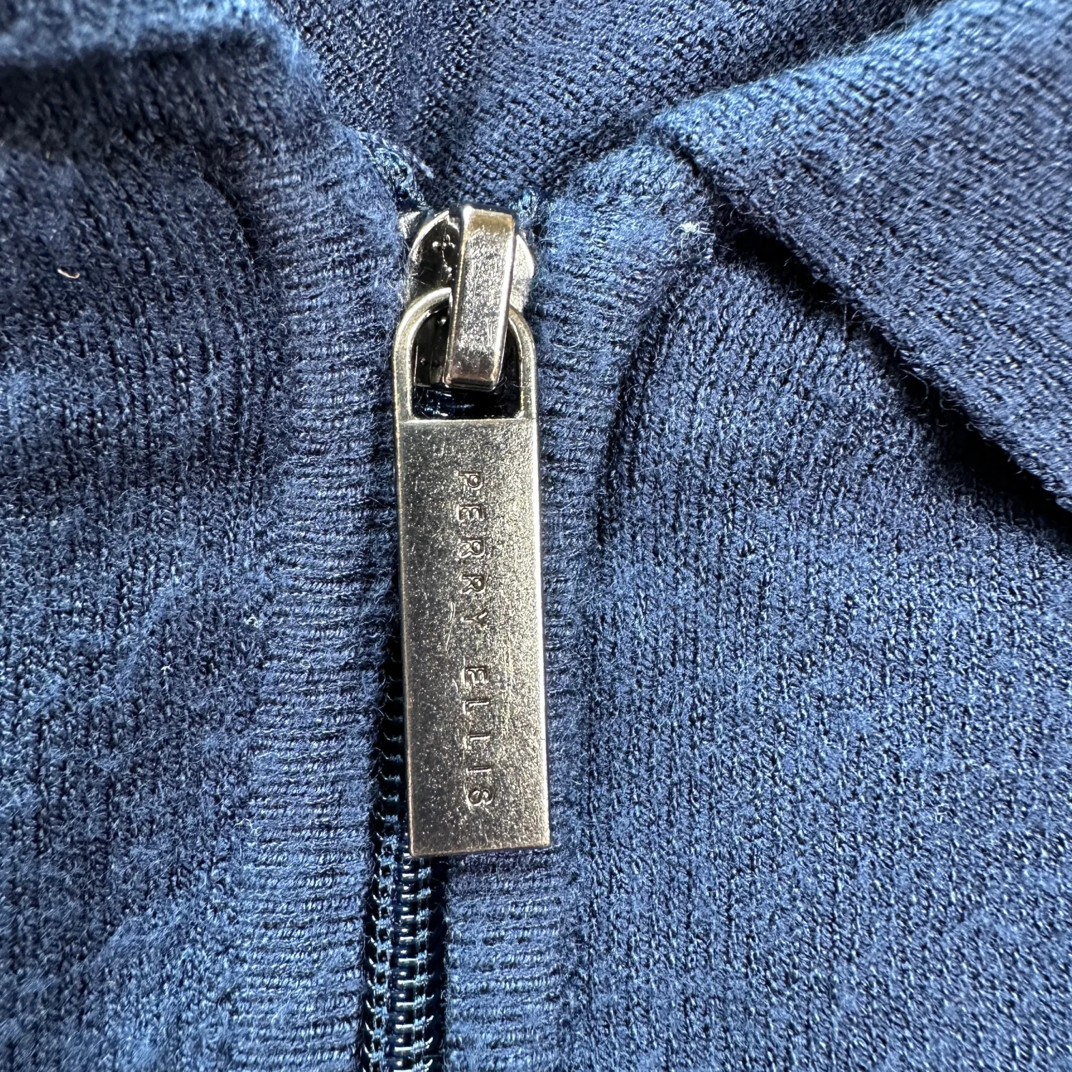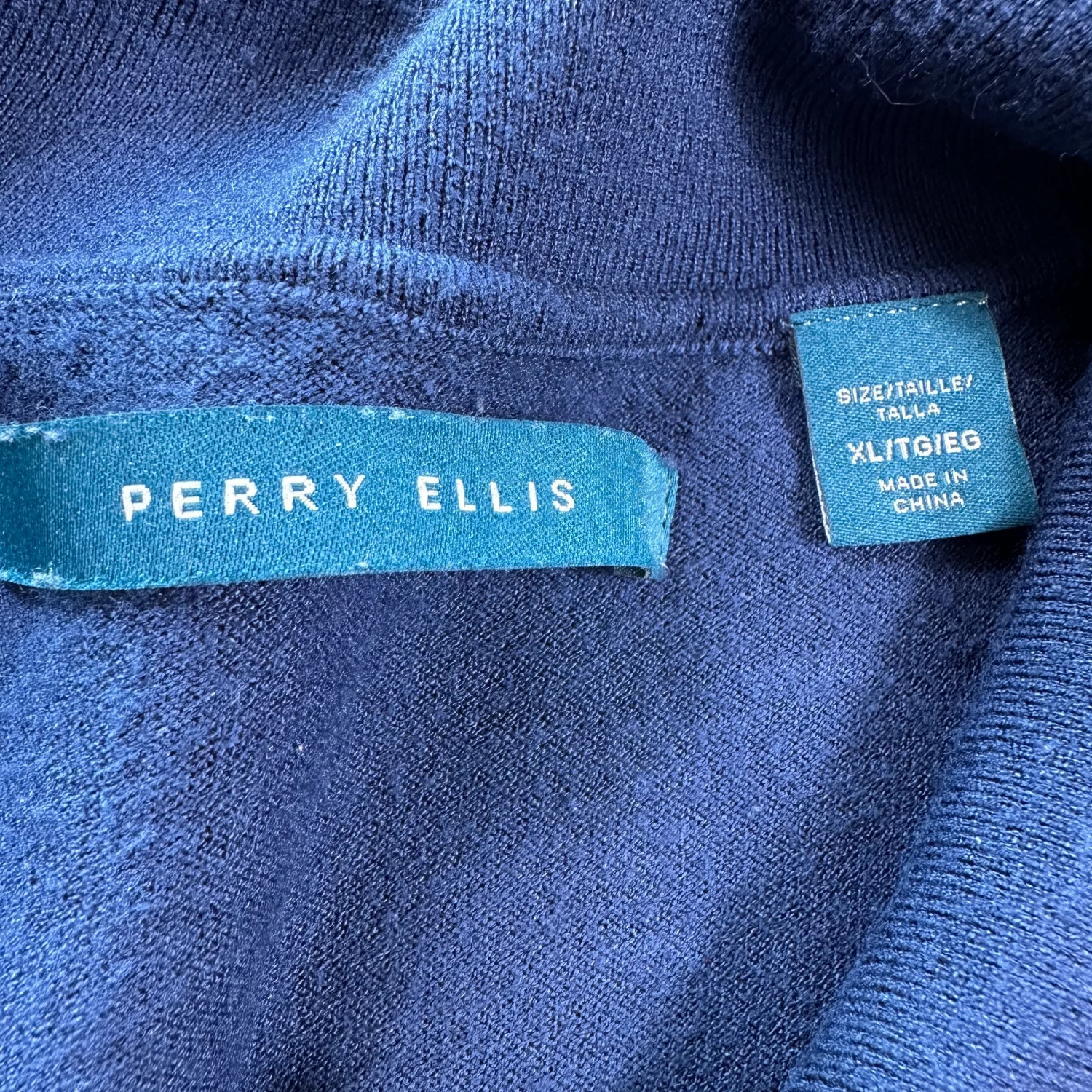 This is a Perry Ellis navy blue polo shirt featuring a ribbed design with a zippered neckline for a modern twist. It is made from a blend of 72% Viscose and 28% Polyester, ensuring comfort and breathability. The shirt is size XL, making it suitable for a relaxed fit. Care instructions include machine washing cold, delicate cycle, and tumble drying low. Ideal for casual and semi-formal occasions. #PerryEllis #PoloShirt #Menswear