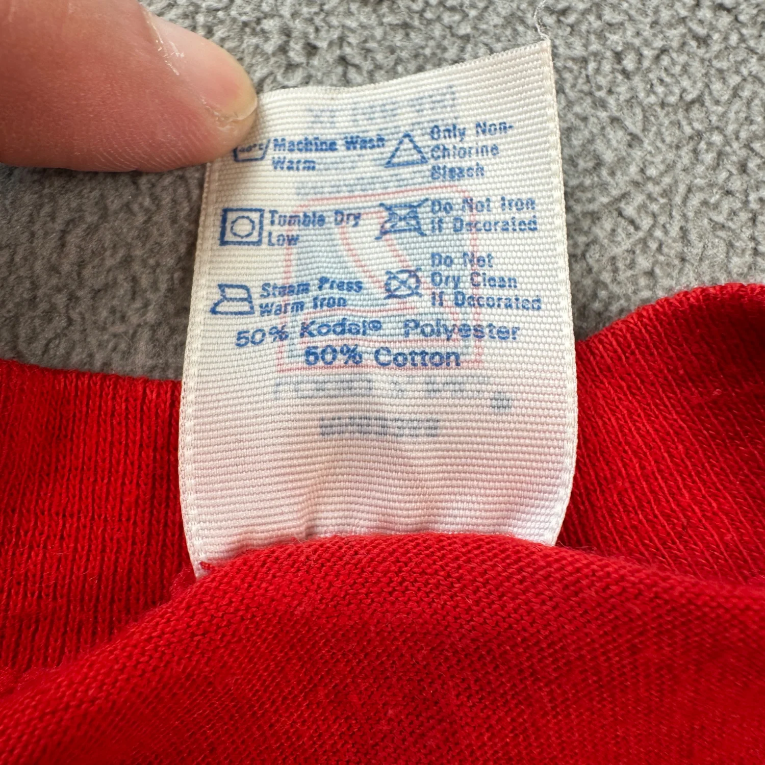 1986 Boston Red Sox World Series t-shirt featuring a bold front print. Made from a comfortable blend of 50% polyester and 50% cotton. This vintage t-shirt is perfect for fans and collectors. Tagged size XL (46-48). Care: Machine wash warm, tumble dry low. Do not bleach or iron decoration. #vintage #sports #RedSox