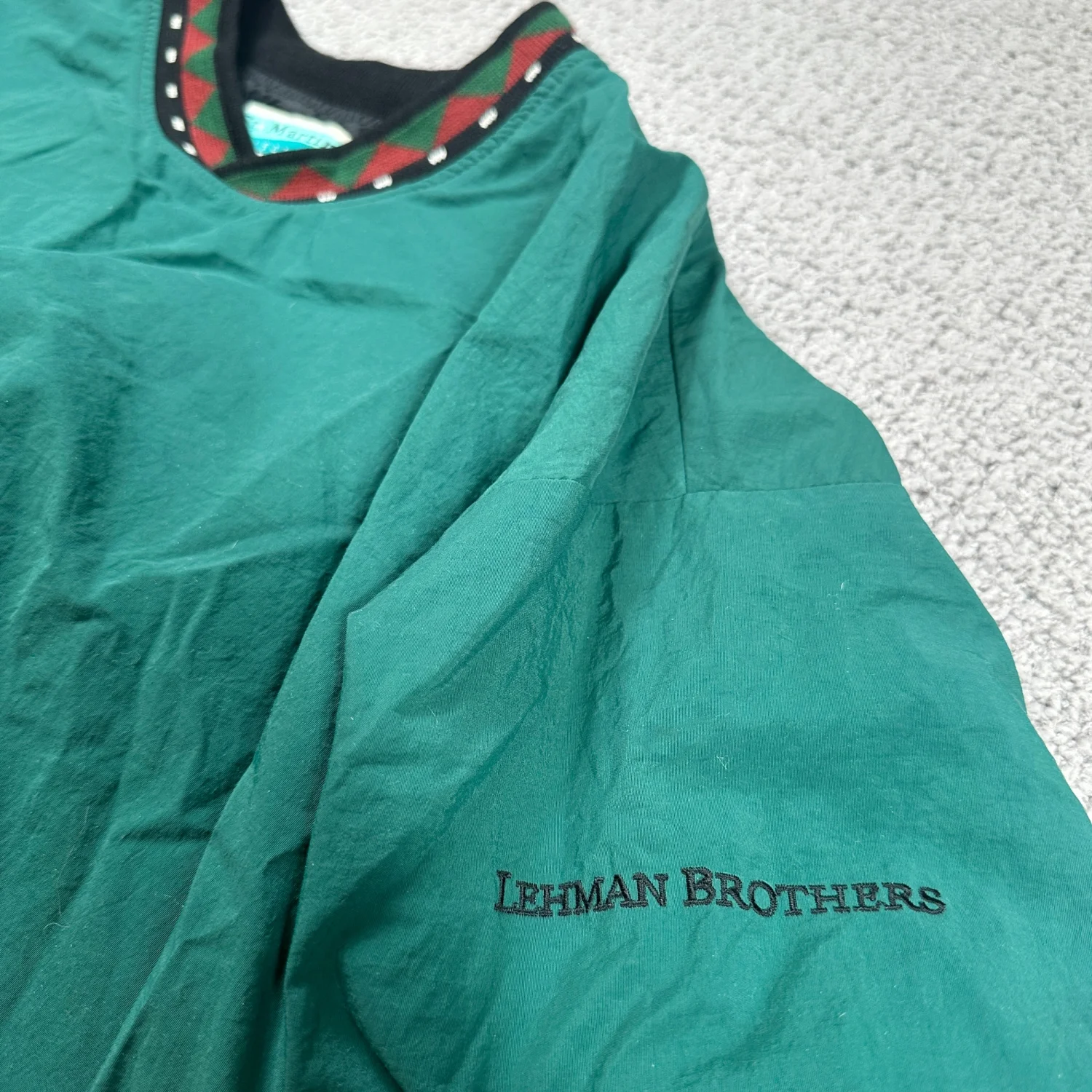 Wall Street / 2008 financial crisis” collectible corporate vintage vibe. Made in USA! Lehman Brothers = legendary Wall Street history. Rare embroidered corporate vintage piece. Vintage Lehman Brothers embroidered windbreaker pullover — a real piece of Wall Street history. Lehman filed for bankruptcy on Sept 15, 2008, the largest Chapter 11 in U.S. history and one of the defining moments of the 2008 financial crisis. This is the kind of corporate piece that feels like an artifact from that era. St. Martin Collection by Turfer pullover with patterned rib trim at collar/cuffs/hem. Lightweight nylon shell. Condition: pre-owned with normal wear. Rare finance / corporate vintage collectible — honestly a conversation starter.