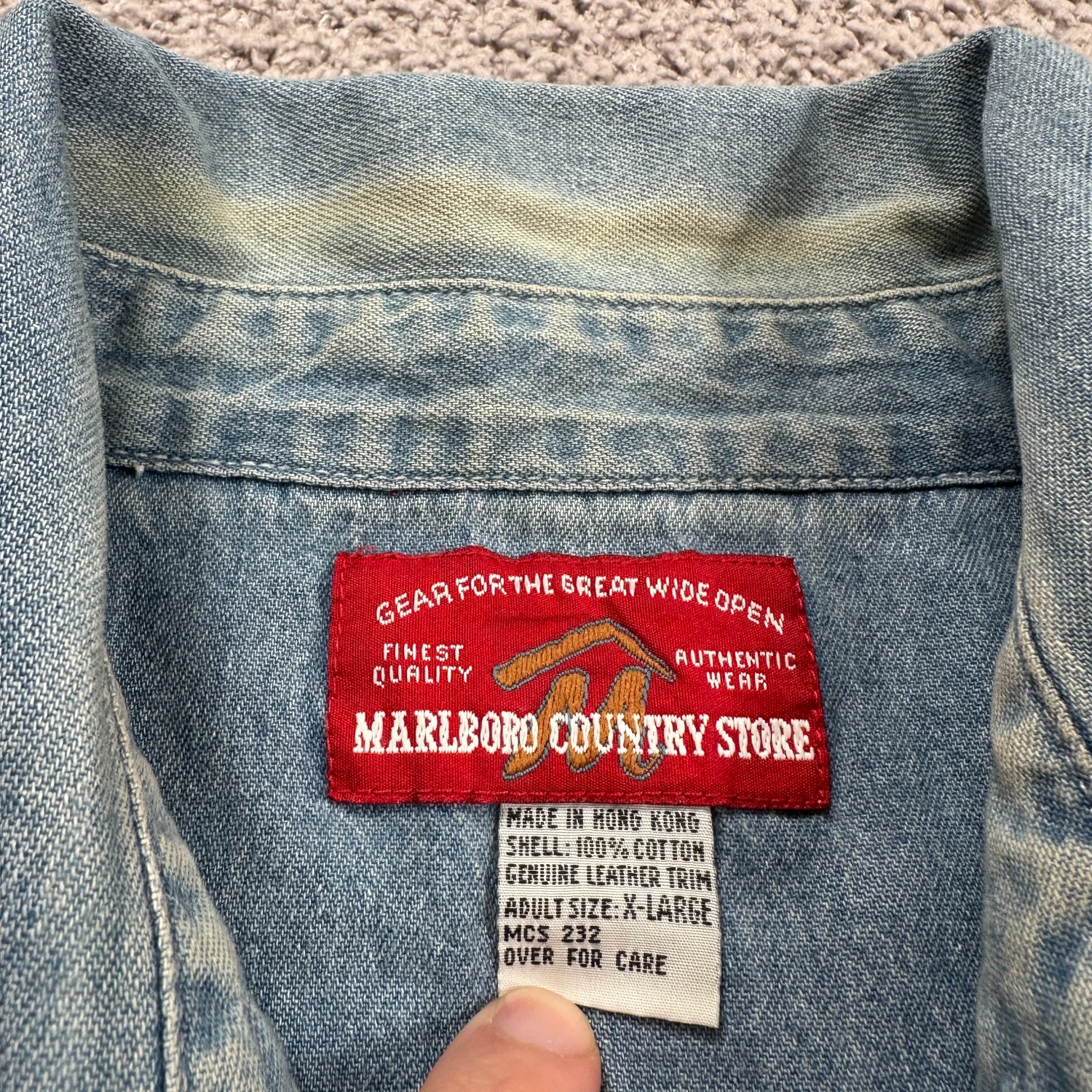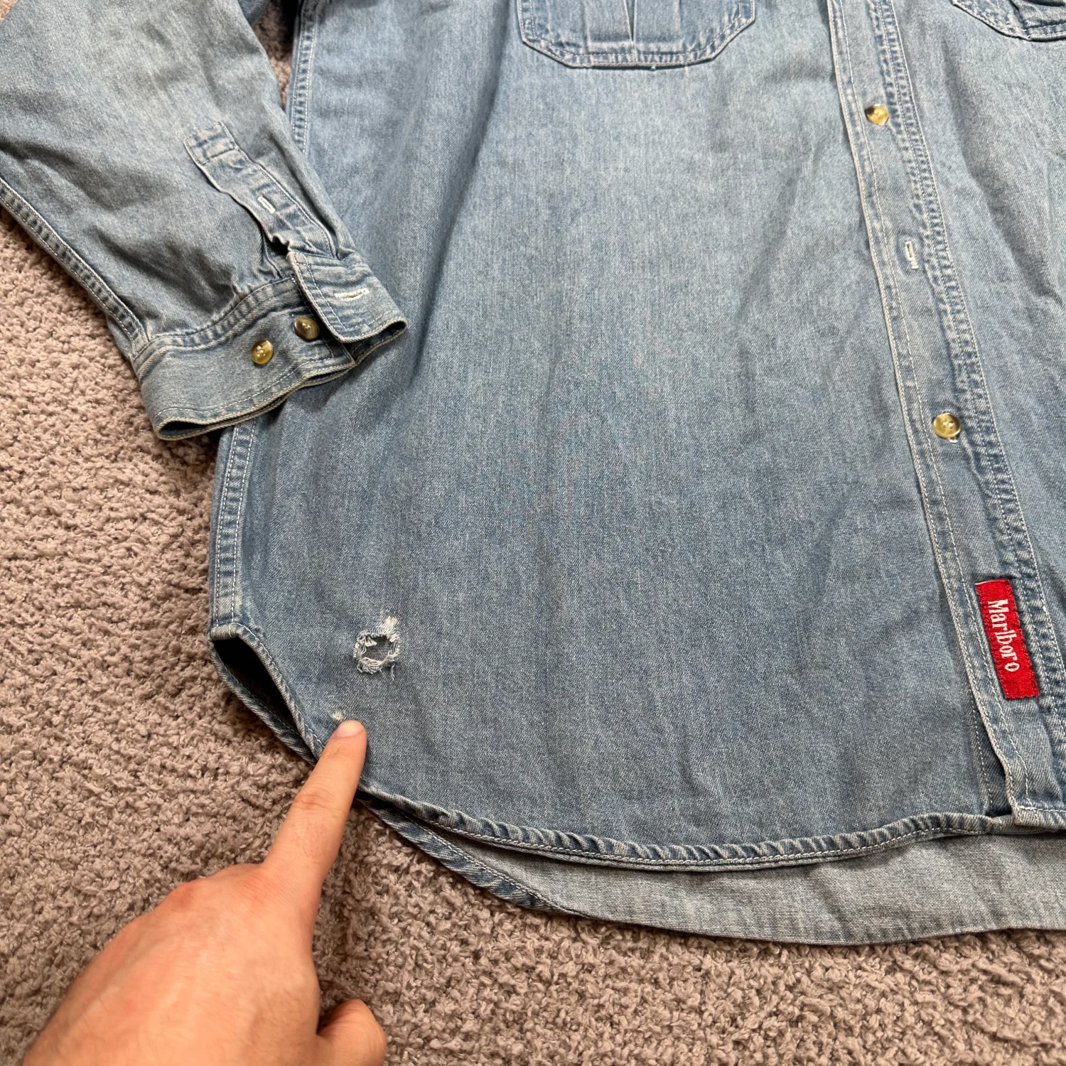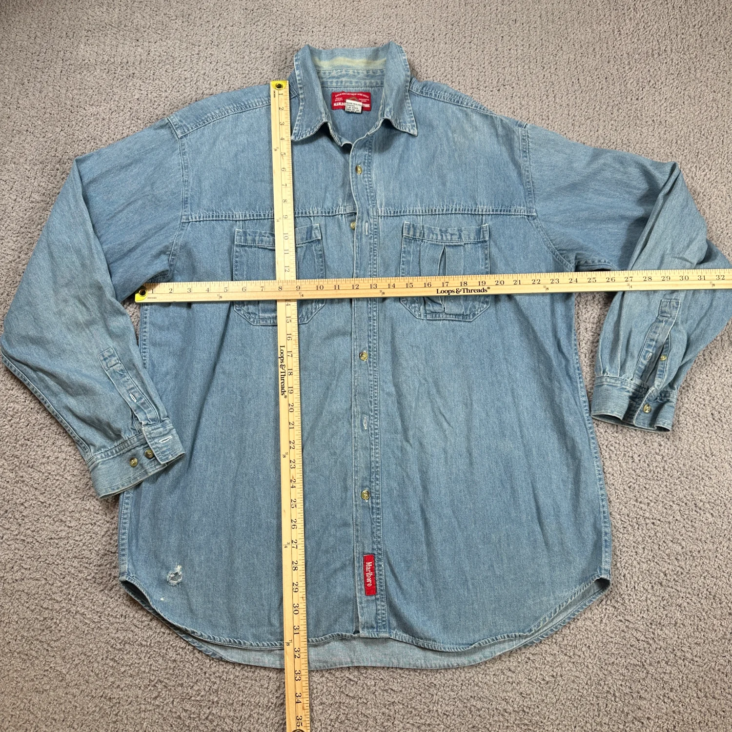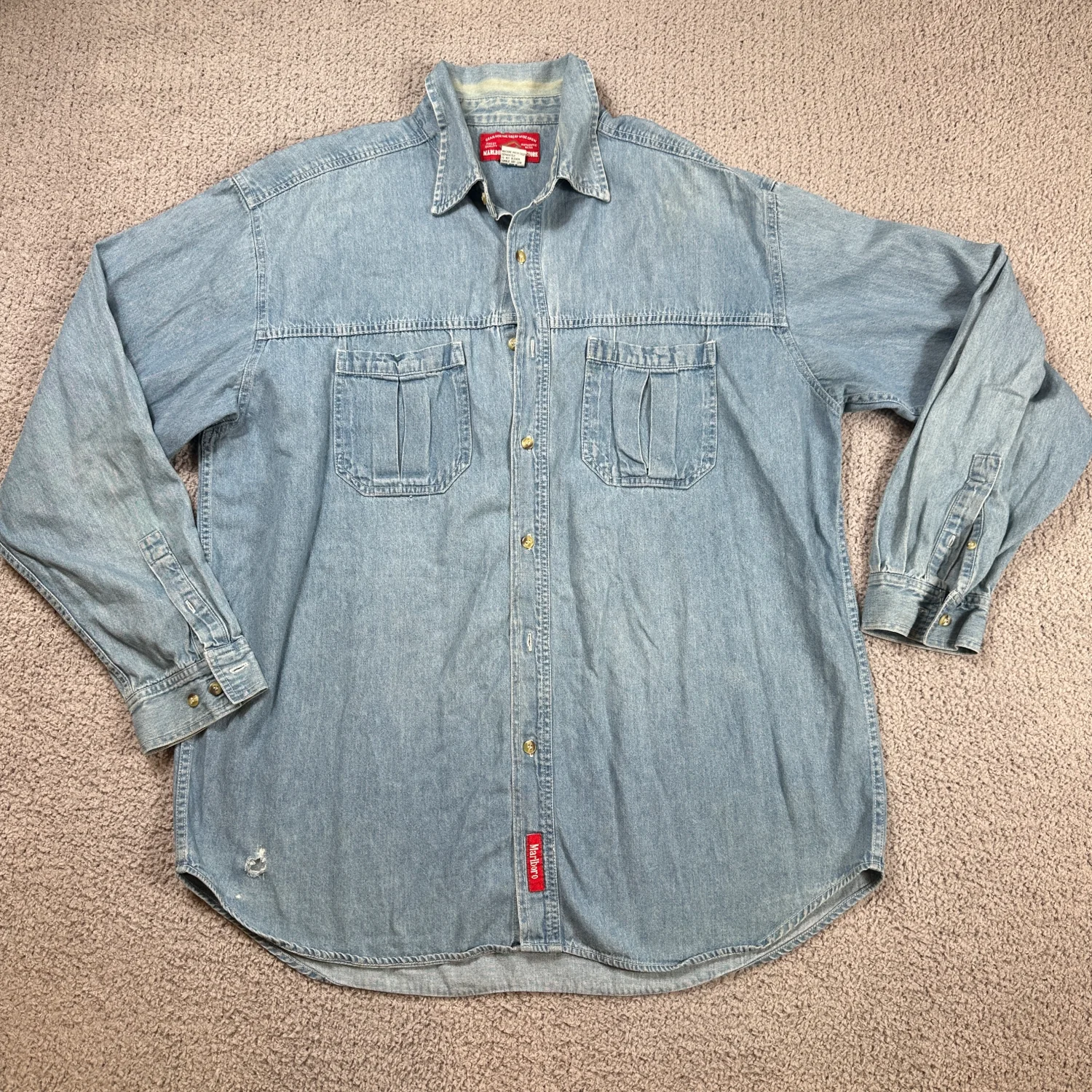 Era: Late 1990s – early 2000s (post-Miles, Country Store era) • Red Marlboro hem tag (big plus) • Heavyweight denim • Two chest pockets • Leather trim detail on tag • Classic relaxed Western/workwear cut Shows authentic vintage wear with one small hole near the lower hem (pictured), otherwise in good condition for age. Perfect for Americana, Western, workwear, and Marlboro collectors. Sleeve Length: Long Sleeve Fabric Type: Denim Closure: Button Accents: Button, Embroidered Pattern: Solid Theme: Cowboy Material: Cotton Features: Pockets Collar Style: Button-Down Type: Button-Up Neckline: Collared Occasion: Casual Season: Fall, Spring, Summer Menswear, Casual, Workwear, Outdoor, Country, XL, Rugged, Distressed I answer most questions instantly! Please don't hesitate to contact us if you have any questions, we will be glad to answer! Thank you for shopping!