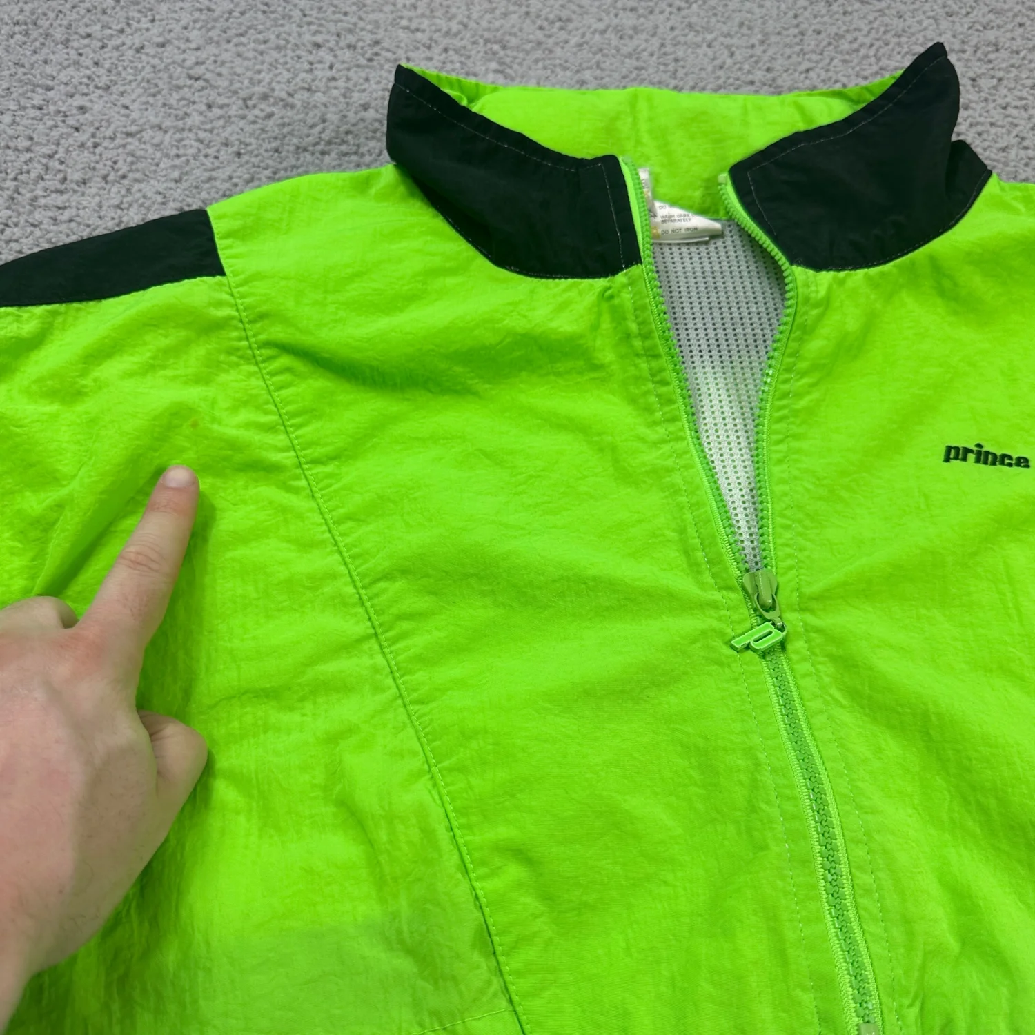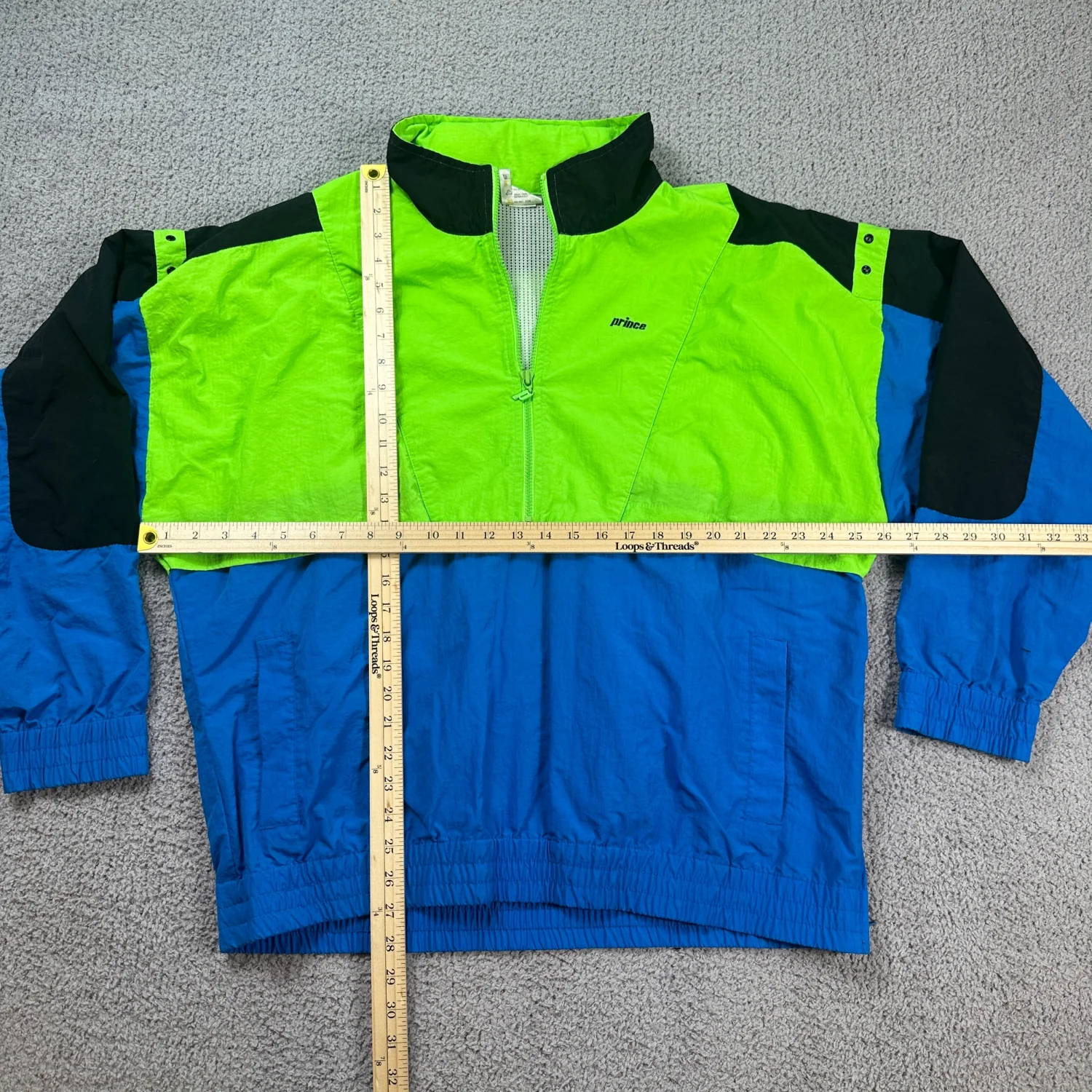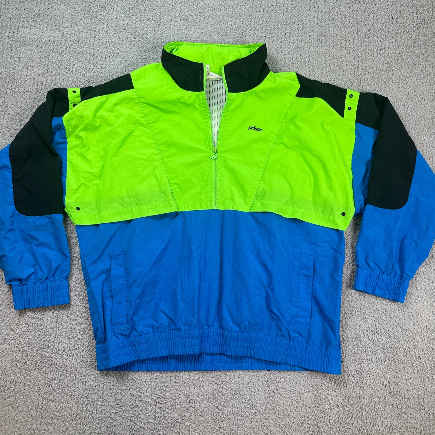 Classic 90s tennis / retro sportswear look. Vintage Prince Performance Apparel pullover windbreaker in neon green/blue/black colorblock. Lightweight with breathable mesh lining, 1/2 zip front, elastic cuffs/hem, and zip pocket detail. Size: XL (see measurements) Measurements: approx. 26” pit to pit, 28” length Condition: Good vintage condition with light wear and a small mark on chest (see photos).