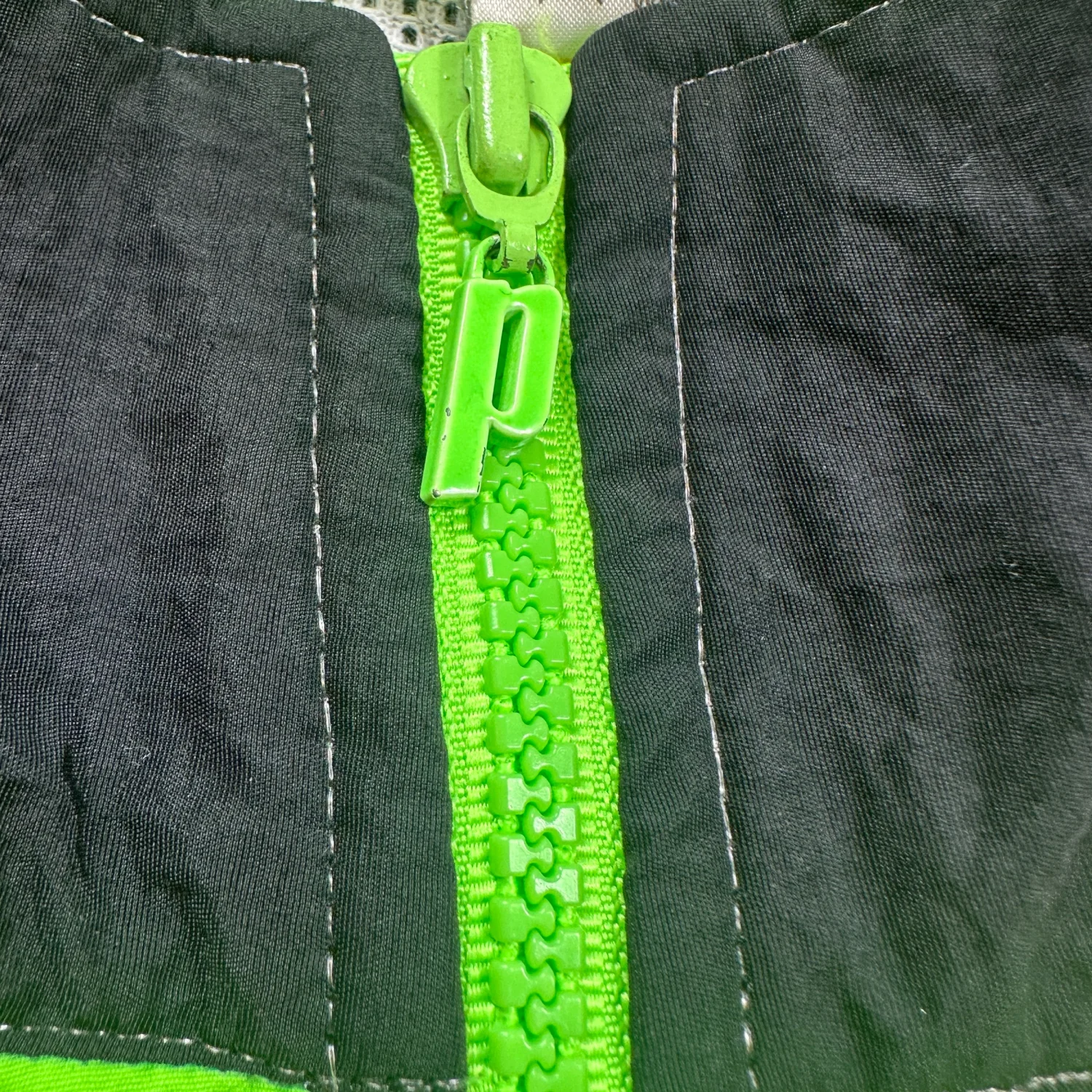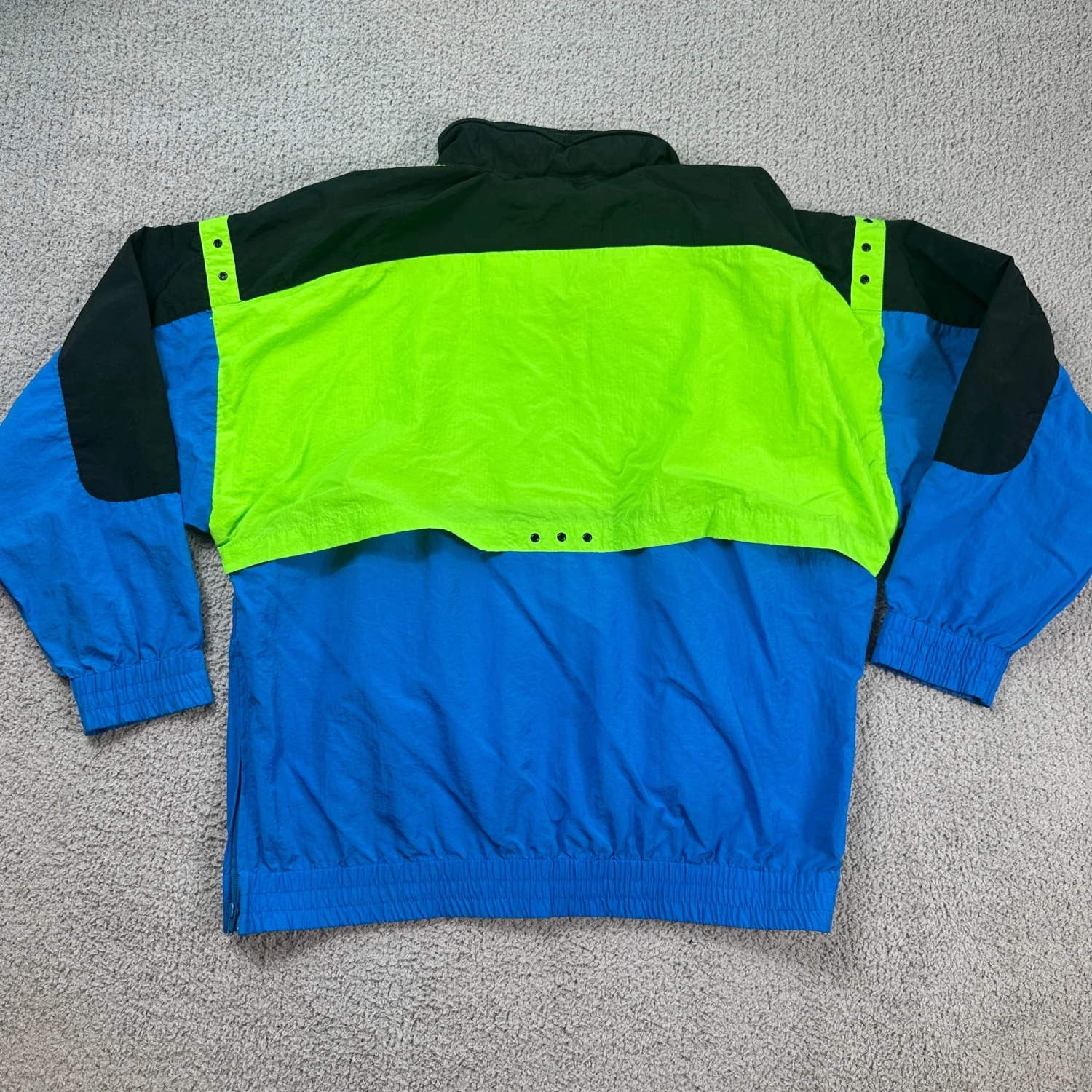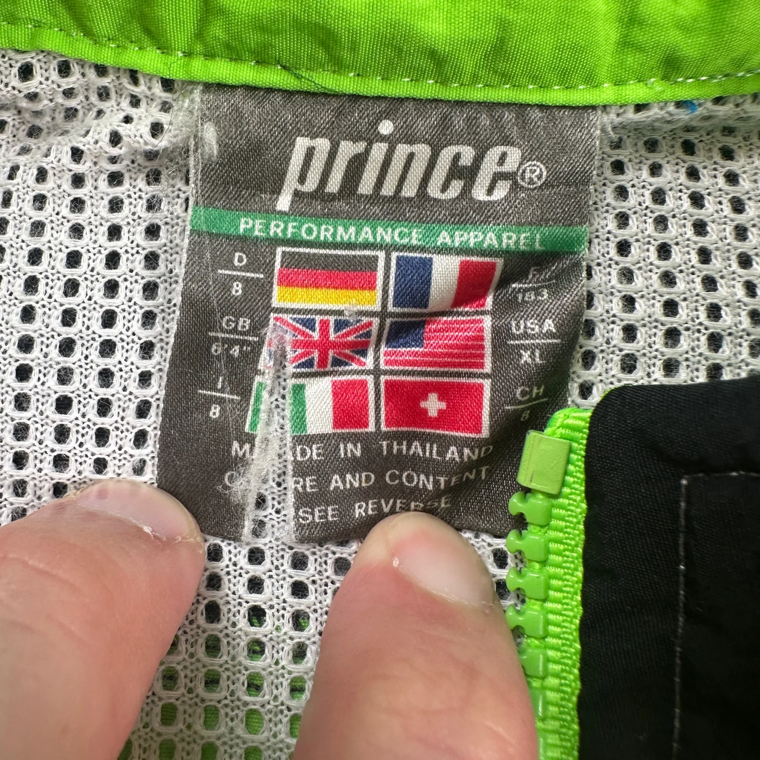 Classic 90s tennis / retro sportswear look. Vintage Prince Performance Apparel pullover windbreaker in neon green/blue/black colorblock. Lightweight with breathable mesh lining, 1/2 zip front, elastic cuffs/hem, and zip pocket detail. Size: XL (see measurements) Measurements: approx. 26” pit to pit, 28” length Condition: Good vintage condition with light wear and a small mark on chest (see photos).
