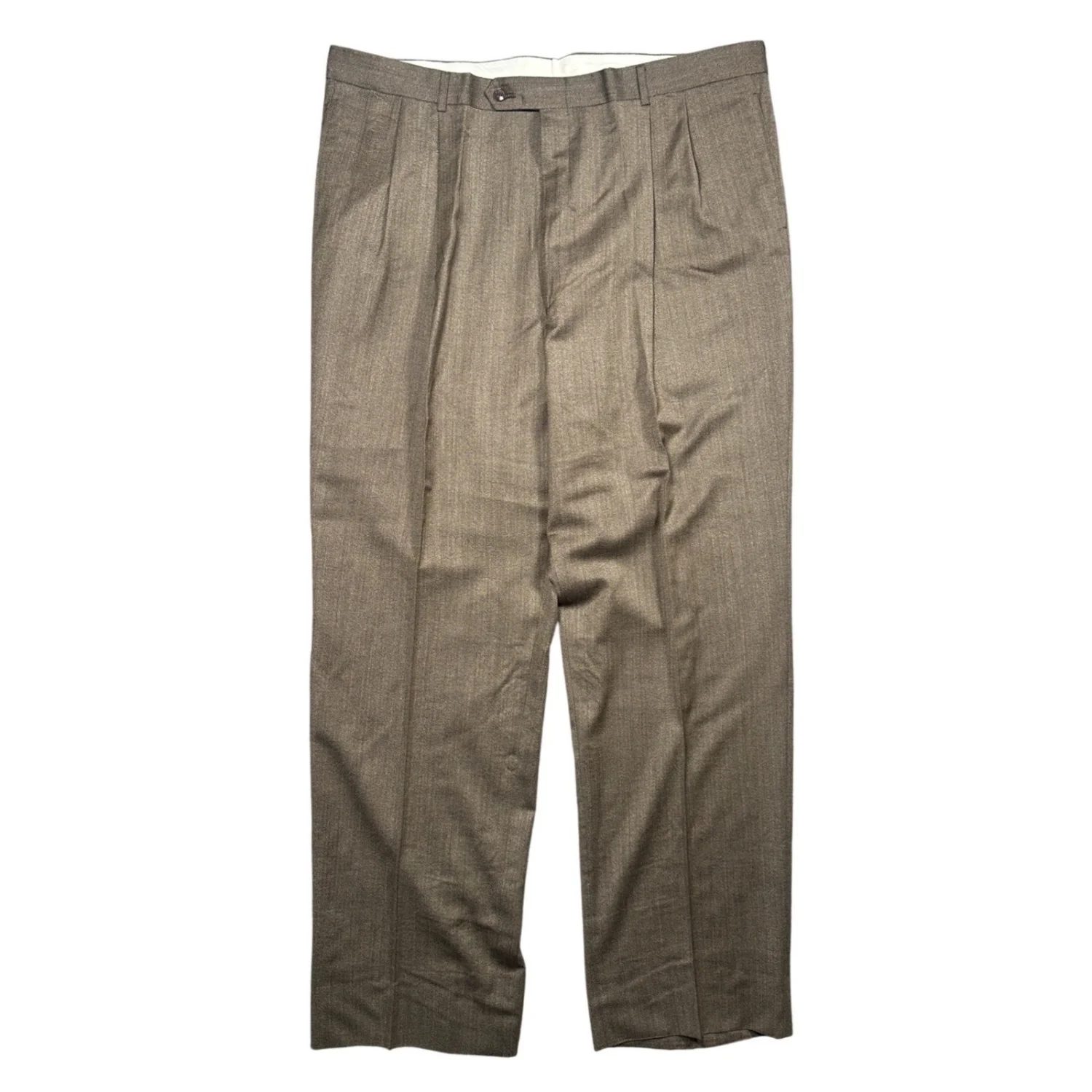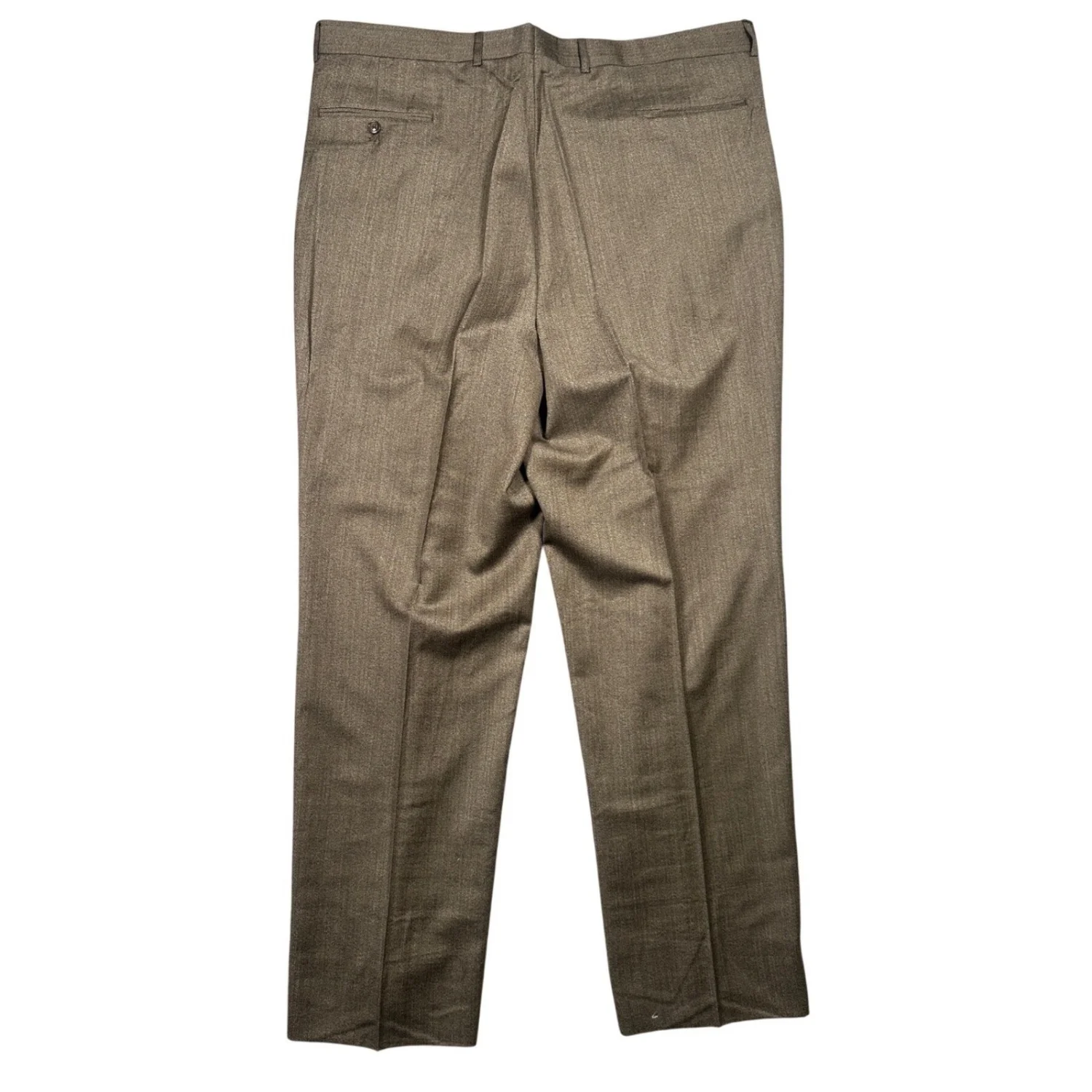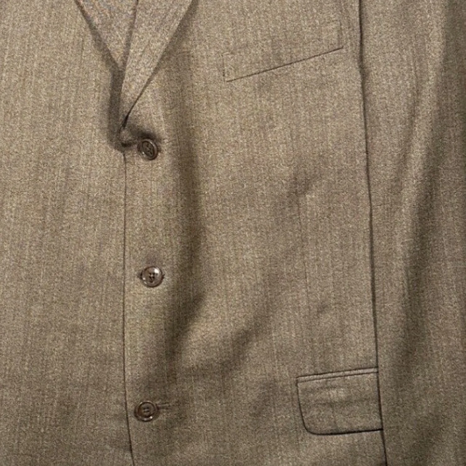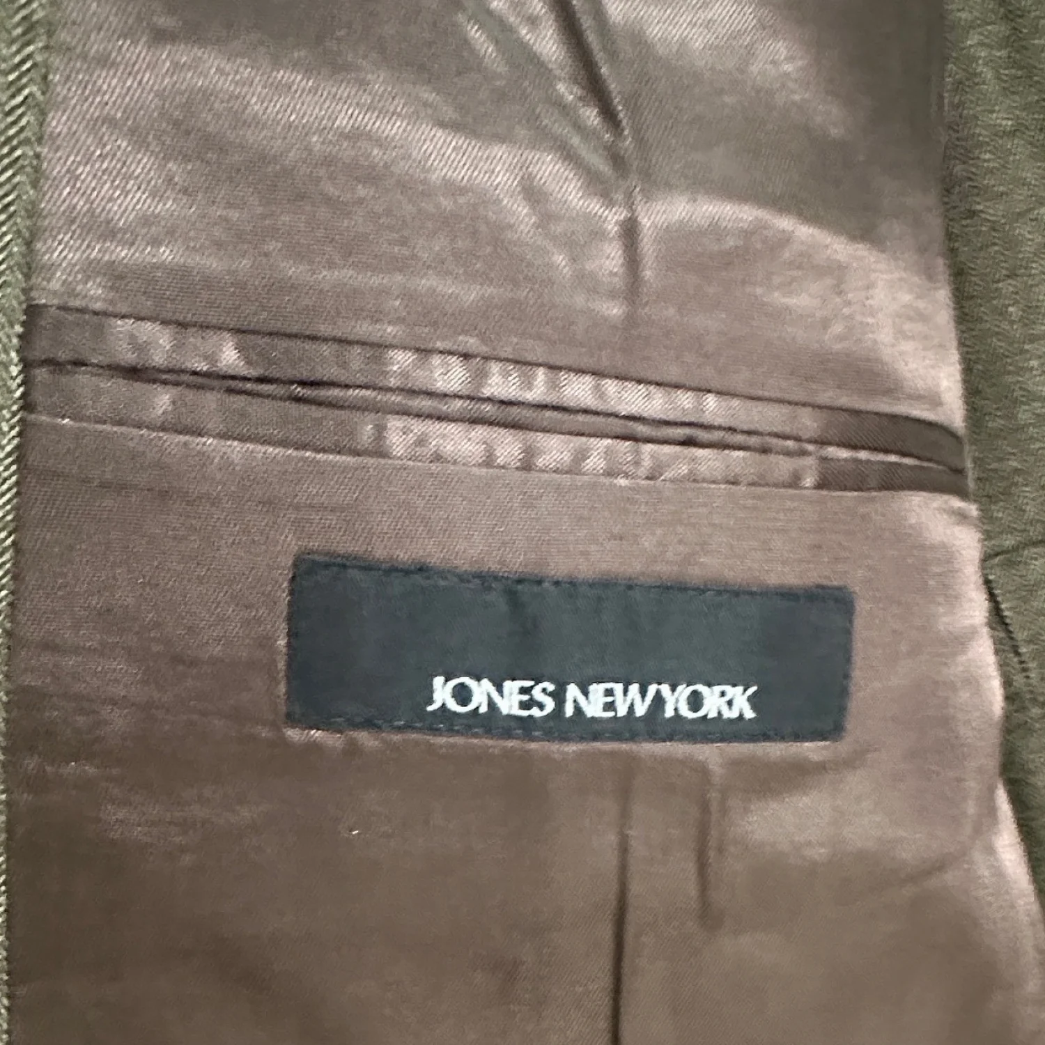 Jones New York three-piece suit crafted from a textured brown fabric with a subtle herringbone or sharkskin-like weave. This classic ensemble includes a three-button blazer with a notch lapel and flap pockets, a matching five-button vest with a pointed hem, and pleated trousers featuring a traditional straight-leg cut. Brand: Jones New York Product Type: 3-Piece Suit Material: Wool Blend (inferred) Pattern: Textured / Micro-pattern Jacket Style: 3-Button Pant Style: Pleated Front Vest Style: 5-Button Color: Brown / Taupe Measurements: Chest Width: 25" Sleeve Length: 27.5" Shoulder Width: 21" Center Back Length: 33.5" Waist: 20.5" (41") Front Rise: 13.5" Outseam: 46" Inseam: 33" Keywords: Business Professional, Corporate, Wedding, Formal, Classic, Traditional, Office Wear Shop take2supply - Quality-checked, Fast 2-day shipping, 30-day returns. Follow @take2supply!