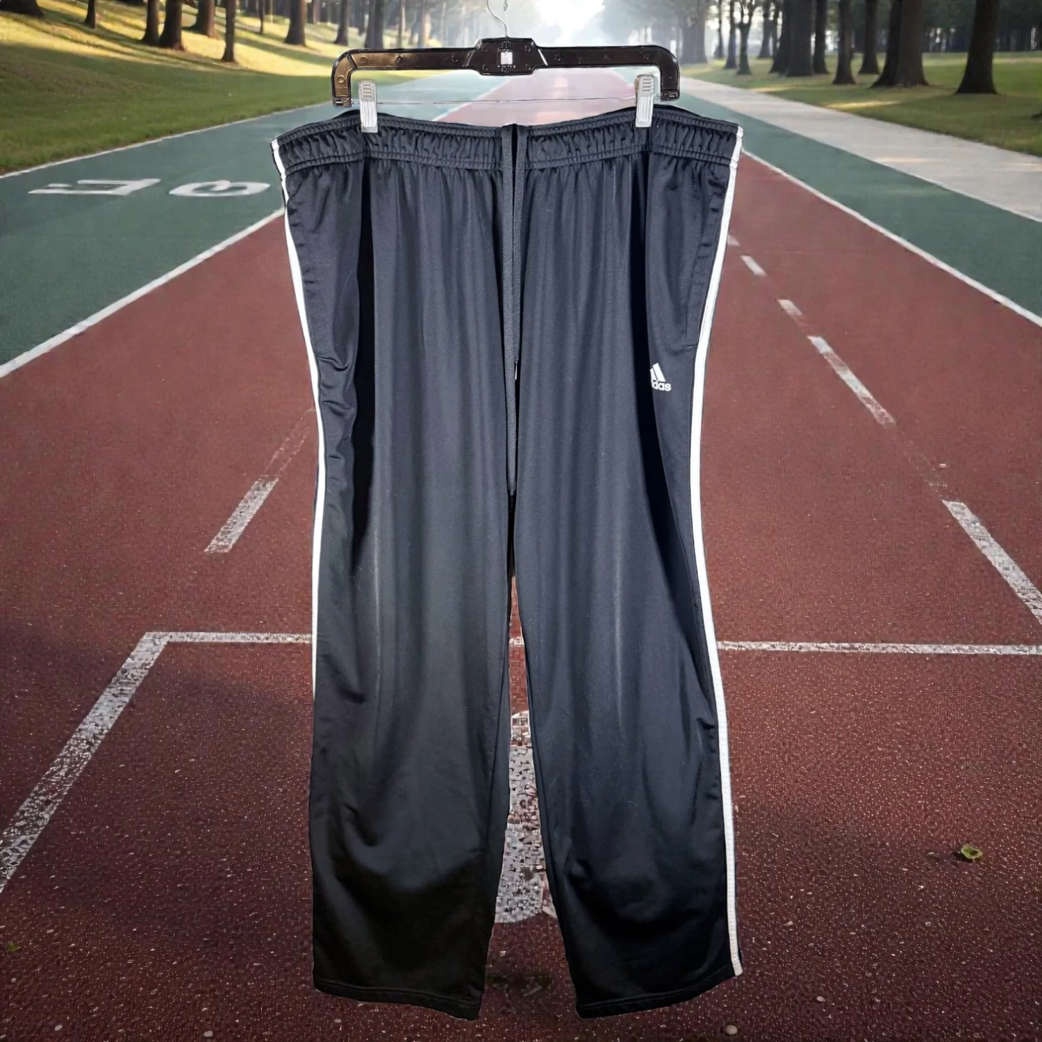 Featuring the classic 3 stripes on each side of the pants and the logo on the front, these great pants are ready for lounging, everyday wear, or for your workout. They are in good preowned condition with mild wear. See pictures for details . Measurements waist 40.5" rise 12.5" inseam 31.5" Keywords: athleisure, lounge, jogging, gym, exercise, comfort P20260015 2