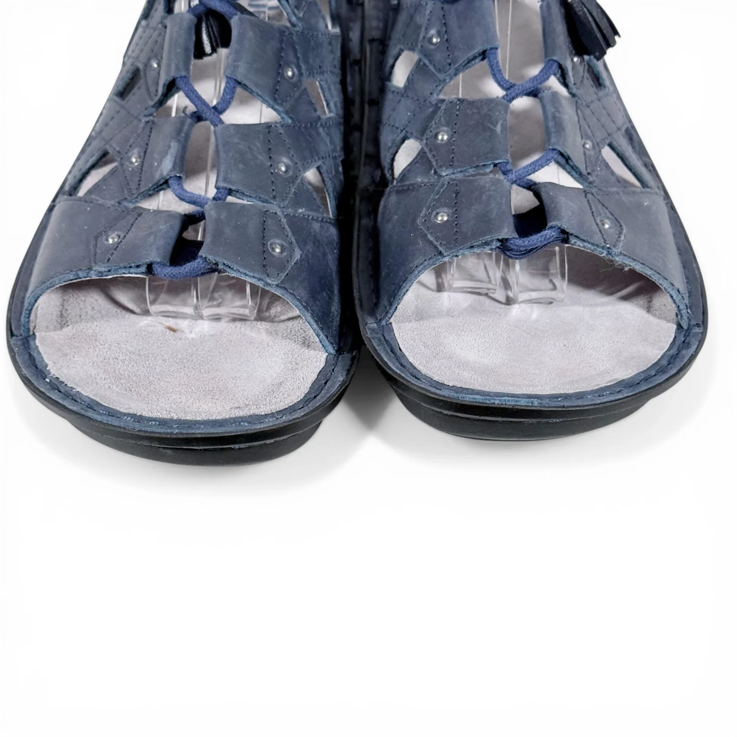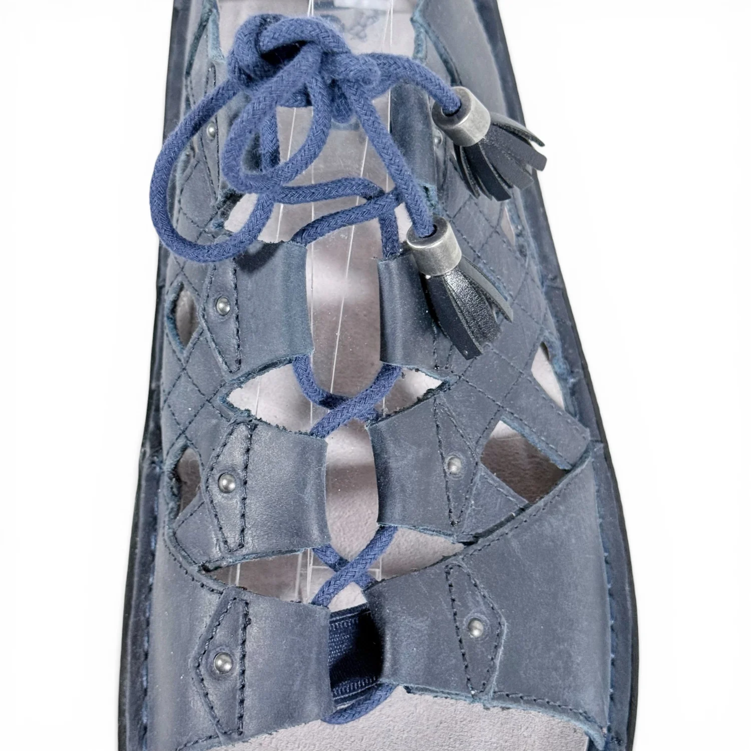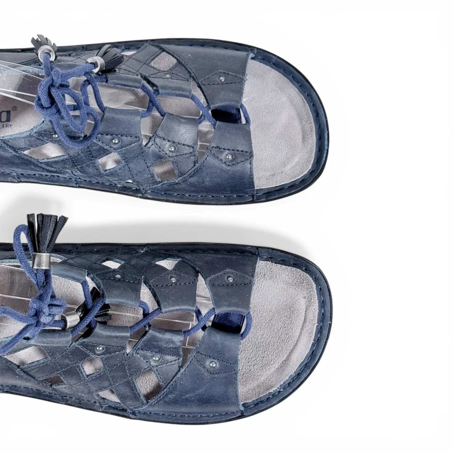 Sandals are in good preowned condition with scuffing on back. *lace up gladiator look with tassels at end of each lace. *dark navy blue in color *has comfort insole See pictures for details. Keywords: boho, casual, brunch, comfort, walking, travel, vacation, summer P20260069 S