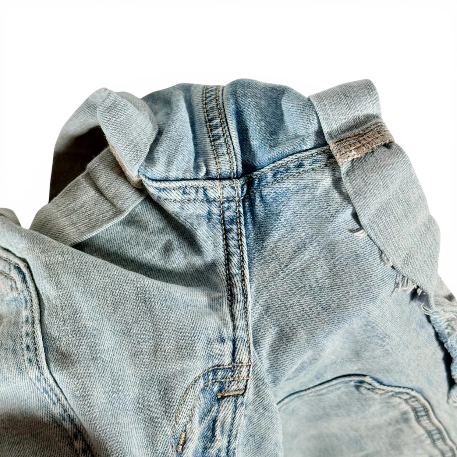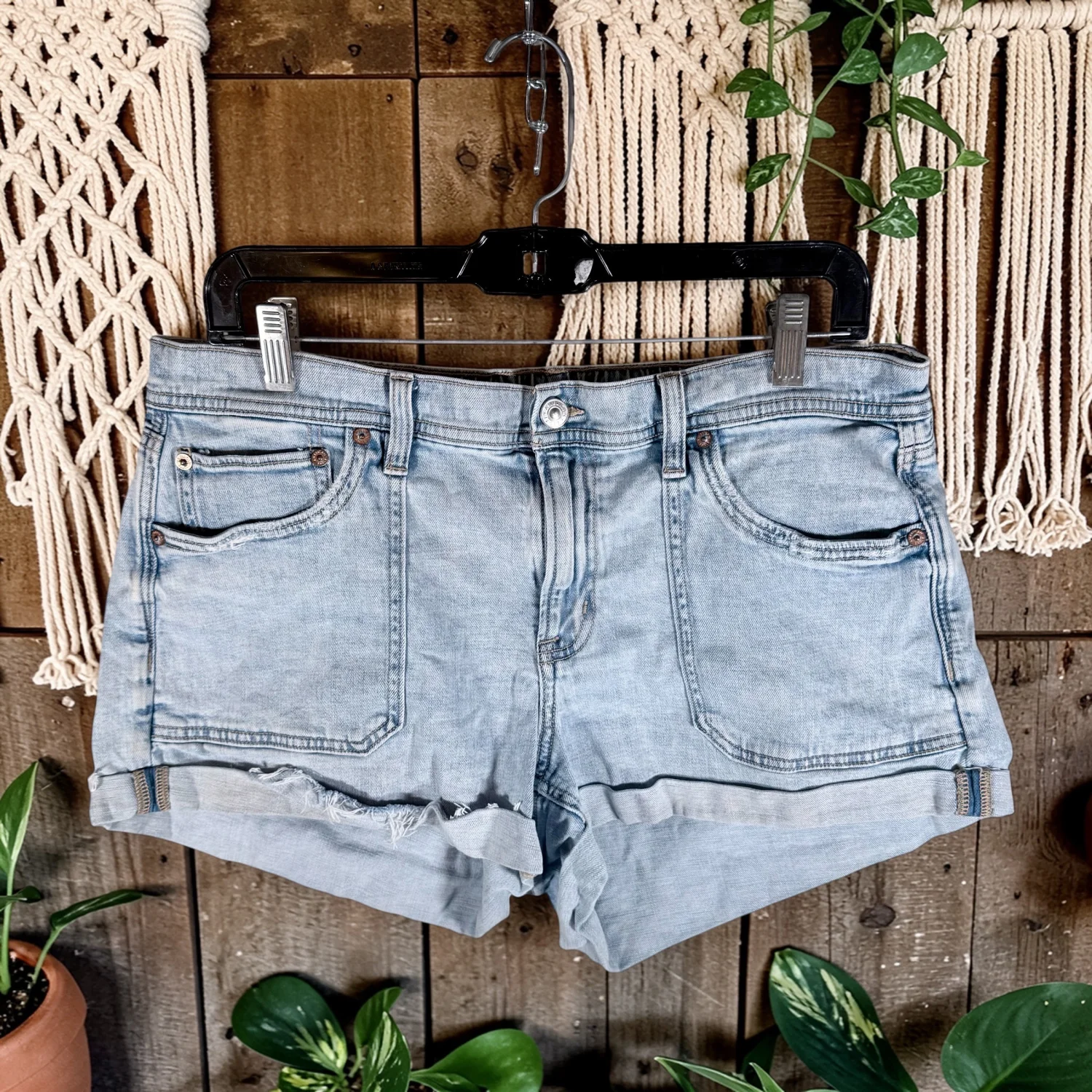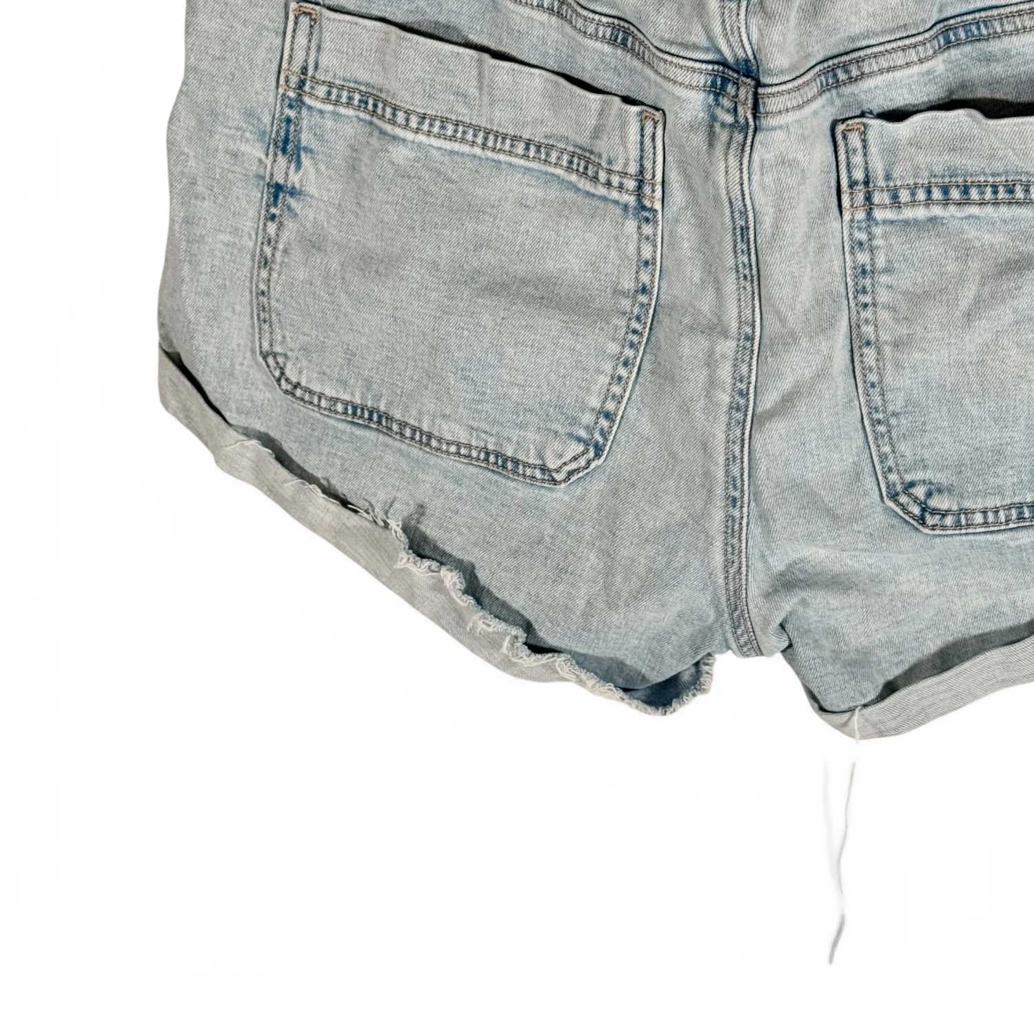 Great shorts featuring a raw hem that can be rolled up, slight distressing, and elastic waist in the back. Light distressed wash. Excellent preowned condition. See pictures for details. Measurements waist 33" rise 9.5" inseam 2.5" leg opening 12" Keywords: casual, festival, beachy, boho, stretch, closet essential, hippie, concert P20260048 7