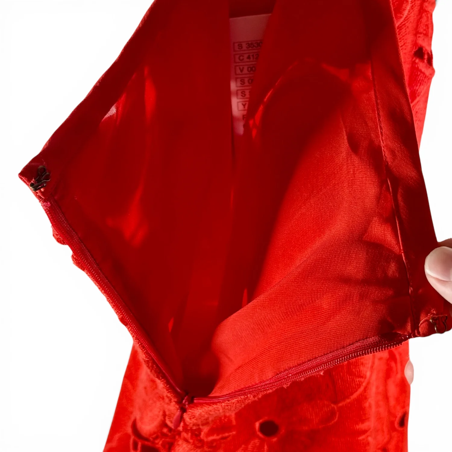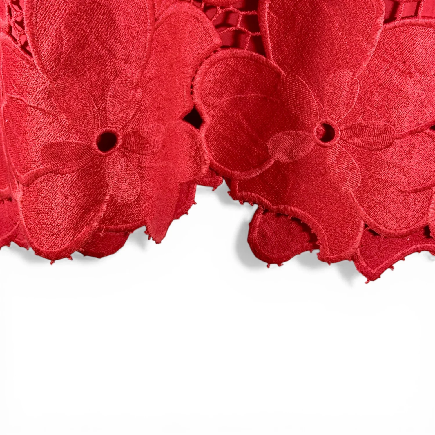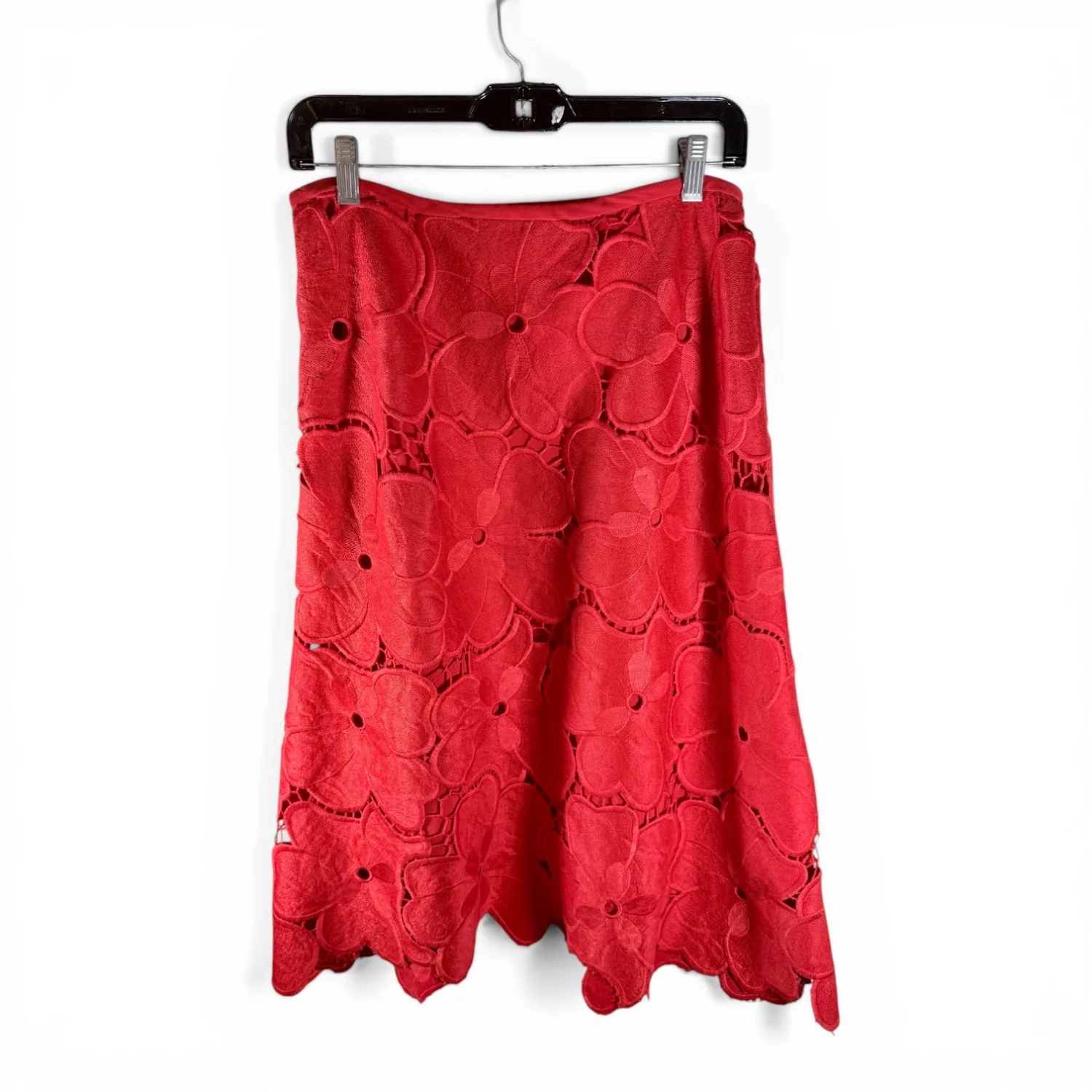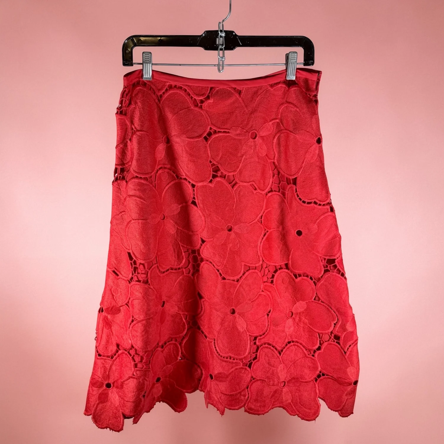 A great pop of color four your outfit, this red skirt is lined in red and features big red flowers intertwined with red lace threading. Features a hook & eye and zip closures on left side. Generally in new condition, but has a couple of snags on one pedal from storage. See pictures for details. Keywords: boho, feminine, business casual, floral, date night, A-line skirt, romantic, vibrant, artsy, poppy, church, office, flirty Measurements waist 28" length 27.5" P20260062 8