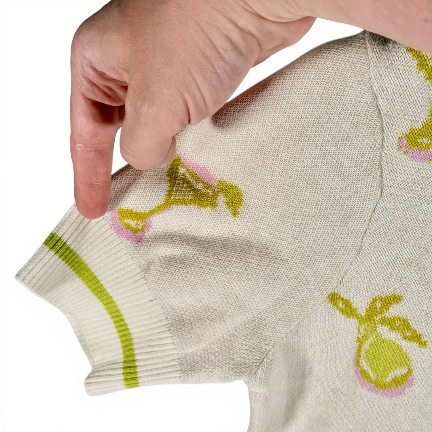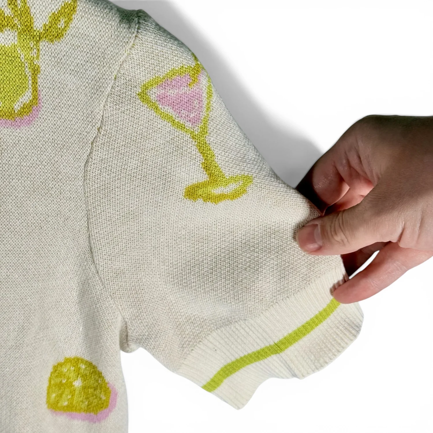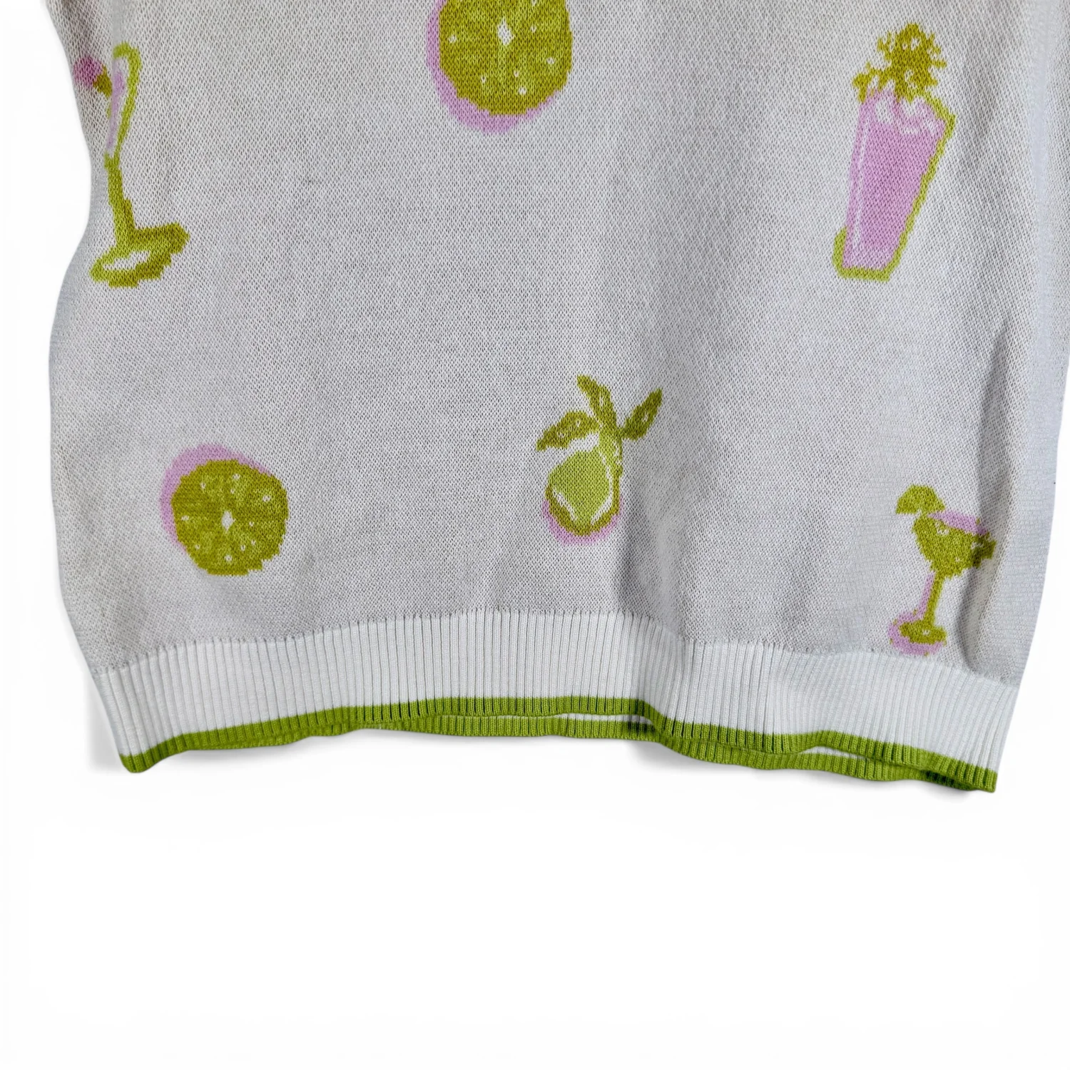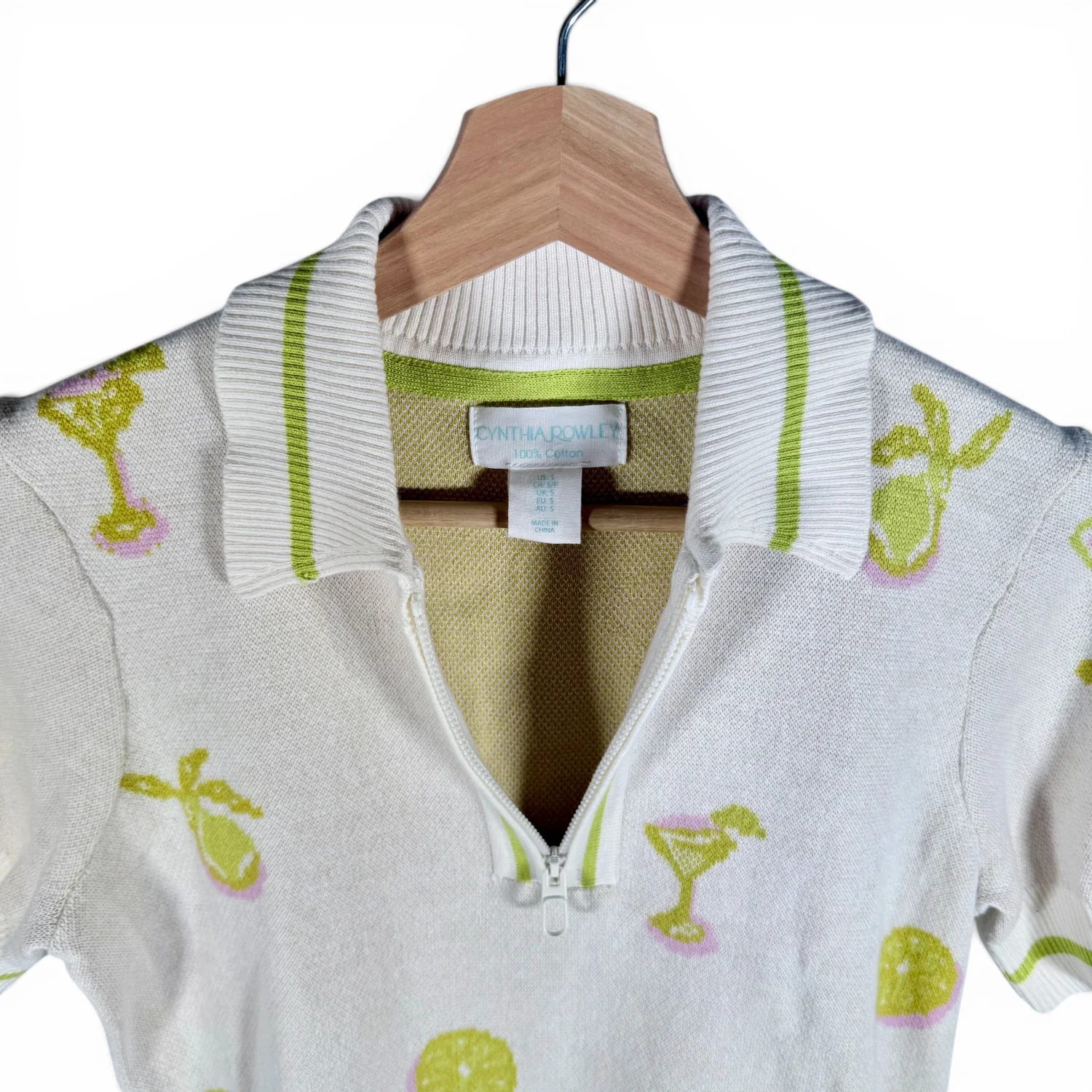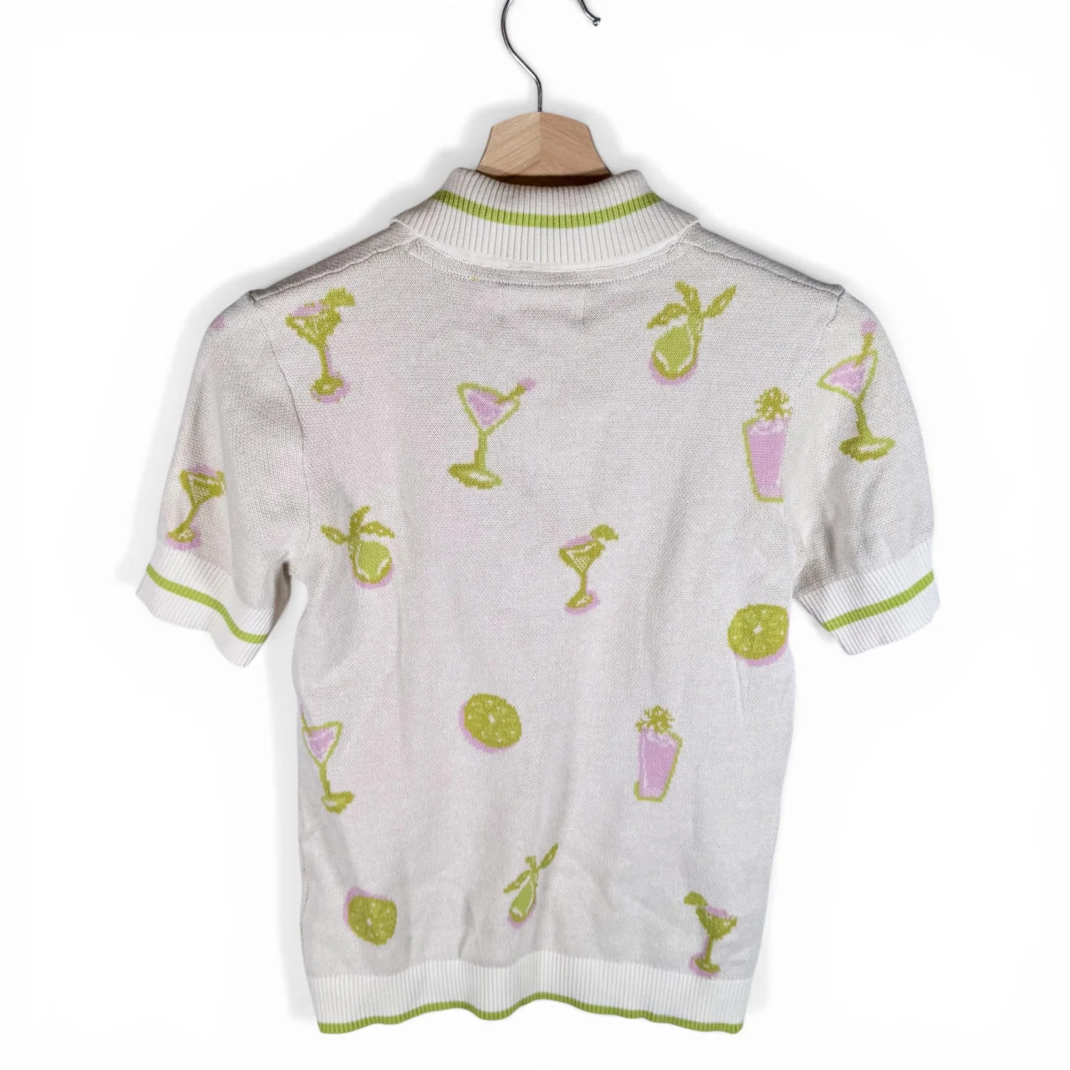 Very cool short-sleeved sweater! Features: *100% cotton fabric in cream with green accents *Fun print featuring cocktails and cocktail glasses *quarter zip in the front *retro style cut with short (almost half) sleeves This sweater is in excellent preowned condition. See pictures for details. Measurements armpit to armpit 17" length 23" Keywords: party, casual, preppy, comfort, spring, layering piece, minimalist P20260053 8