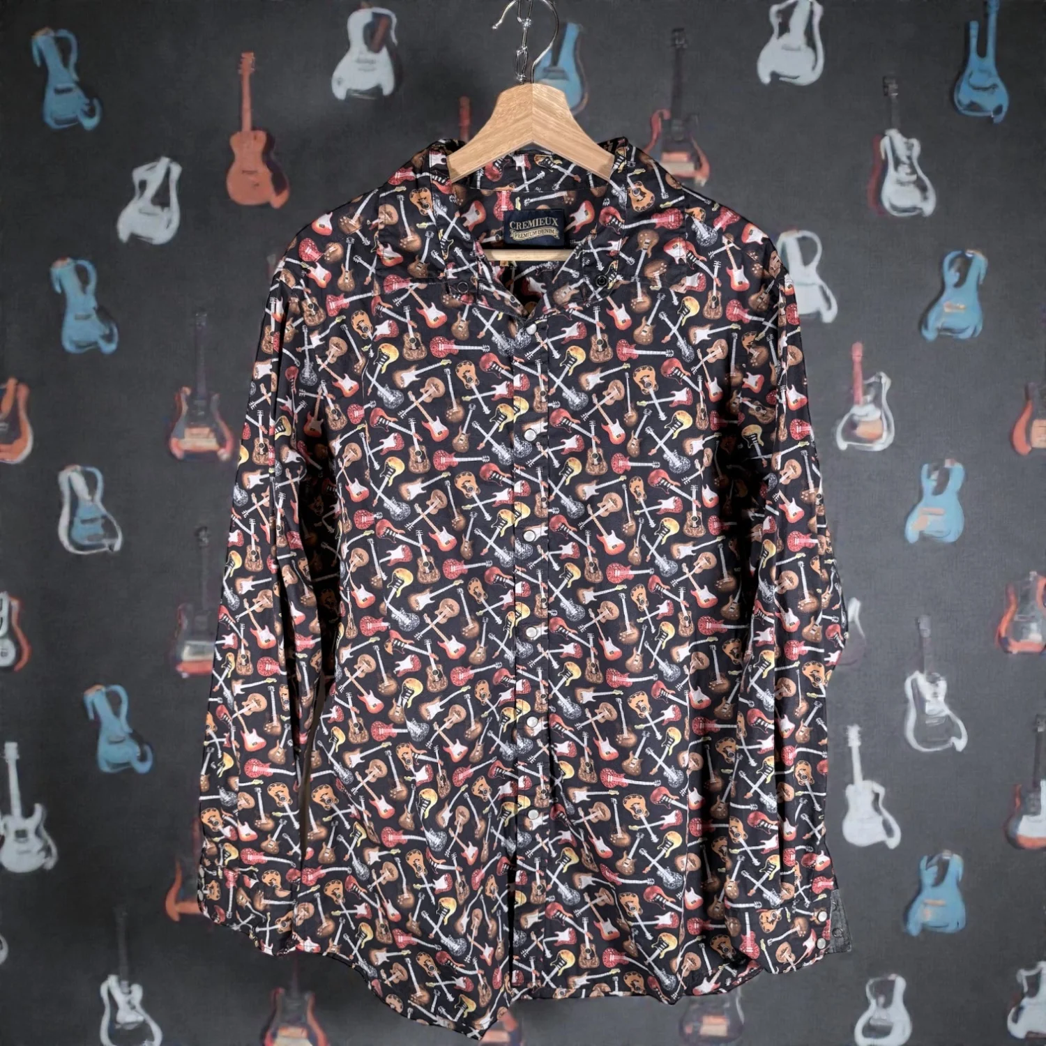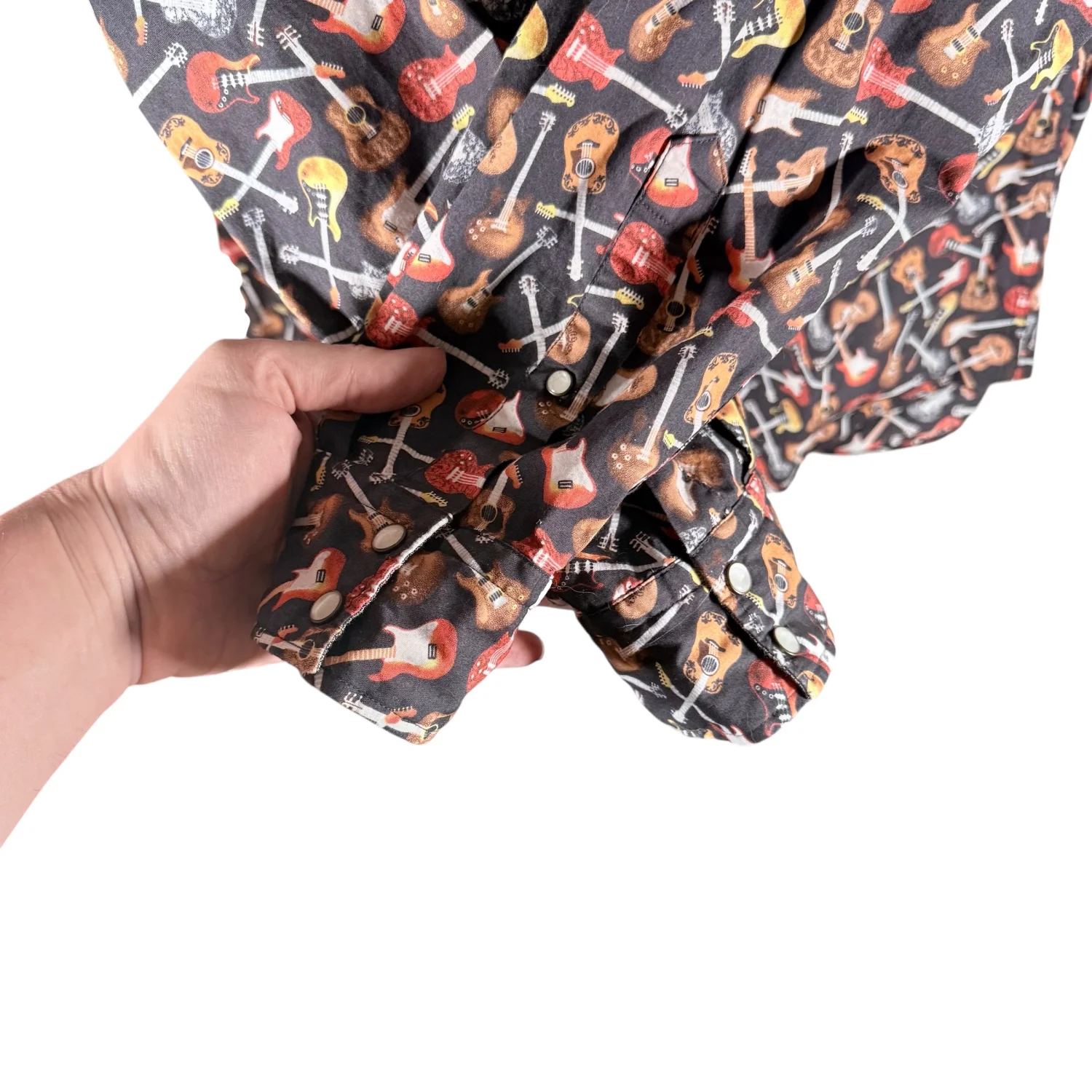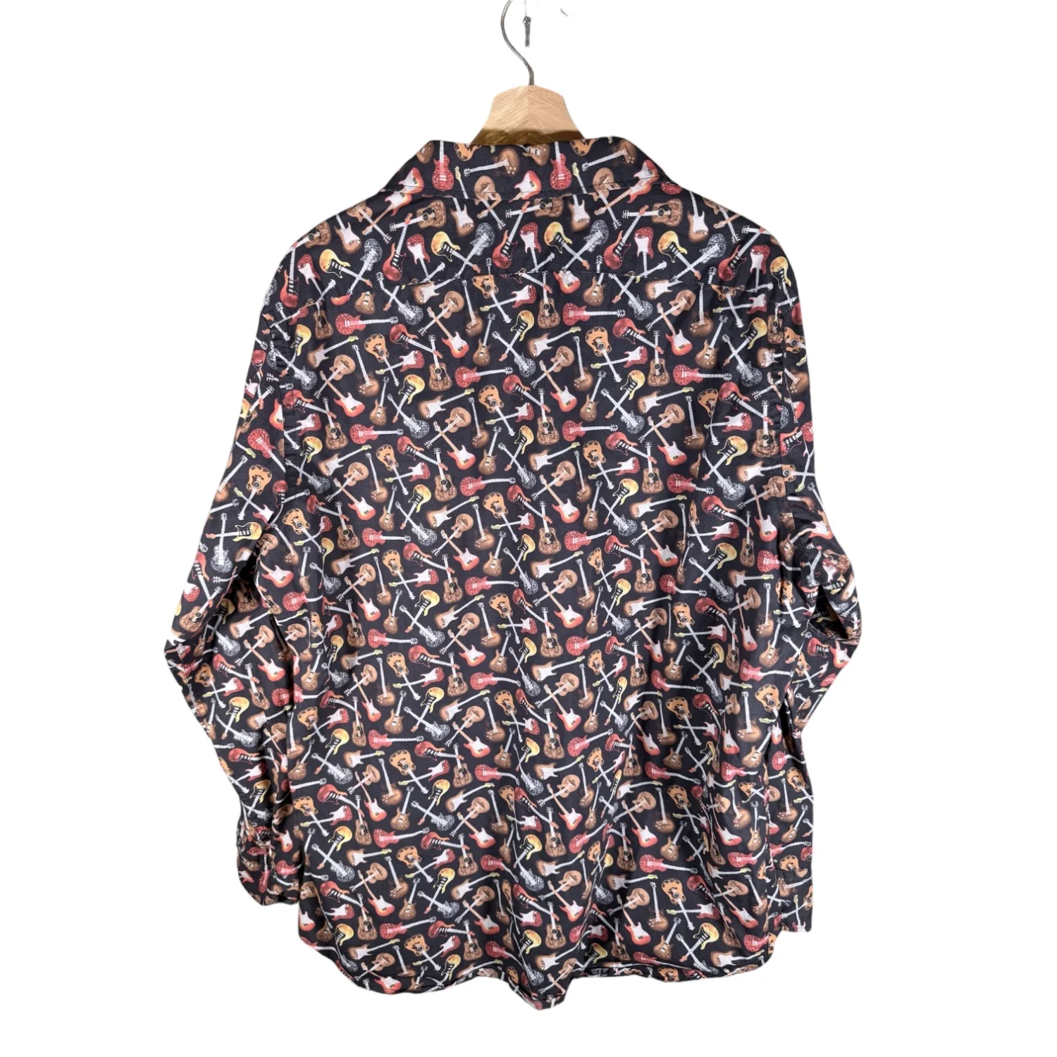 Sooo cool! This shirt features a dark blue background with all over guitar print, and pearl snaps down the front and at end of each sleeve. Excellent preowned condition. See pictures for details. Keywords: armpit to armpit 26" length 31" arm length 32" Keywords: casual, musician, rock & roll, western, cowboy, country P20260014 2