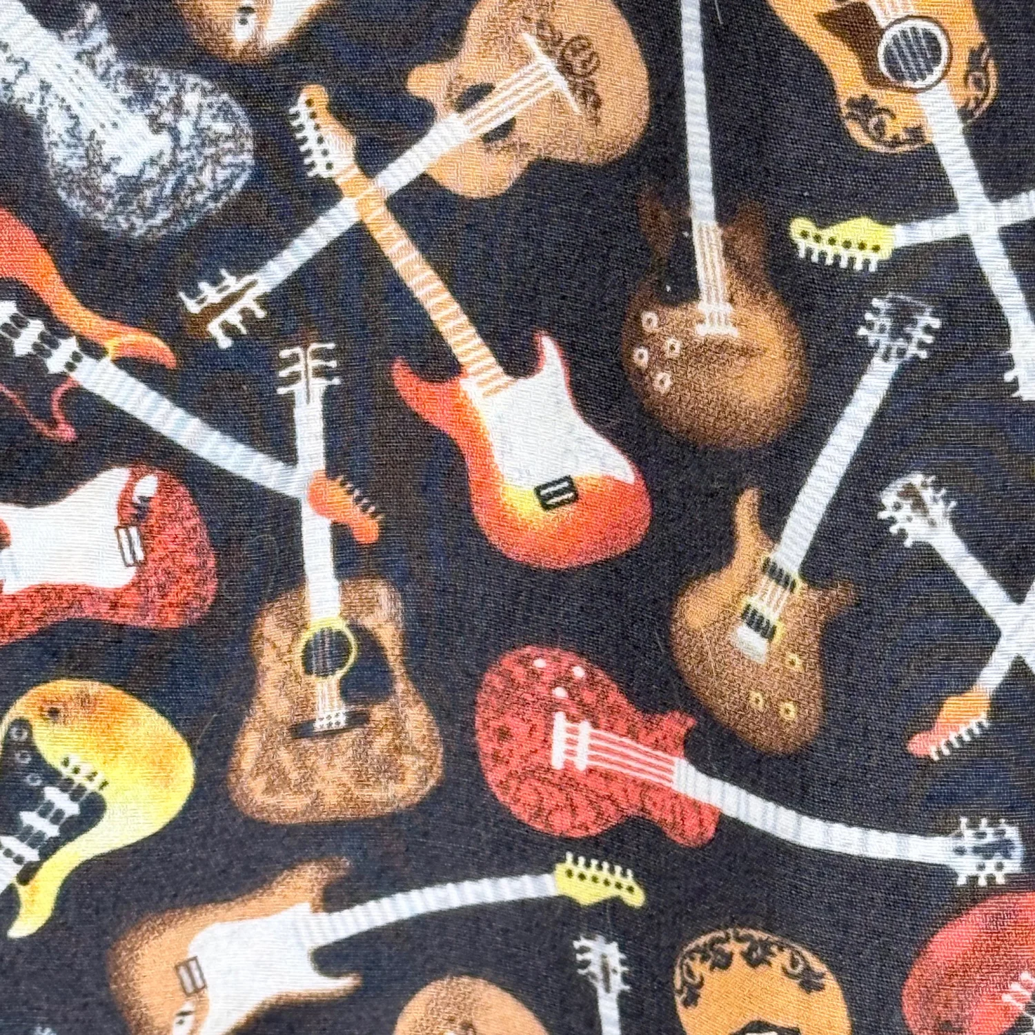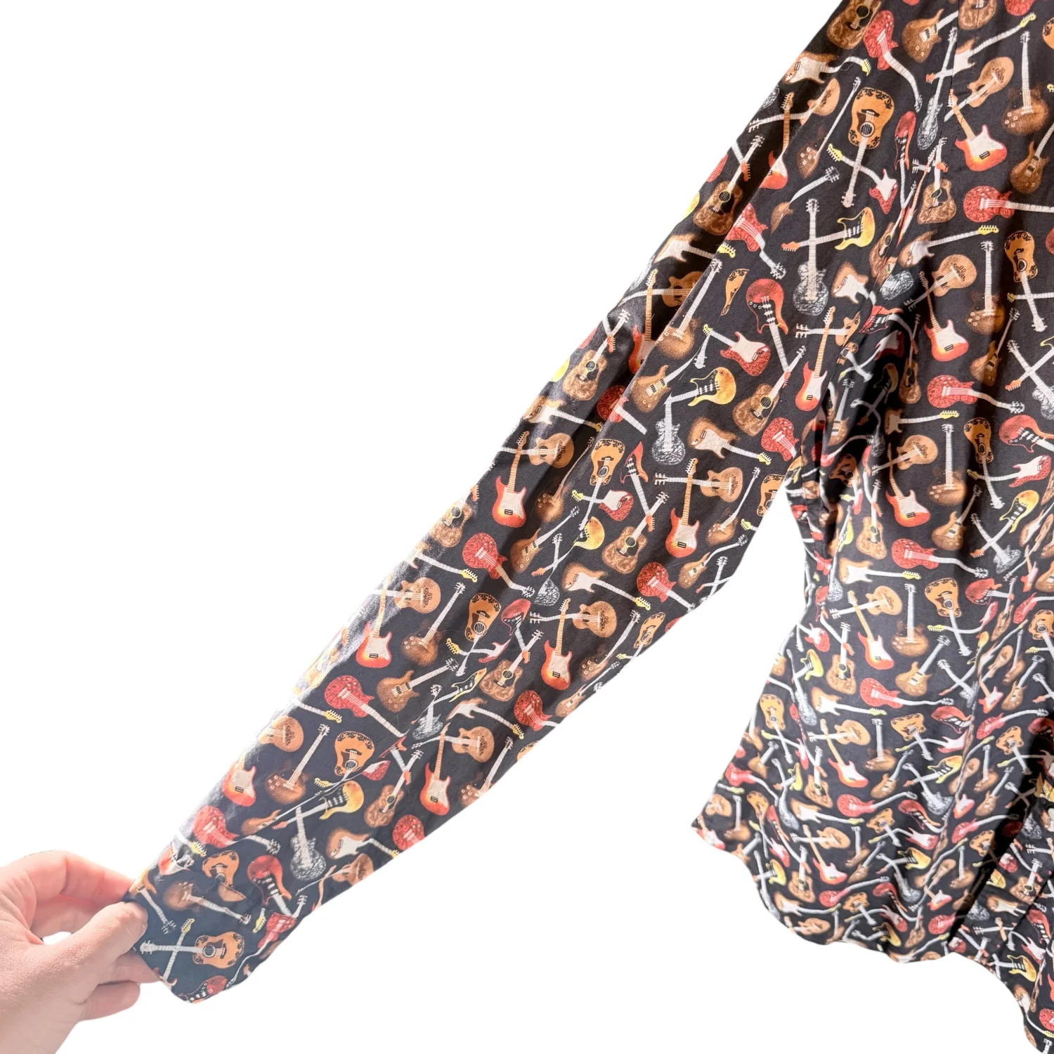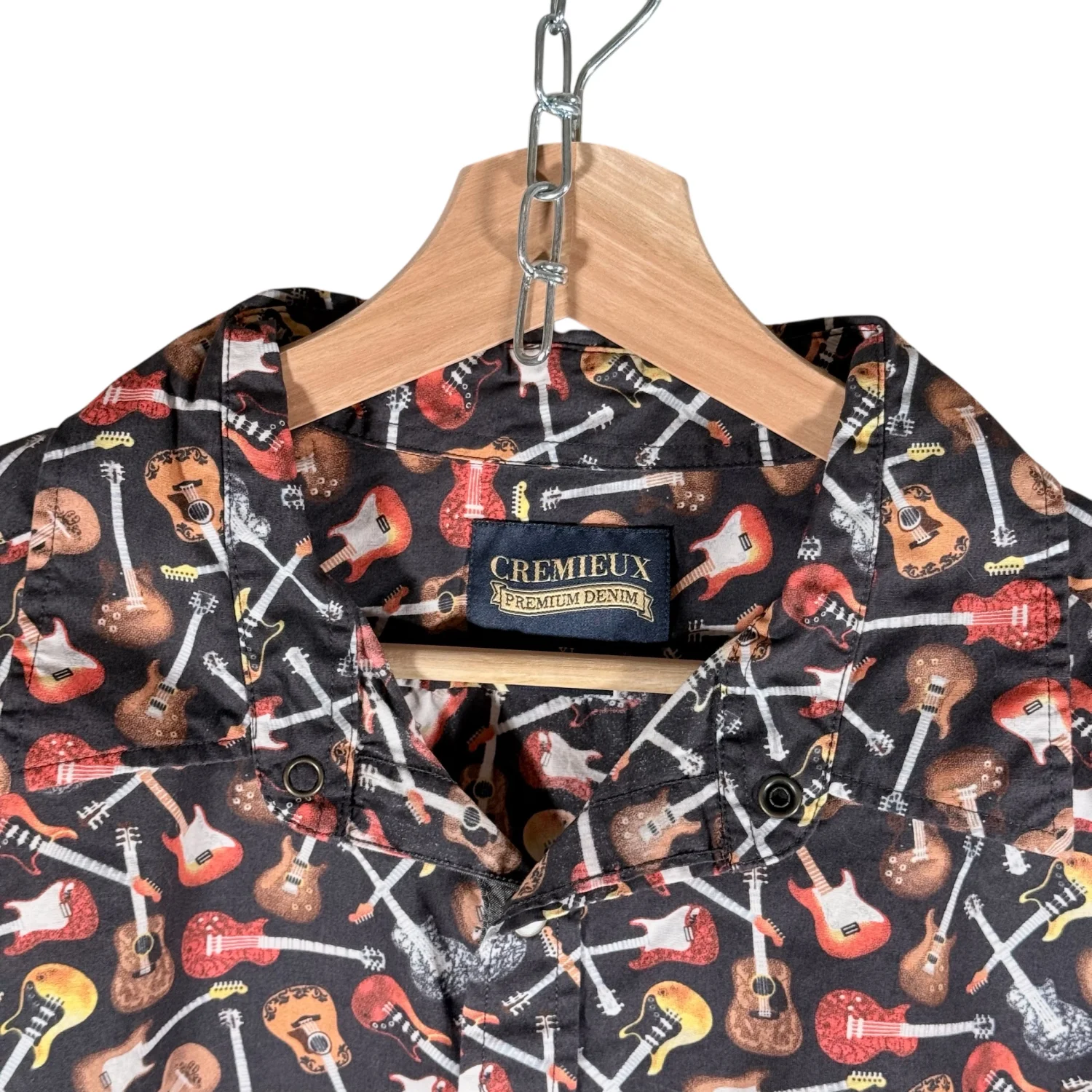 Sooo cool! This shirt features a dark blue background with all over guitar print, and pearl snaps down the front and at end of each sleeve. Excellent preowned condition. See pictures for details. Keywords: armpit to armpit 26" length 31" arm length 32" Keywords: casual, musician, rock & roll, western, cowboy, country P20260014 2