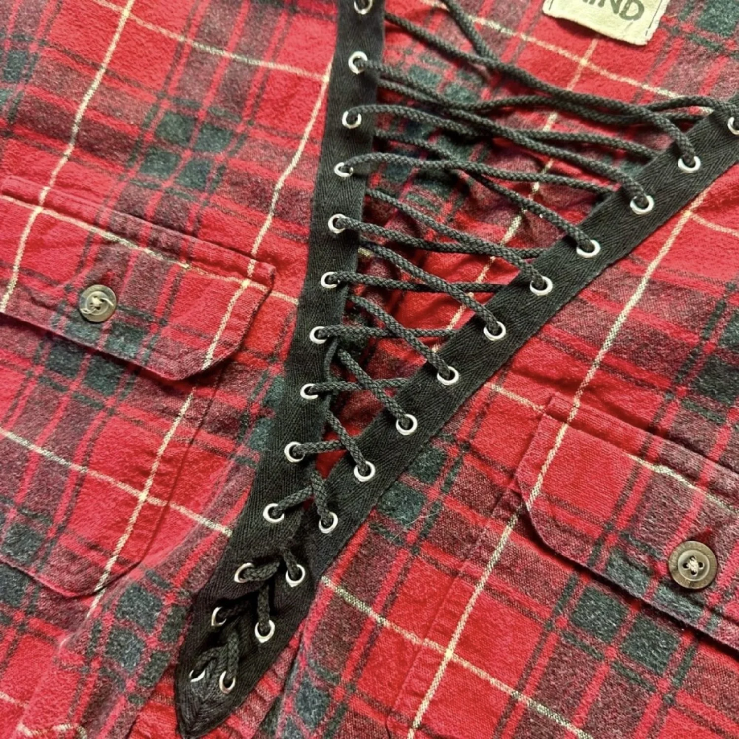 Furst of a Kind Women's L/S Red & Black Plaid Flannel Lace Up V Nack Crop Top