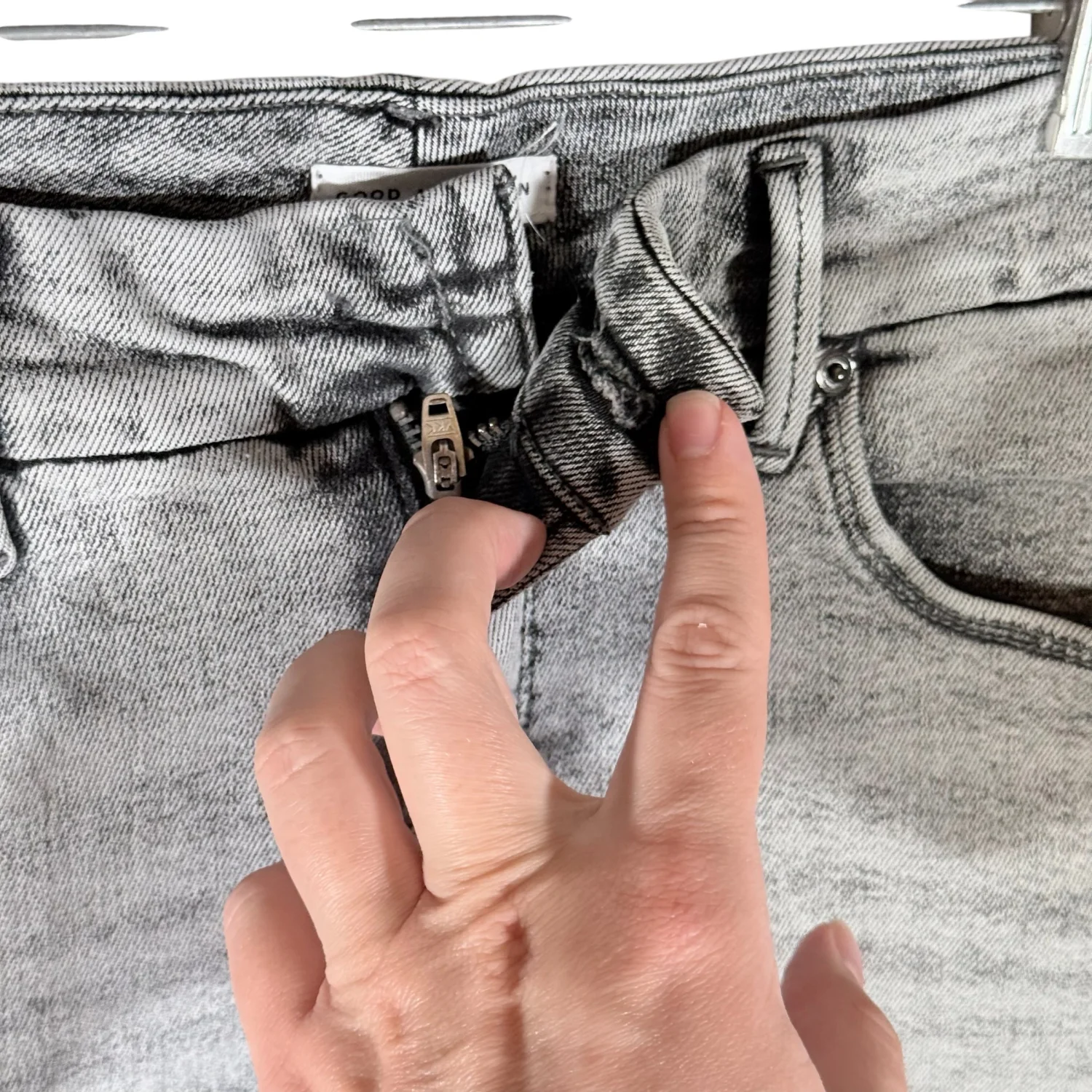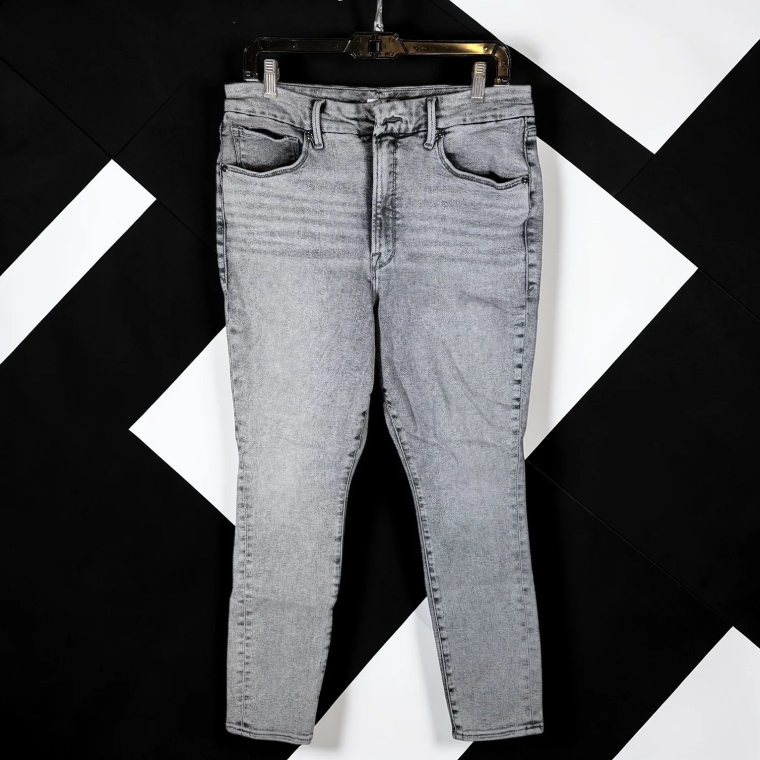 These jeans are generally in good preowned condition. However, the BUTTON IS MISSING. Color is a light gray (has white and black mixed together). See pictures for details. Measurements waist 30" rise 12.25" inseam 27.5" leg opening 5.5" Keywords: casual, denim, stretch, comfort, school, brunch, errands, everyday, project, retro style P20250582 6
