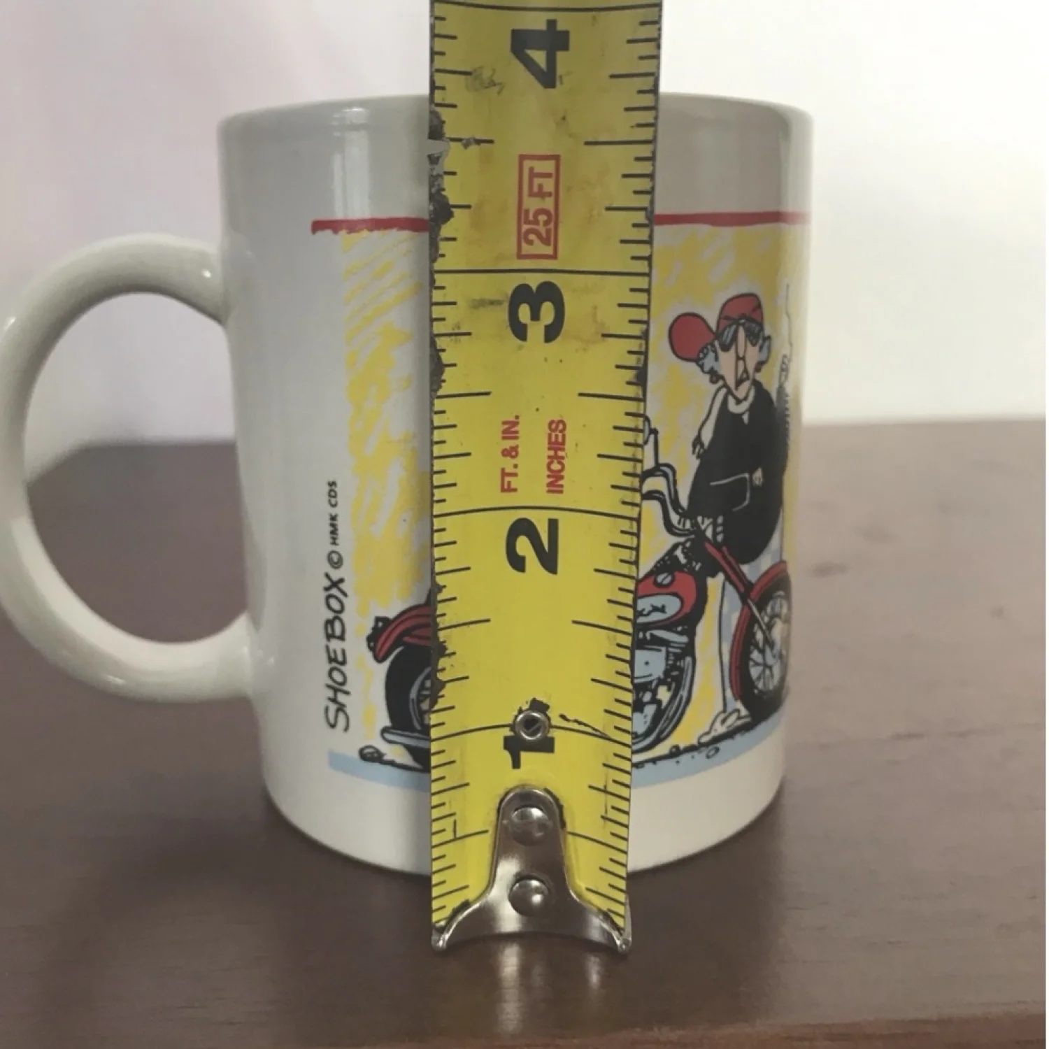 This is a cute coffee cup featuring the Hallmark cartoon character Maxine! She is featured, along with her dog, on a motorcycle with the words "Born to be riled!" next to her, along with a sign that says "Crabby Crossing". Overall the mug is in GUC with mild wear. See pictures for details and measurements. Brand on bottom is Wan Feng. comic, granny, biker 20210621 209