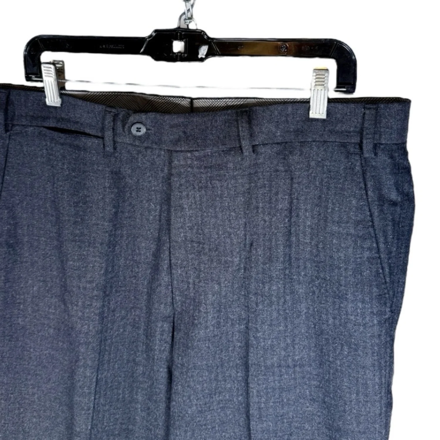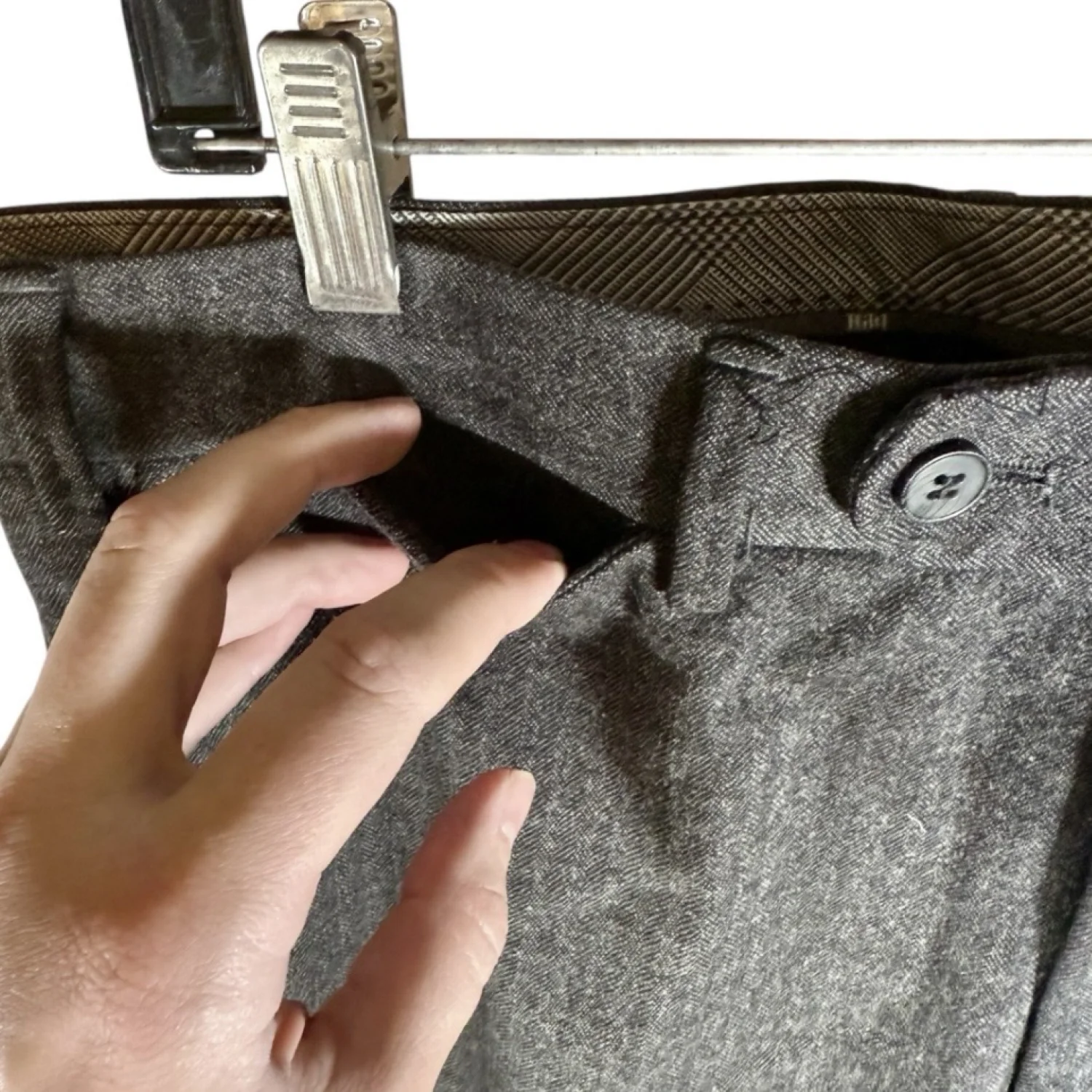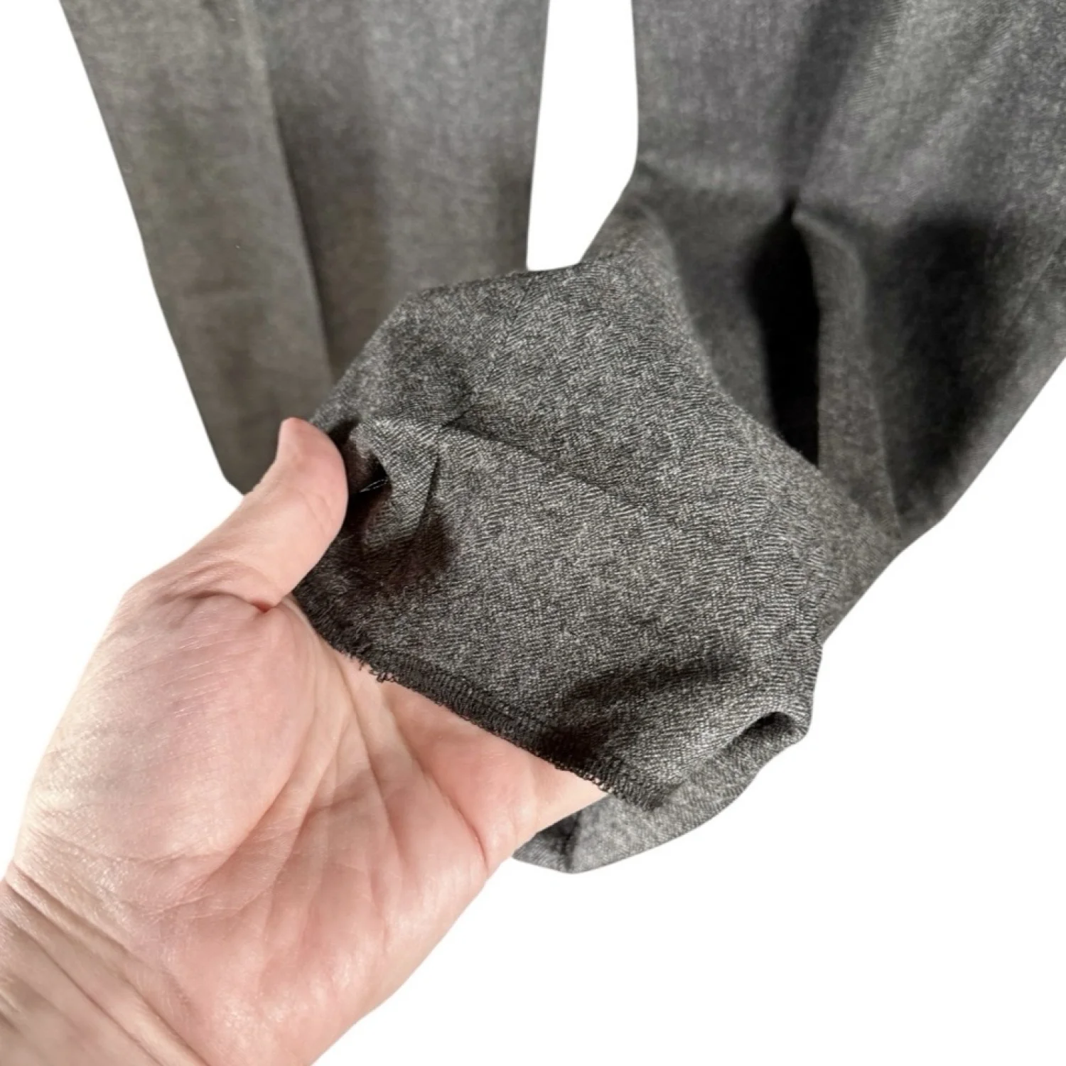 Great pair of trousers for work, and feature pockets and a herringbone pattern in teh fabric. Made of a wool/polyester/spandex blend for light stretch. Generally in excellent preowned condition with mild wear. Appears that one leg may have been hemmed at the end at one point and it has come loose. See pictures for details. Measurements waist 35" rise 12" inseam 30" with cuff folded and 32.5" total with cuff unfolded leg opening 9" Keywords: office, church, European style, careerwear, teacher, academia P20250410 7