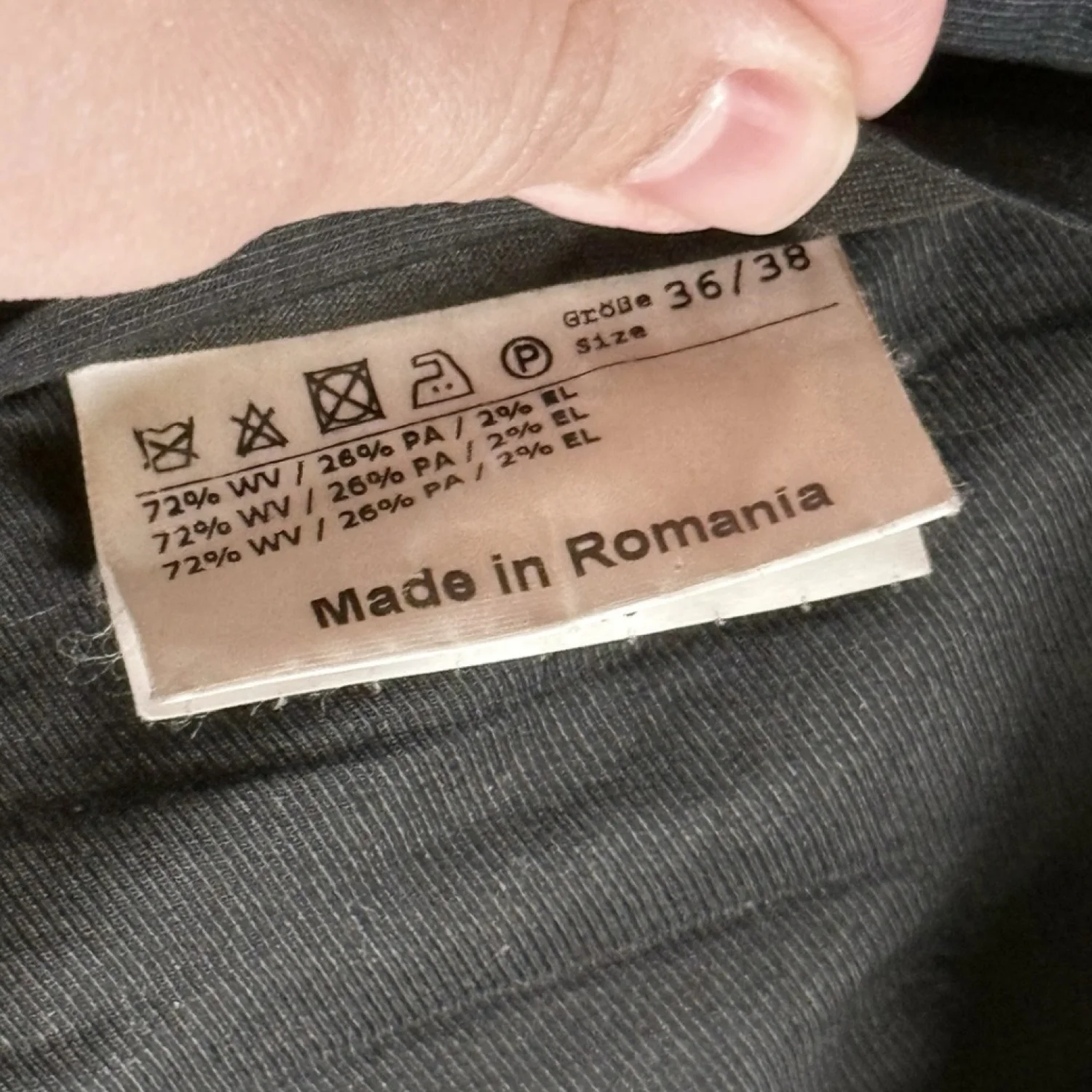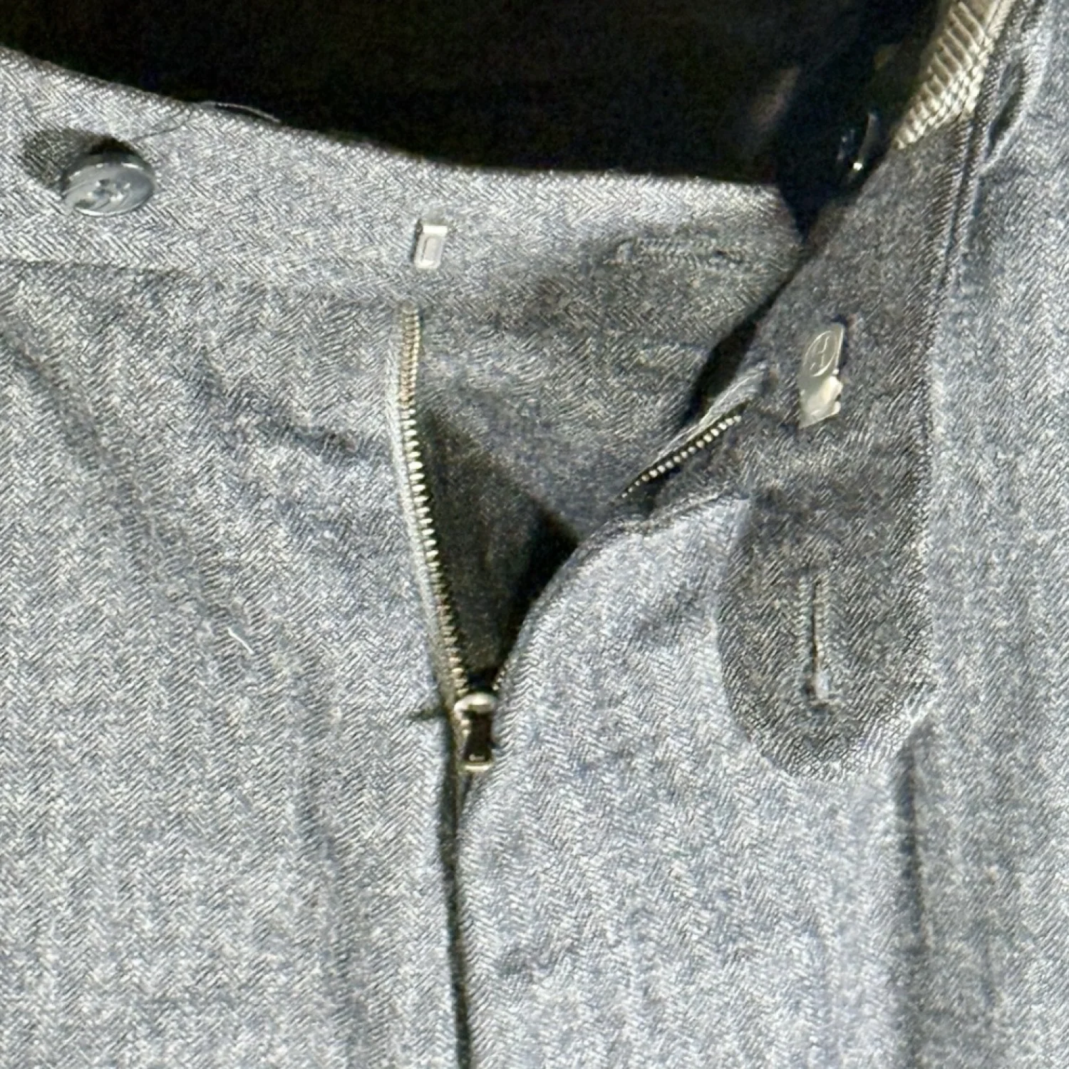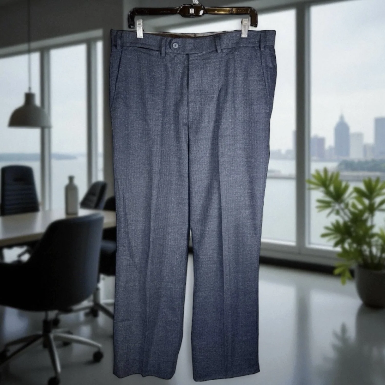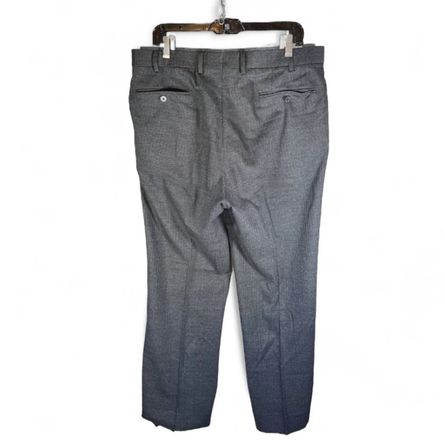 Great pair of trousers for work, and feature pockets and a herringbone pattern in teh fabric. Made of a wool/polyester/spandex blend for light stretch. Generally in excellent preowned condition with mild wear. Appears that one leg may have been hemmed at the end at one point and it has come loose. See pictures for details. Measurements waist 35" rise 12" inseam 30" with cuff folded and 32.5" total with cuff unfolded leg opening 9" Keywords: office, church, European style, careerwear, teacher, academia P20250410 7