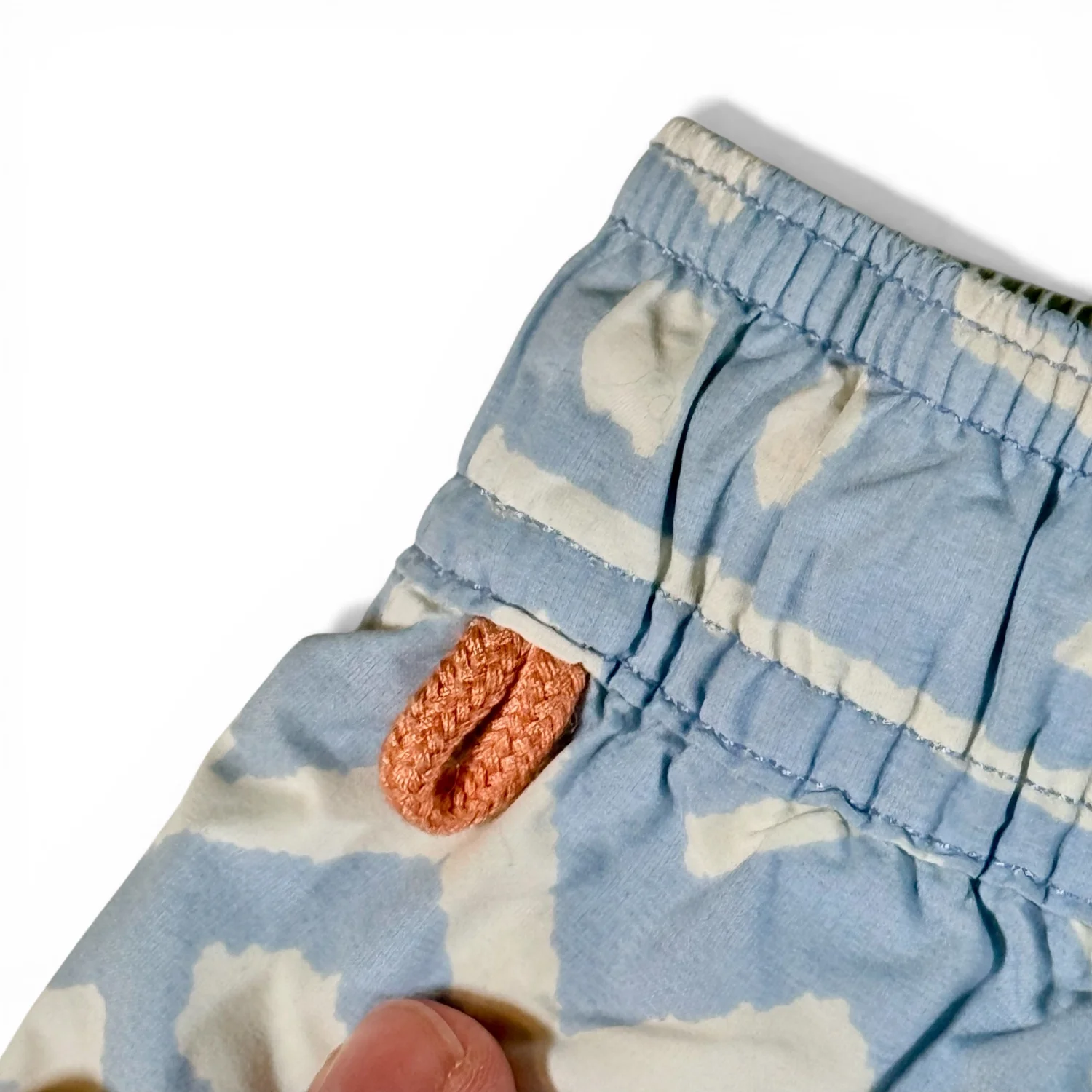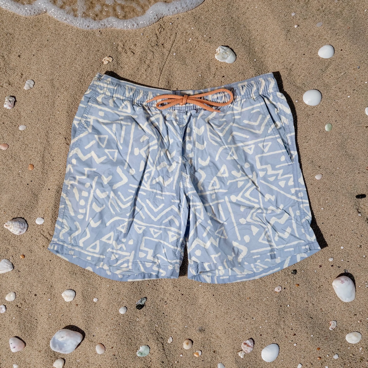 Great shorts featuring blue & white tribal pattern and light orange drawstring. Excellent preowned condition. See pictures for details. Measurements waist 28" rise 9.75" inseam 5.5" Keywords: beach, pool, vacation, travel, summer P20260056 8