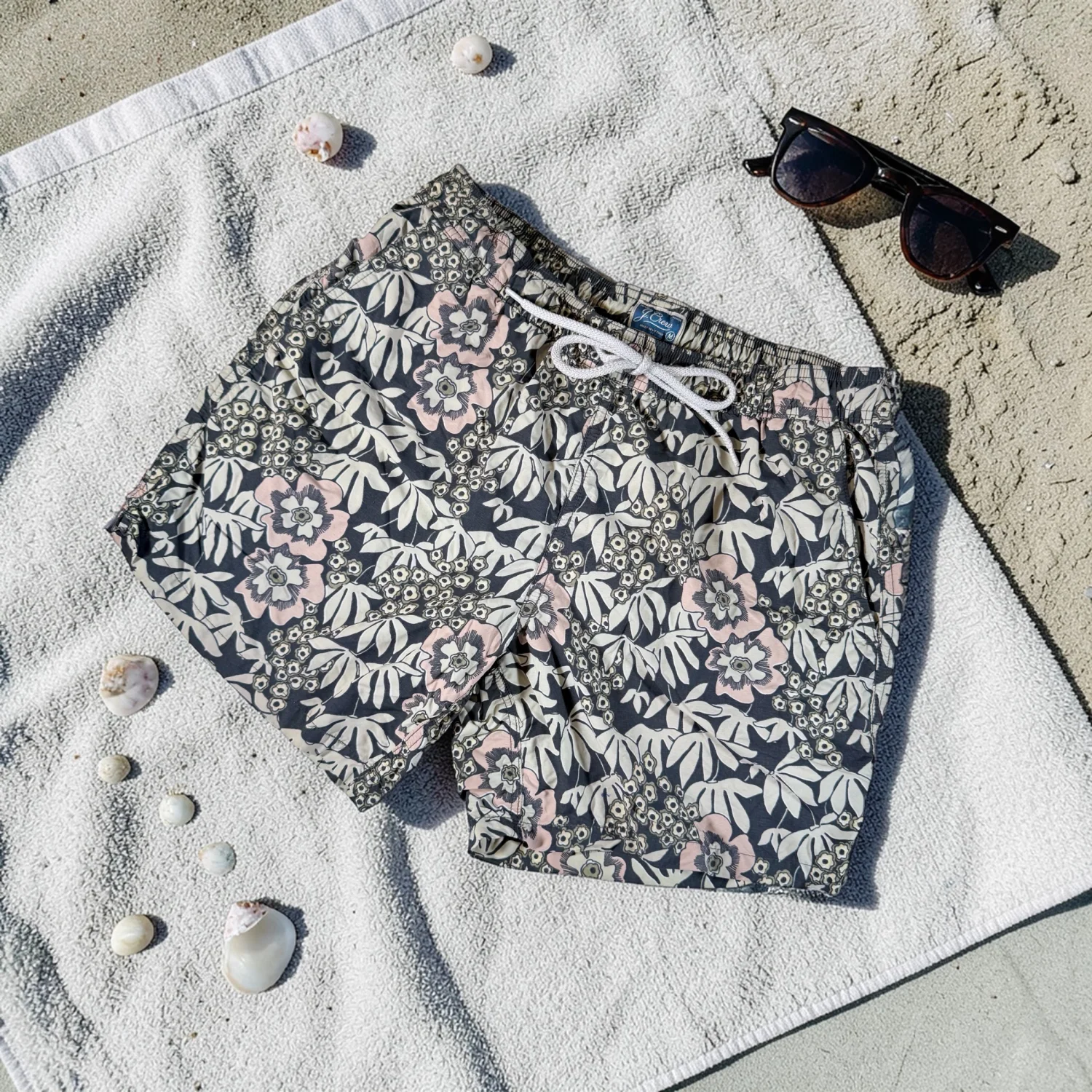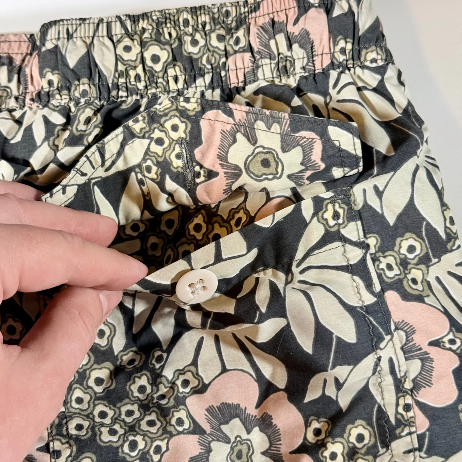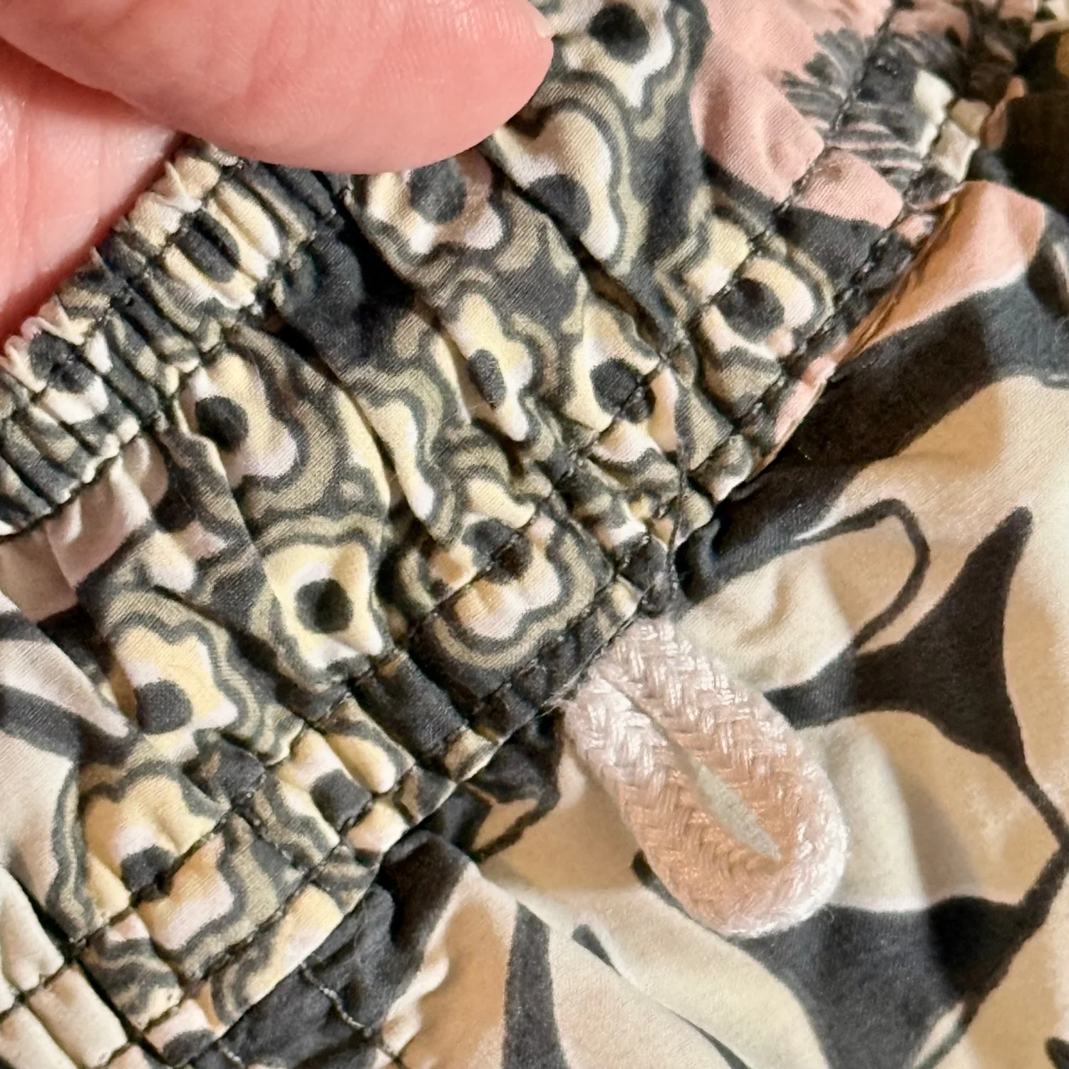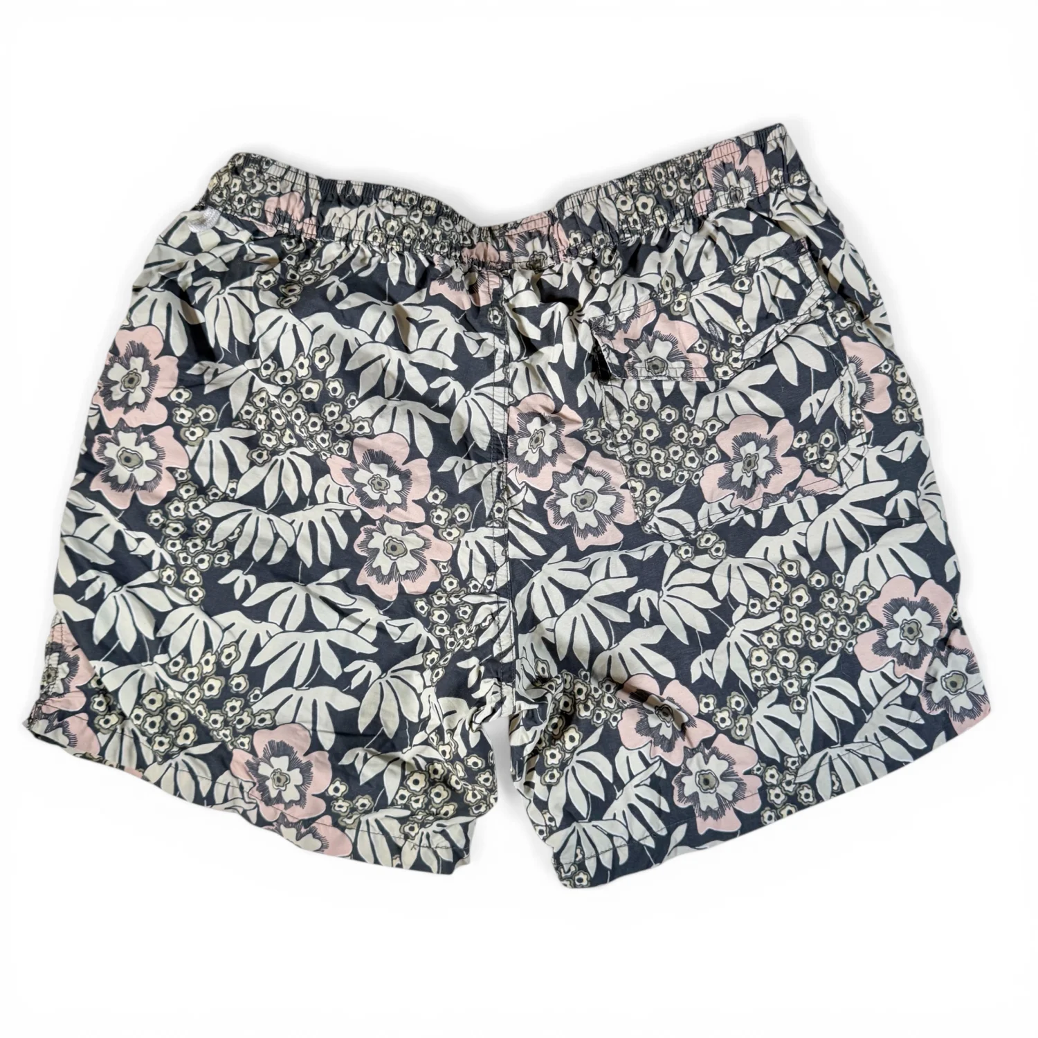 Awesome pair of swim trunk in dark gray and multi colored tropical floral print. Features drawstring & pockets. Excellent preowned condition. See pictures for details. Keywords waist 28" rise 10" inseam 5.5" Keywords: pool, beach, swimwear, summer, preppy P20260057 8