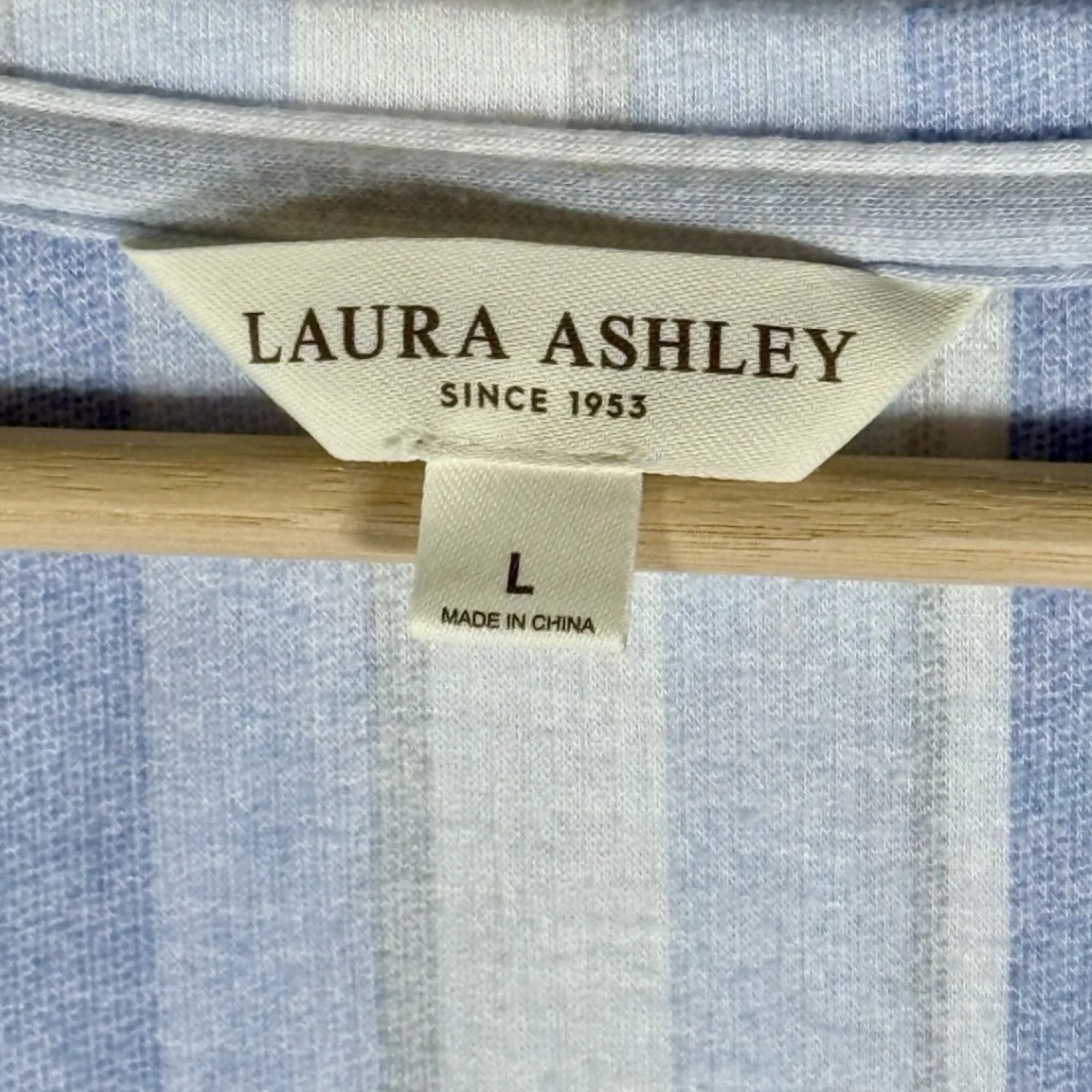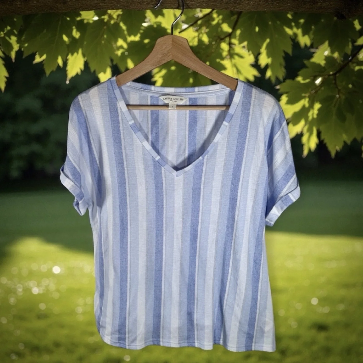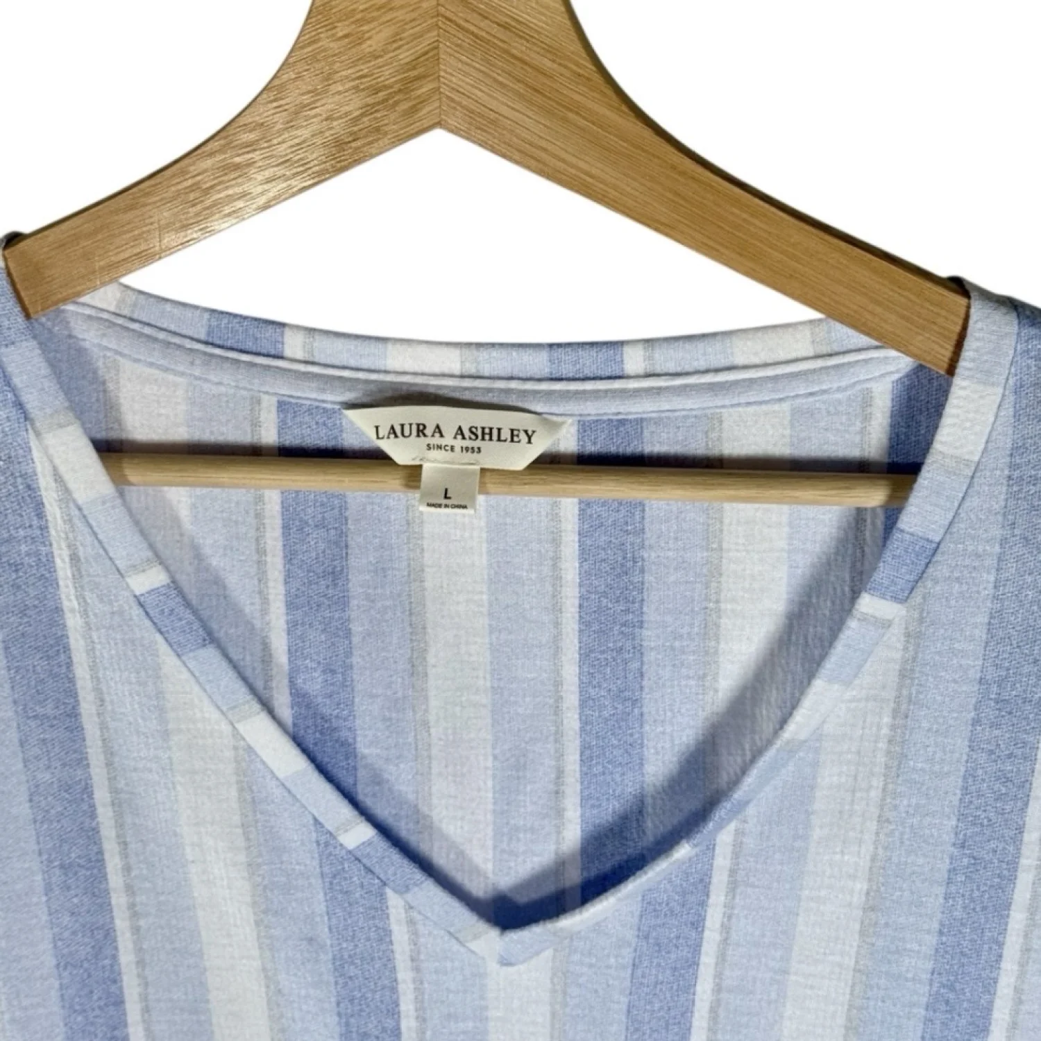 Laura Ashley Women's Large Carolina Blue & White Striped S/S Blouse Shirt V-Neck