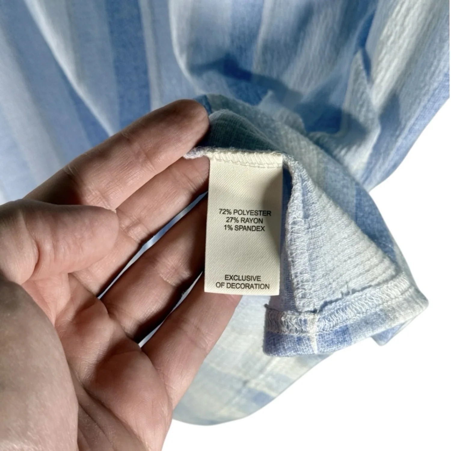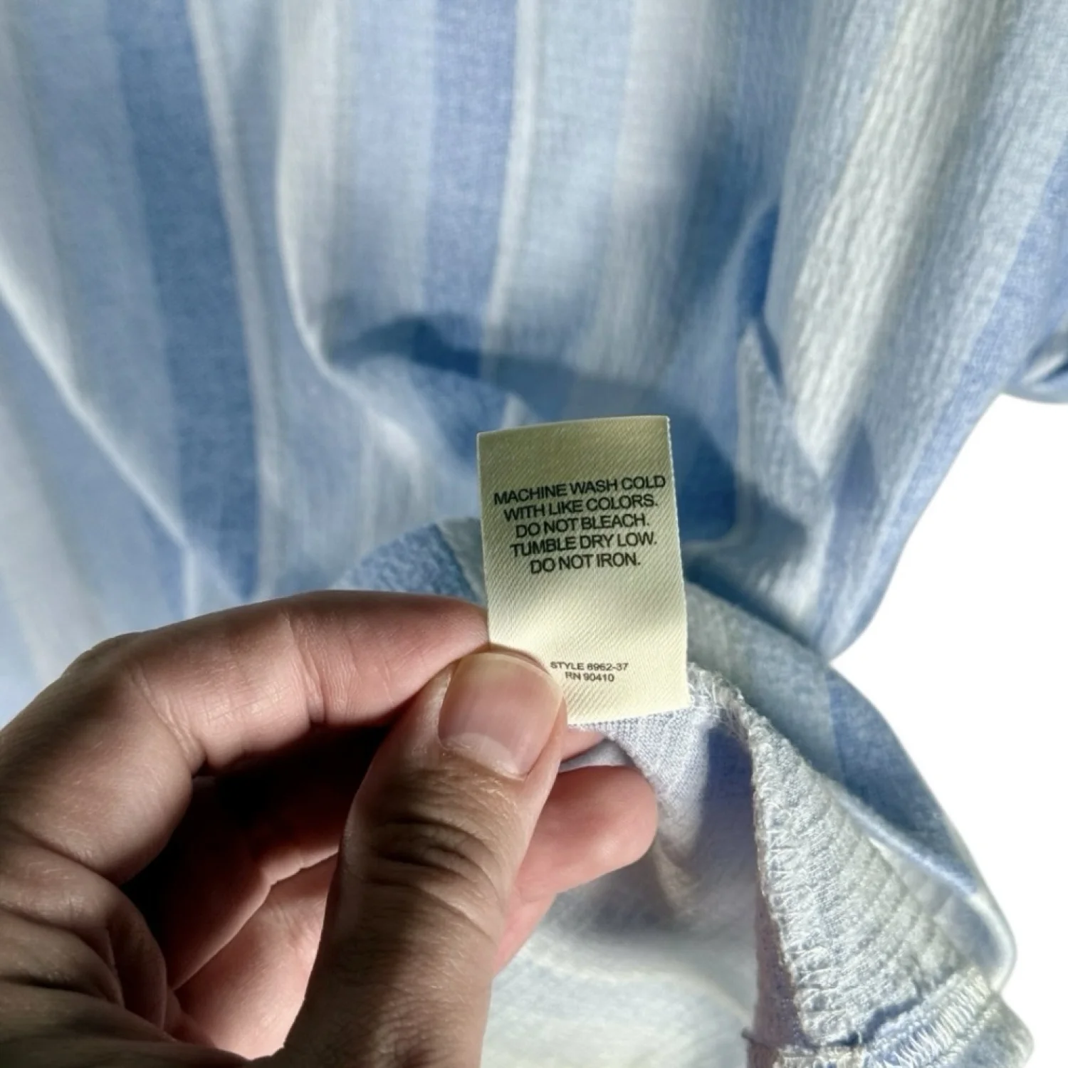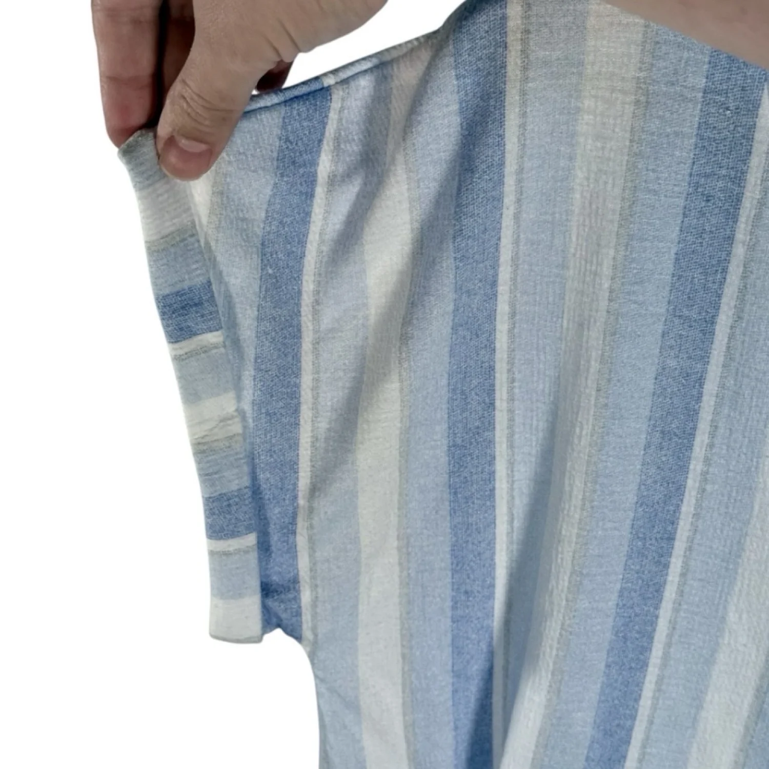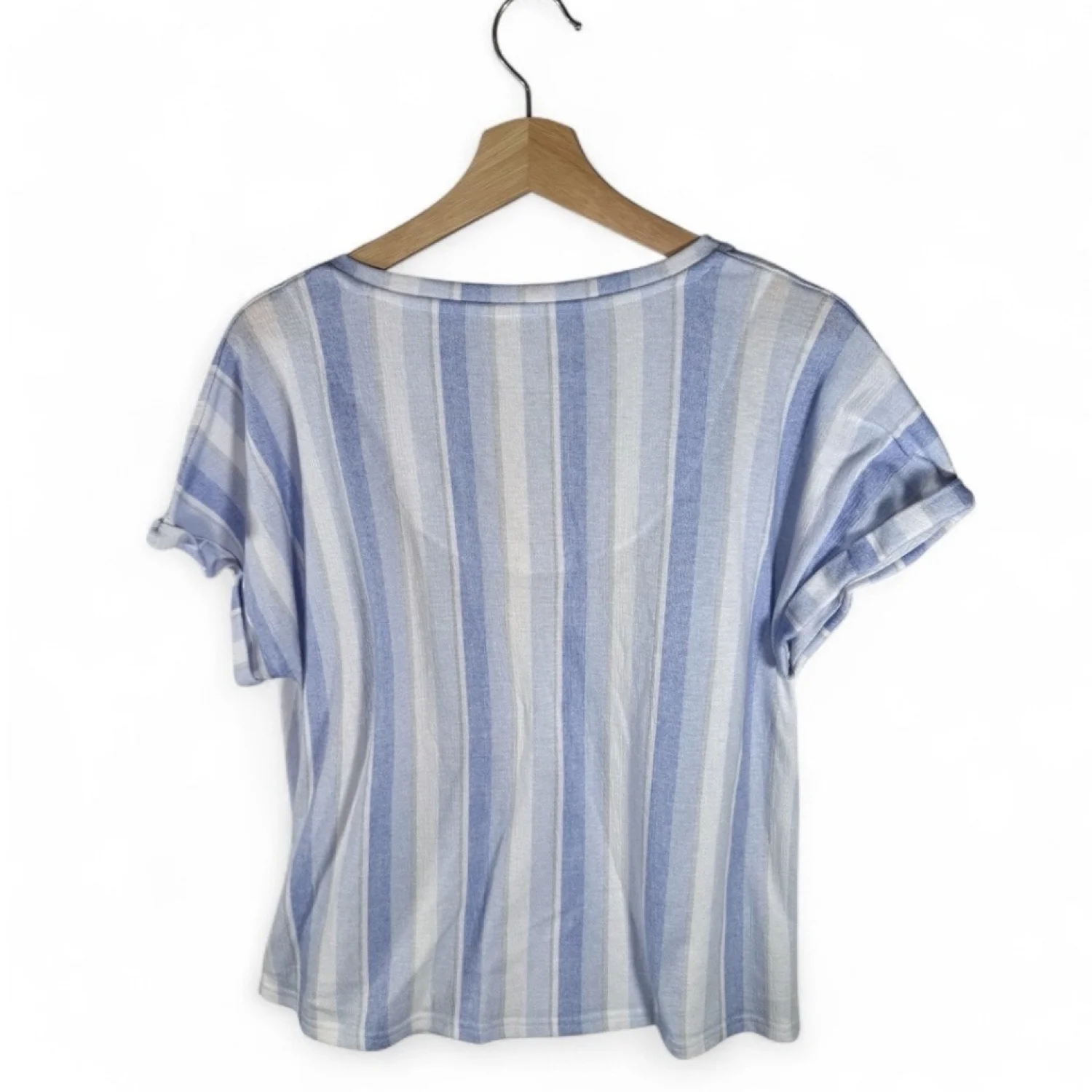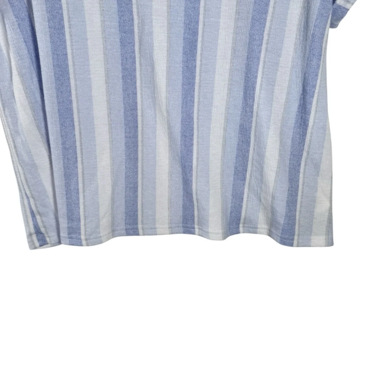 Great shirt featuring light and darker blue and white vertical stripes, very short sleeves that are rolled once at the end, and a boxy shape. Excellent preowned condition with mild wear. See pictures for details. Measurements armpit to armpit 21.25" length 22" Keywords: beachy, summer, coverup, layering, coastal, casual, closet essential P20260022 4