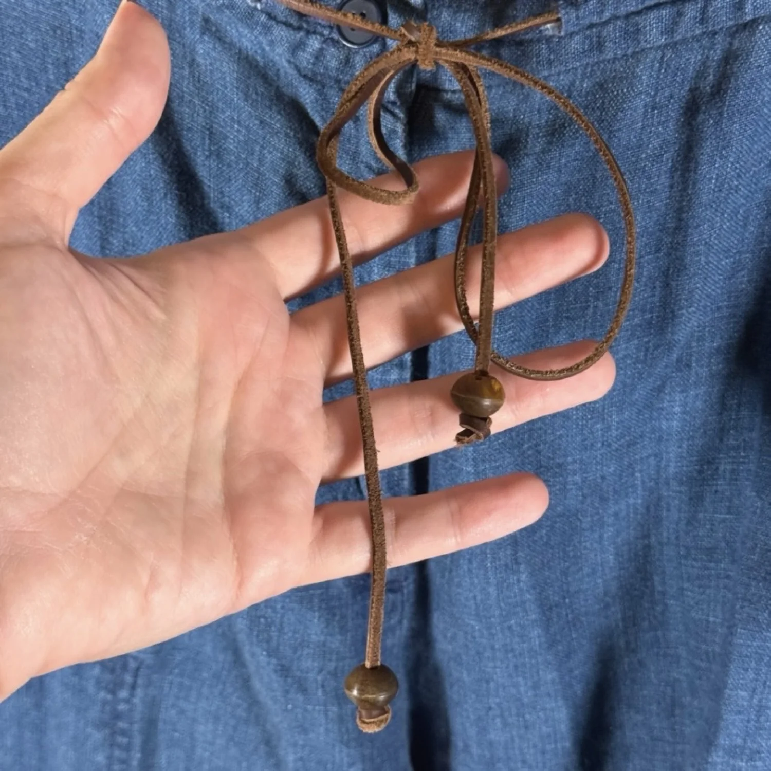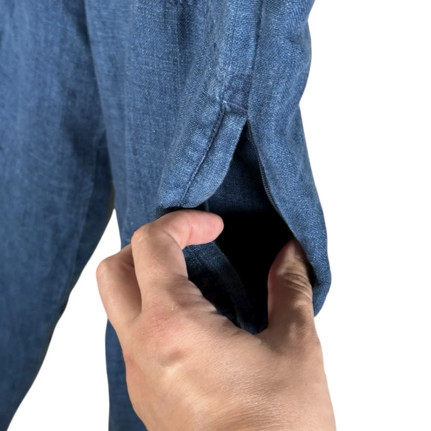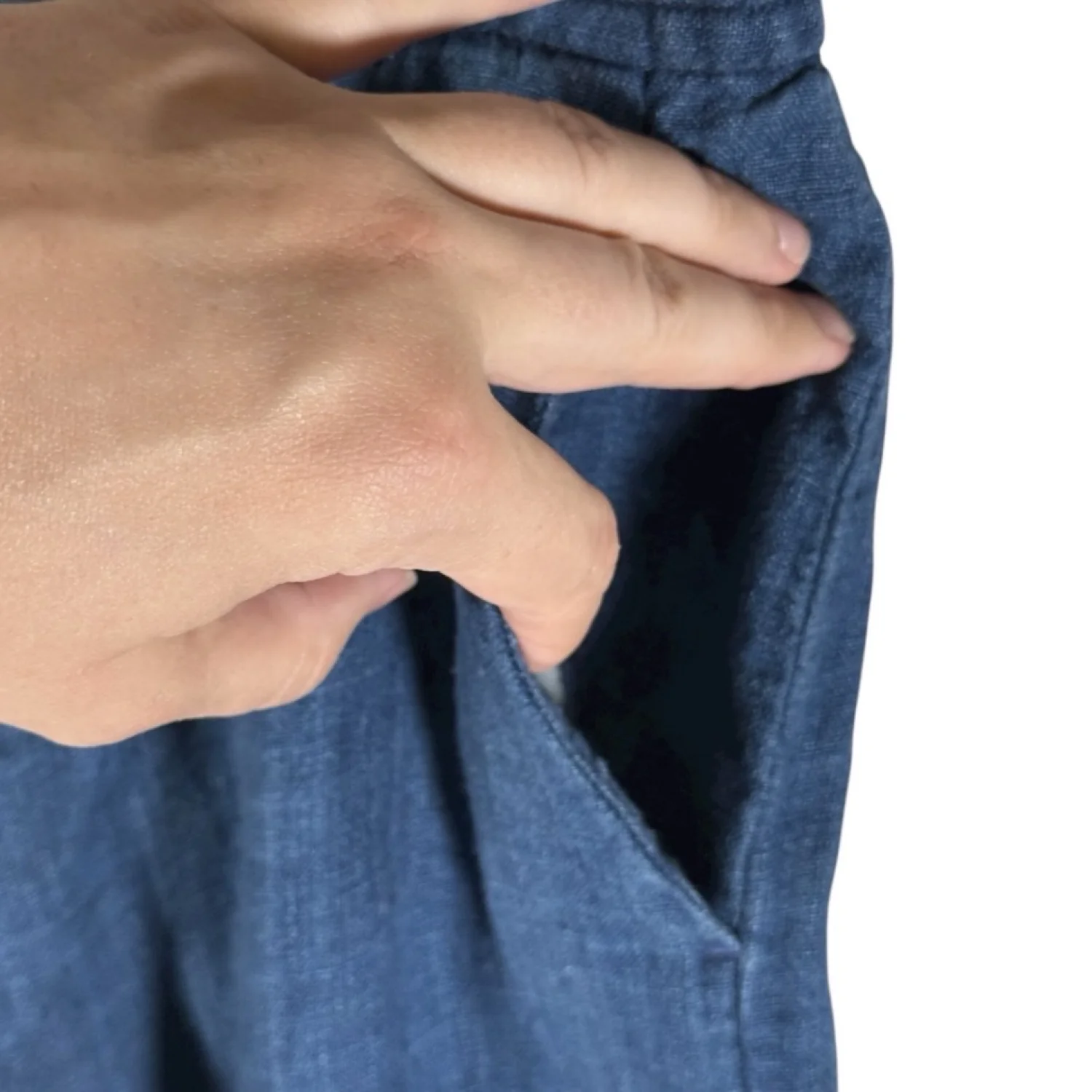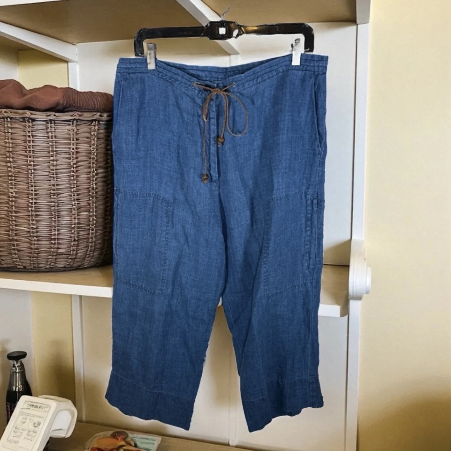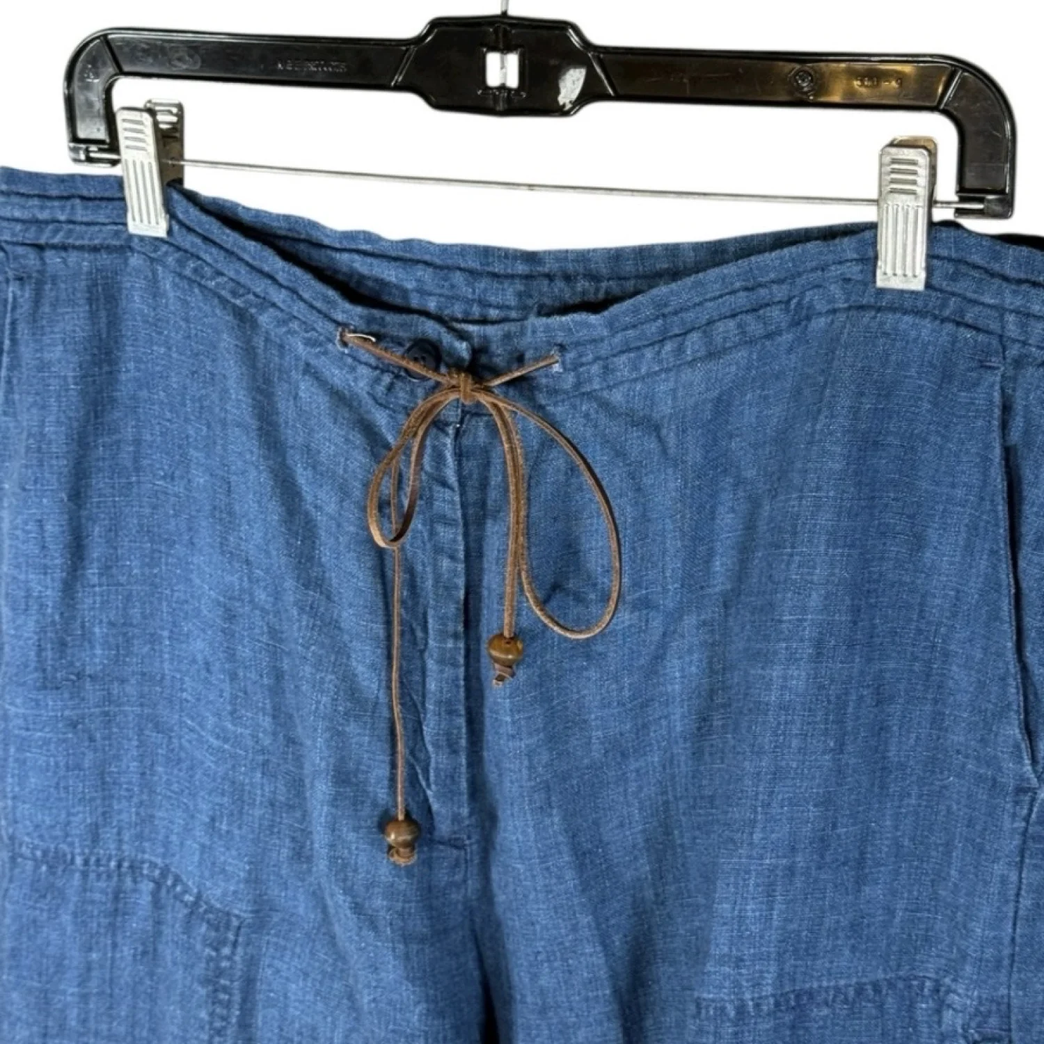 Ready for summer, these linen pants are in dark blue and feature a leather drawstring and a side zip open pocket on each leg. Excellent preowned condition. See pictures for details. Measurements waist 32.5" rise 12" inseam 20.5" Keywords: casual, boho, brunch, summer, beachy, vacation, coastal grandma, lightweight P20250419 4