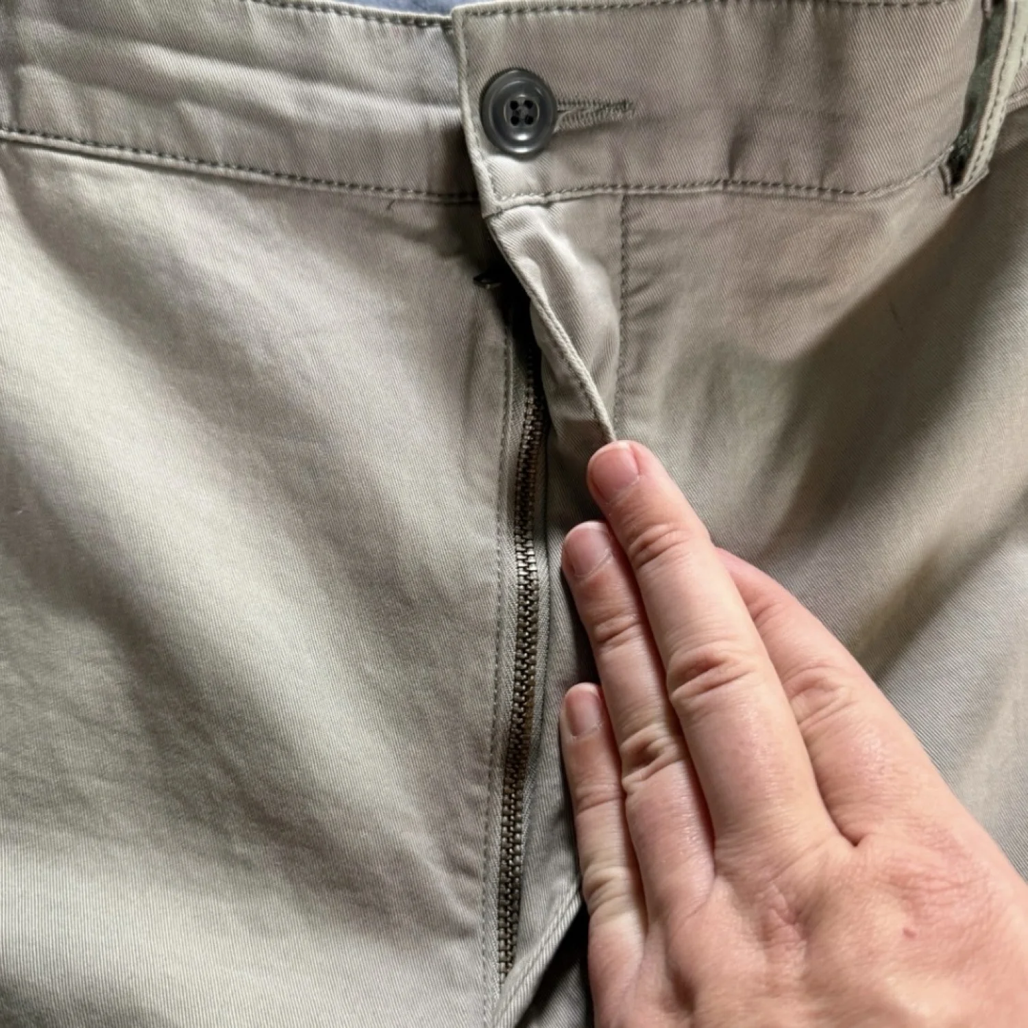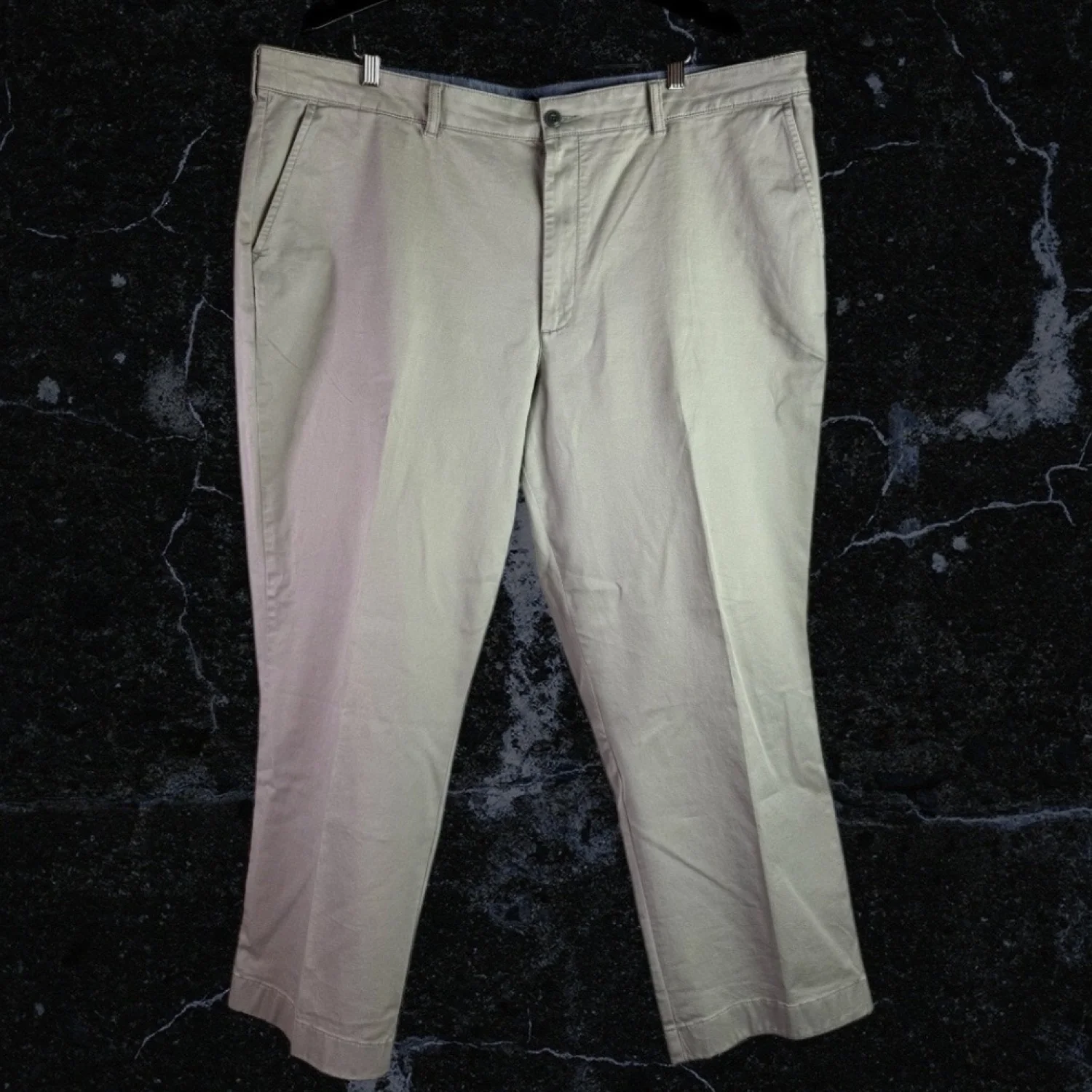 Feature mild stretch for comfort. Natural Fit: Sits at waist. Roomy through hip and thigh. Straight leg. Excellent preowned condition with very mild wear. Measurements waist 44" rise 13" inseam 28.25" Keywords: preppy, casual, essential, school, church, neutral, office P20240598 18
