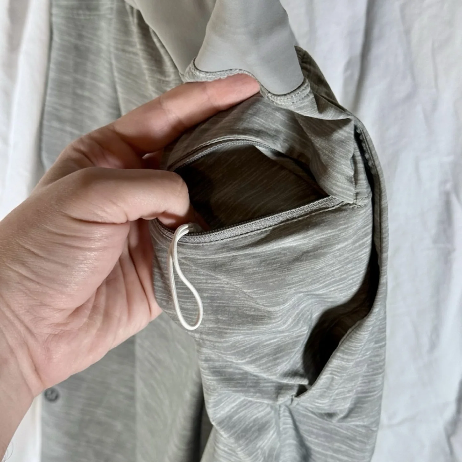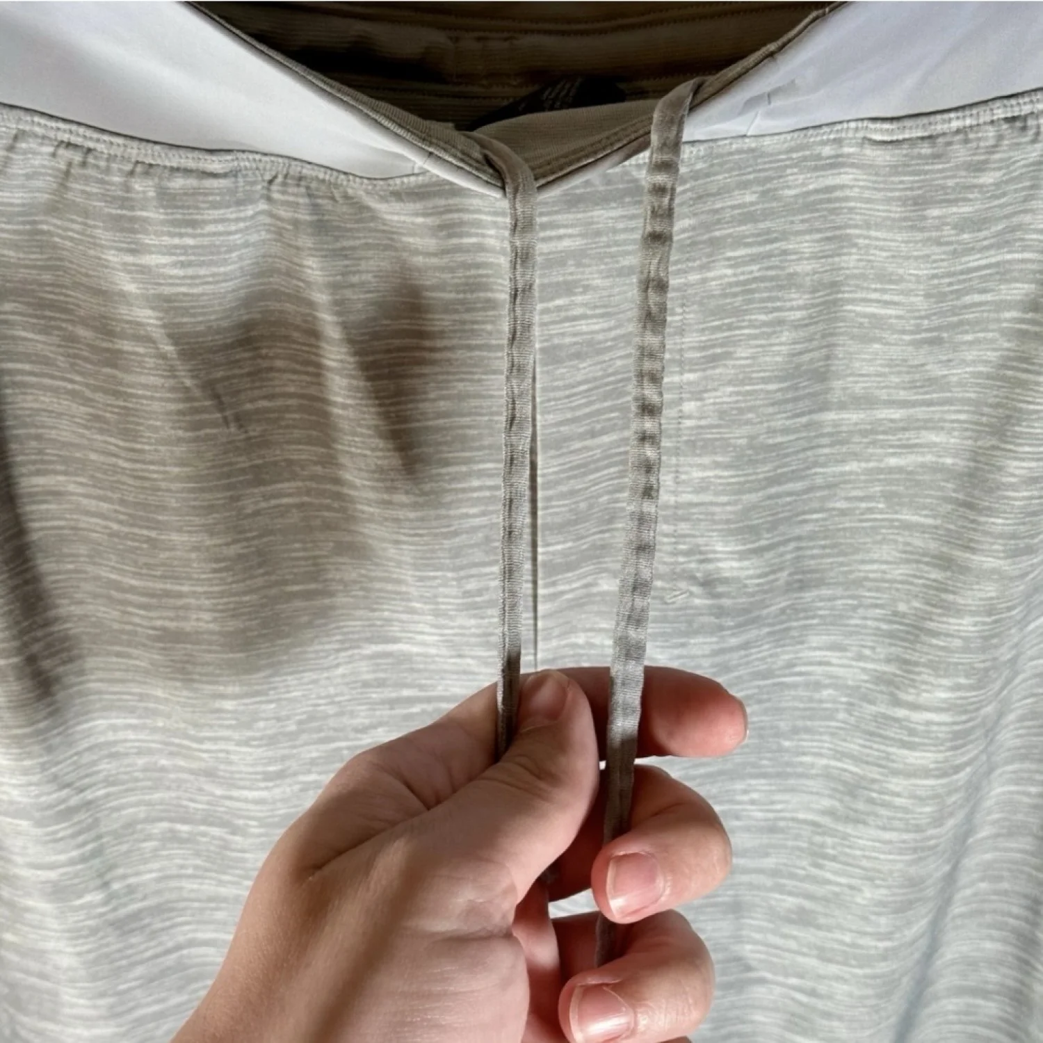 Amazing shorts in light gray and white lined design. Has zip pocket on right hip and a drawstring. Style number is M7AAWS. Excellent preowned condition. See pictures for details. Measurements waist 31" rise 11" inseam 9" Keywords: exercise, gym, athleisure, comfort, stretch, workout, yoga, running, jogging P20250423 7