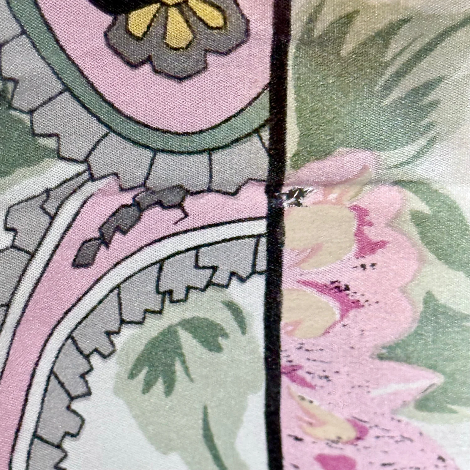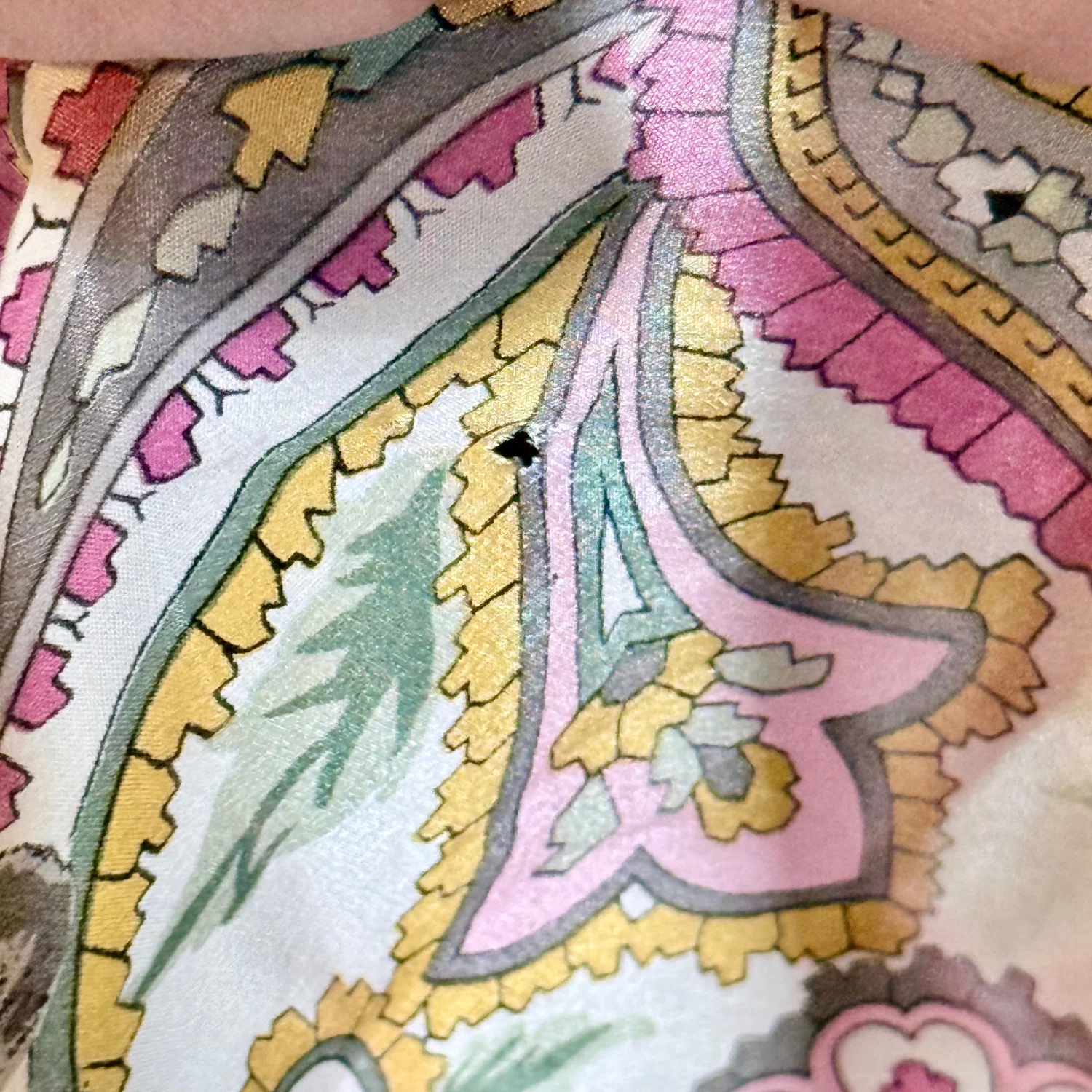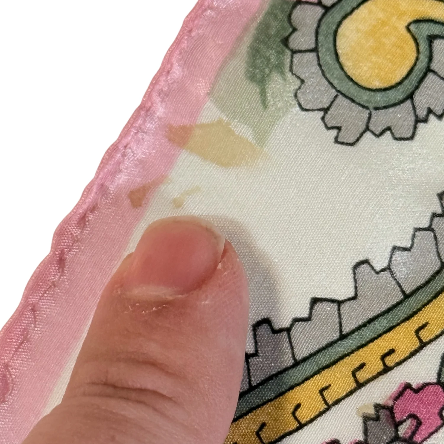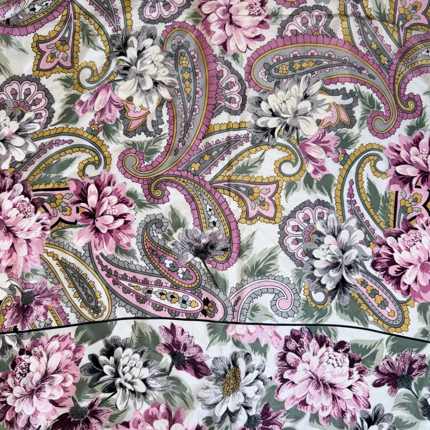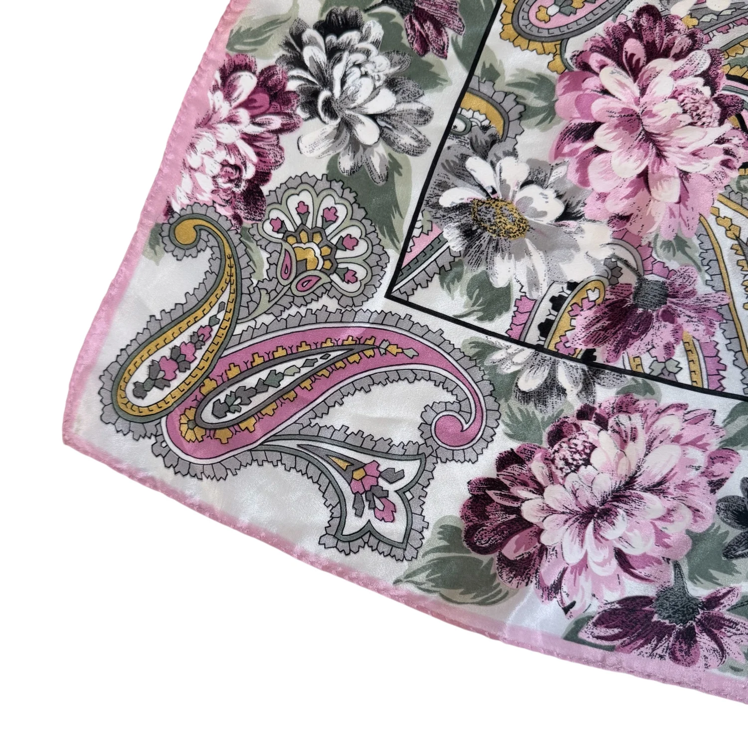 Beautiful scarf! It features a paisley & floral pattern with pink, yellow, green, gray and white colors. Fair condition overall. Note that it does have a few stains and small holes. Pictured are the ones I could find. Material tag is missing. See pictures for details. Measures 31" x 30". Keywords: feminine, accessories, boho, cottagecore, prairiecore, vintage, collectible P20260020 4
