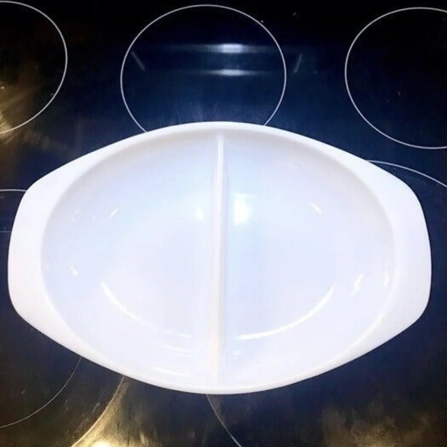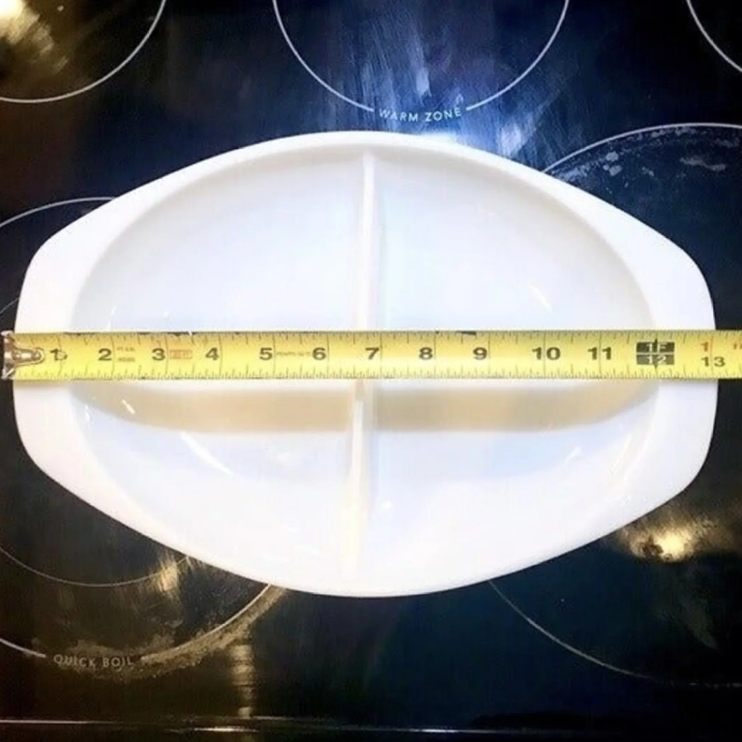 This is a great piece to complement a set or start your own collection! It is a vintage Pyrex milk glass serving platter with 2 compartments. On bottom, it states 1.5 quart and is style #1063. This is a plain white dish with no print, and features a handle on each end. The dish is in GUC with mild wear on the bottom of each compartment. See pictures for details and measurements. serving, party, collection, dishes, Pyrex, kitchen 20211723 205