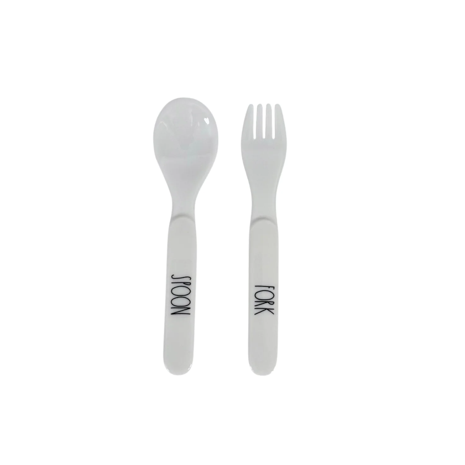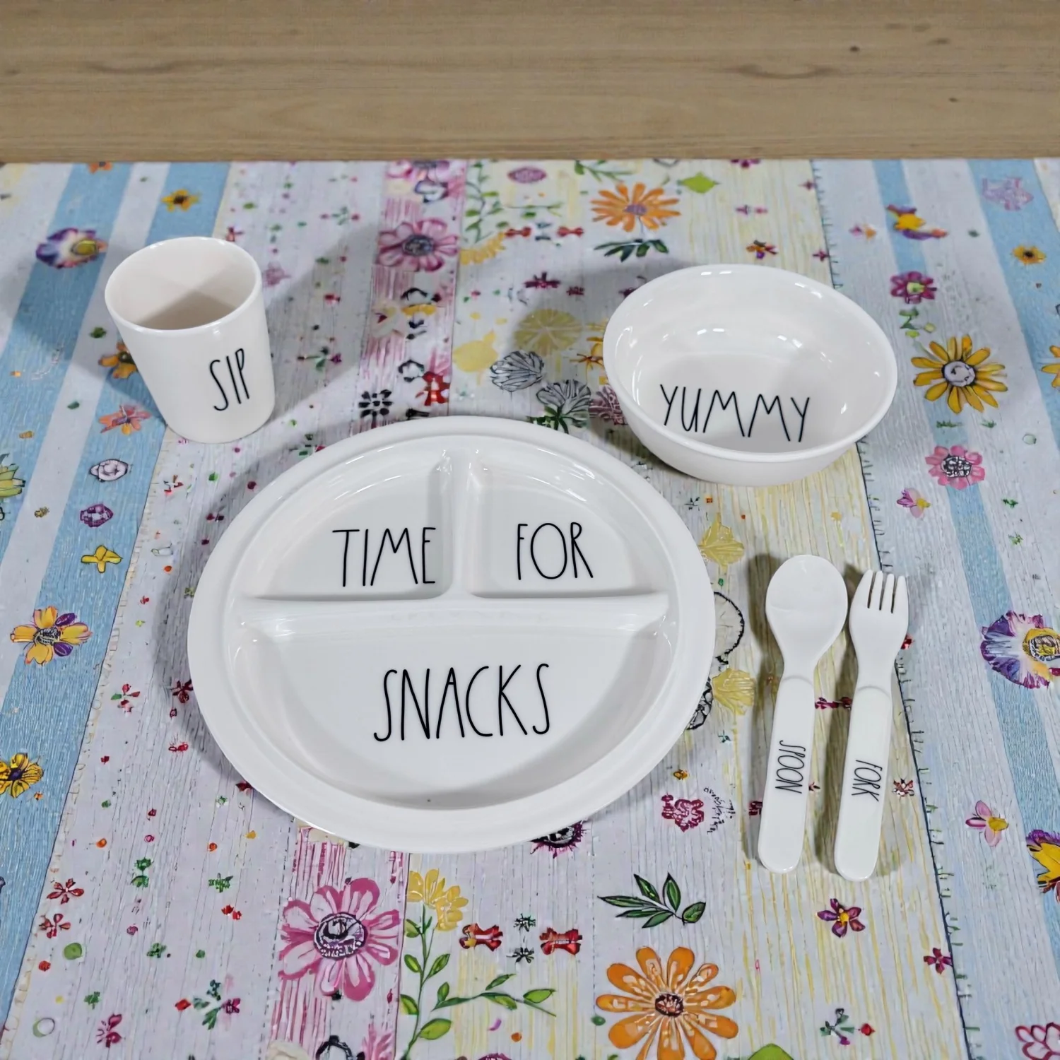 Rae Dunn 5 Piece Melamine Toddler Snack Feeding Set Divided Dish Bowl Cup Fork