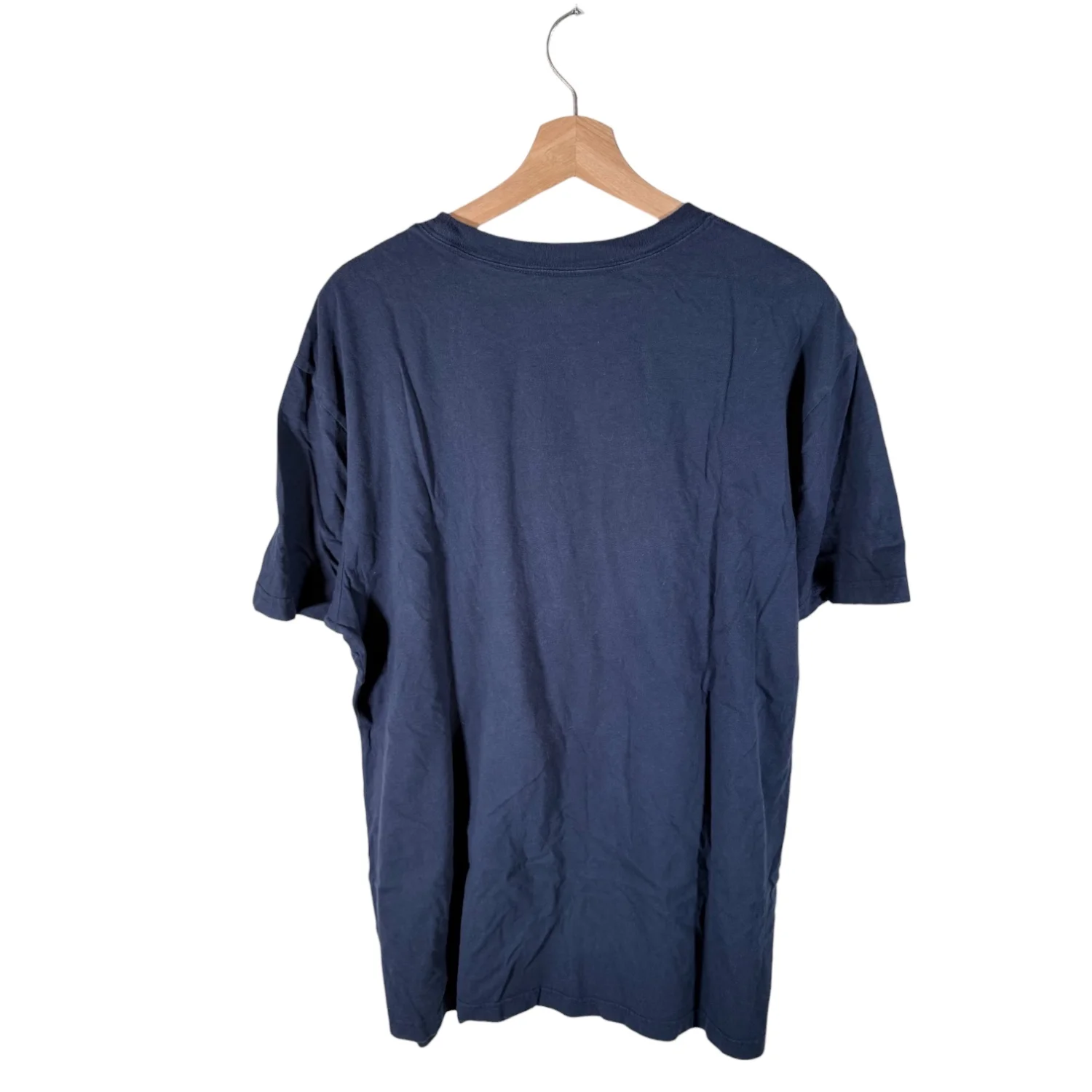 Very nice cotton shirt in navy blue with velvety textured graphics on the front. Excellent preowned condition with mild wear. See pictures for details. Measurements armpit to armpit 25" length 29.75" Keywords: basic, casual, outdoors, school, everyday, nature, summer, layering P20260025 4